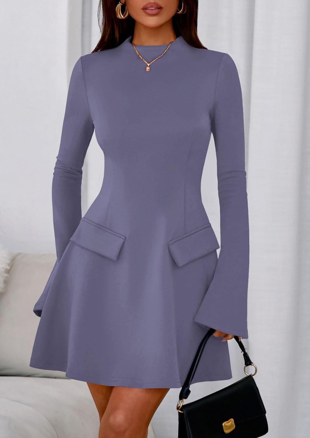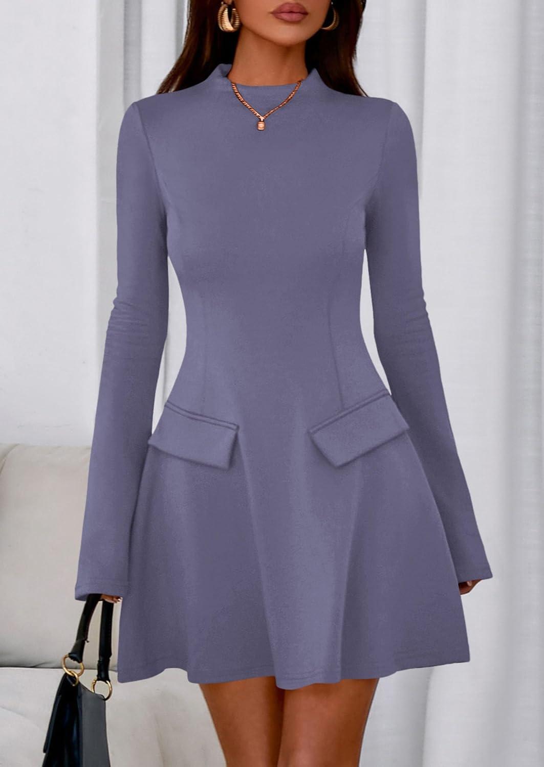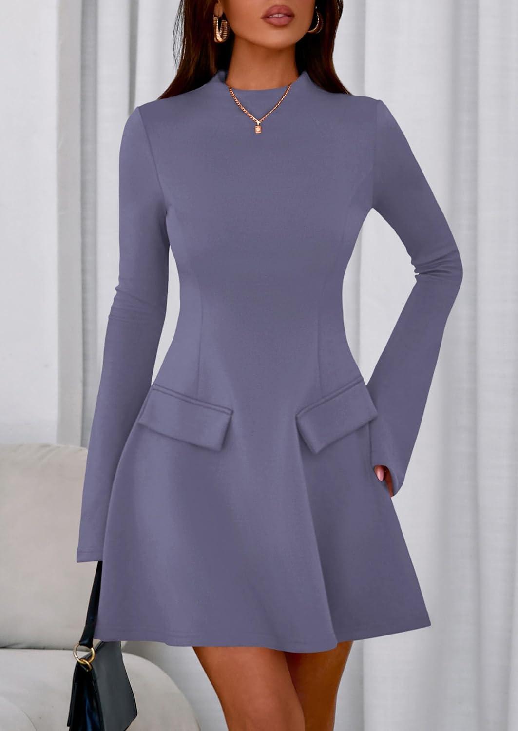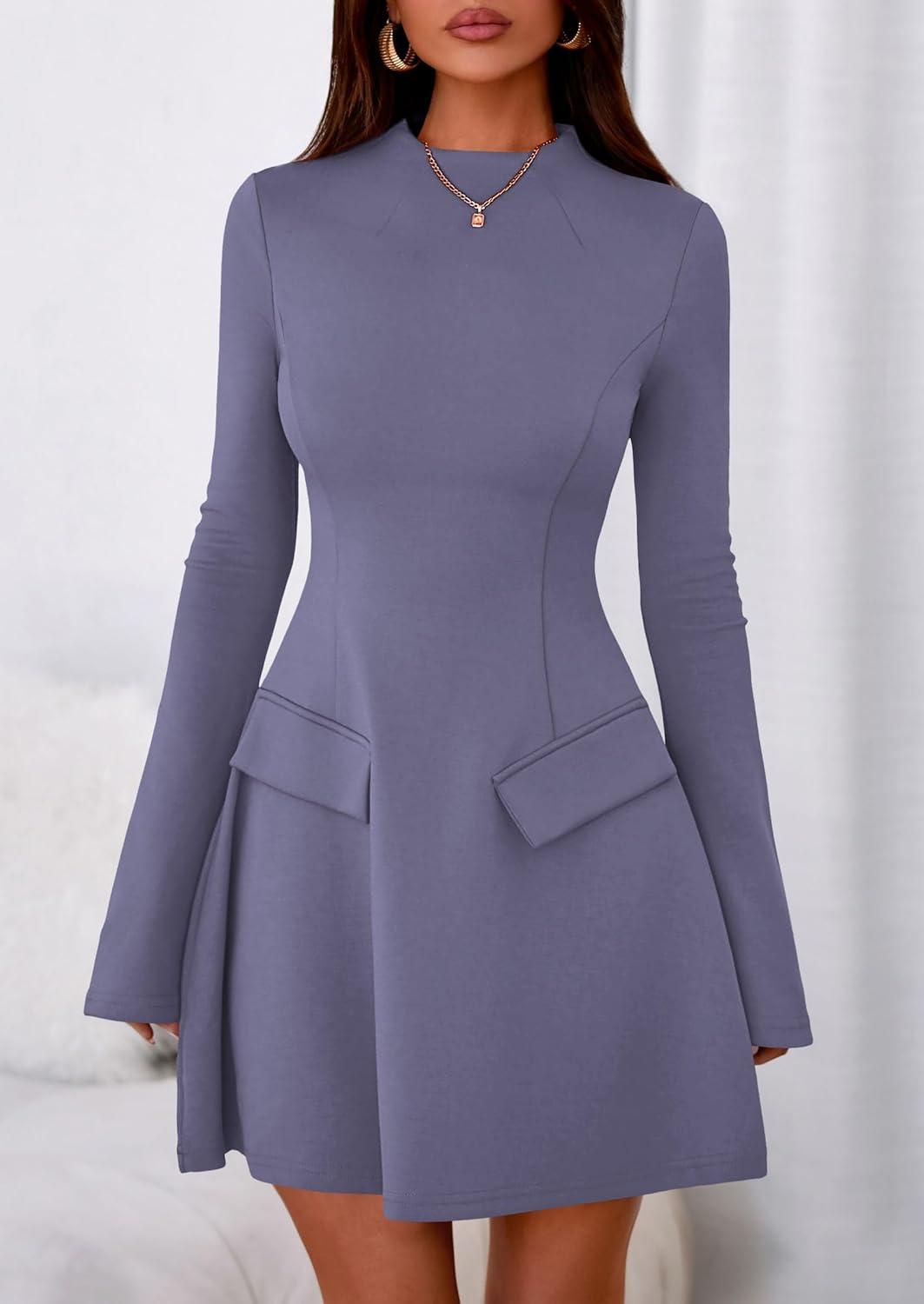 PRETTYGARDEN Women’s Long Sleeve Mini Dress 2025 Fall Bodycon Mock Neck Elegant Business Work Party Short Dresses(Grey Blue)