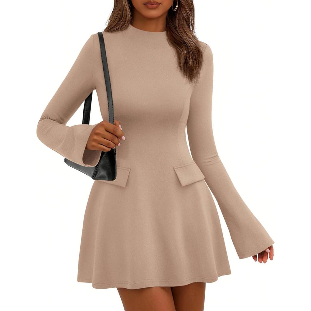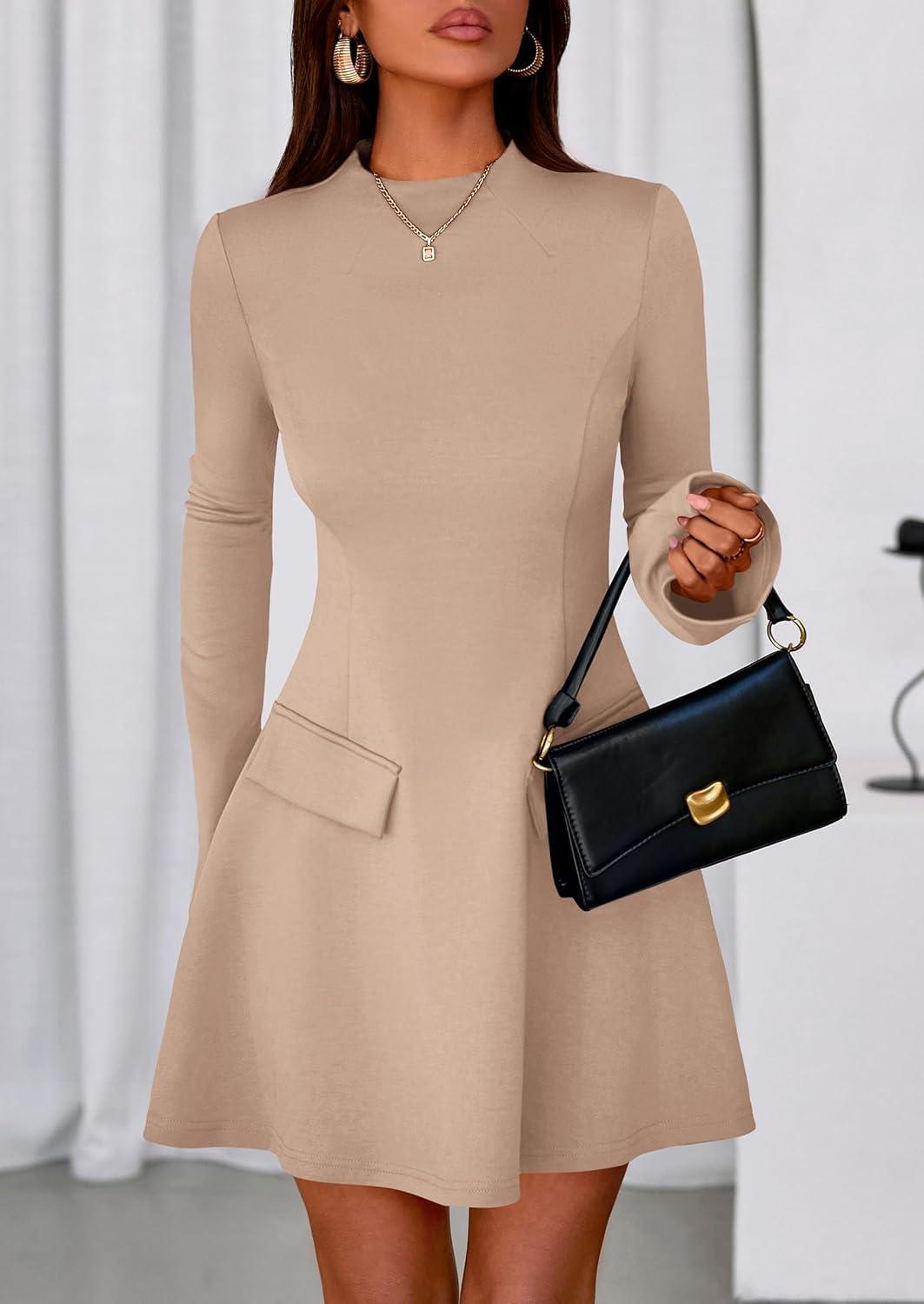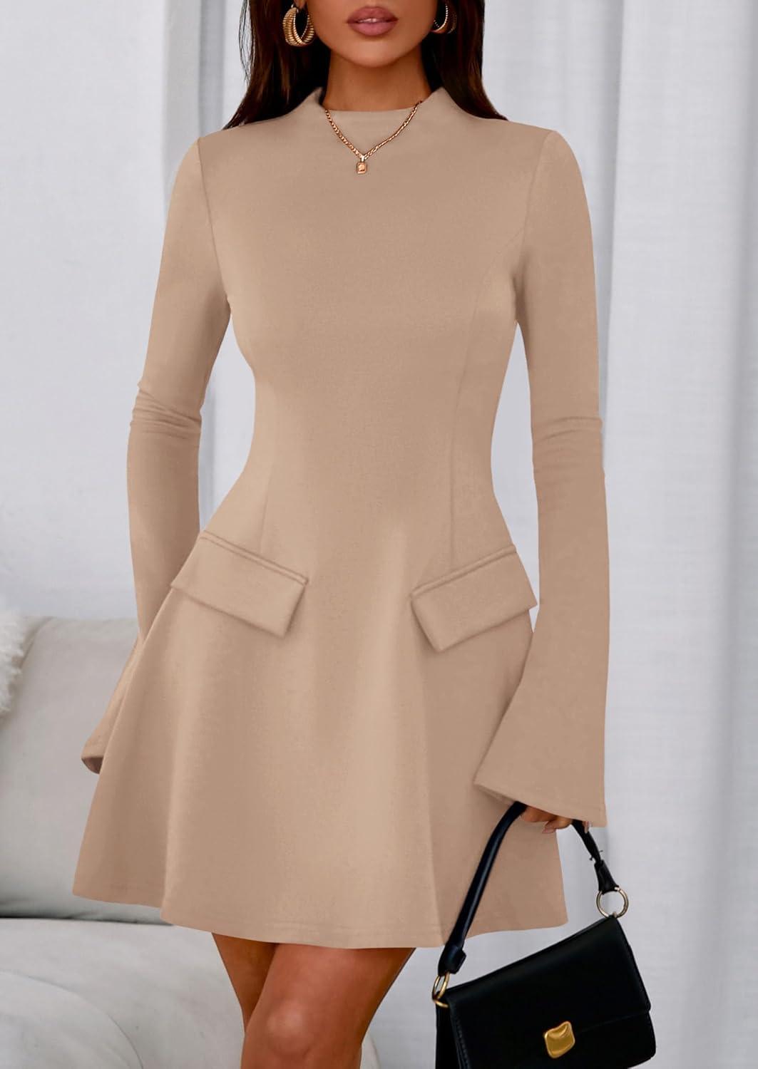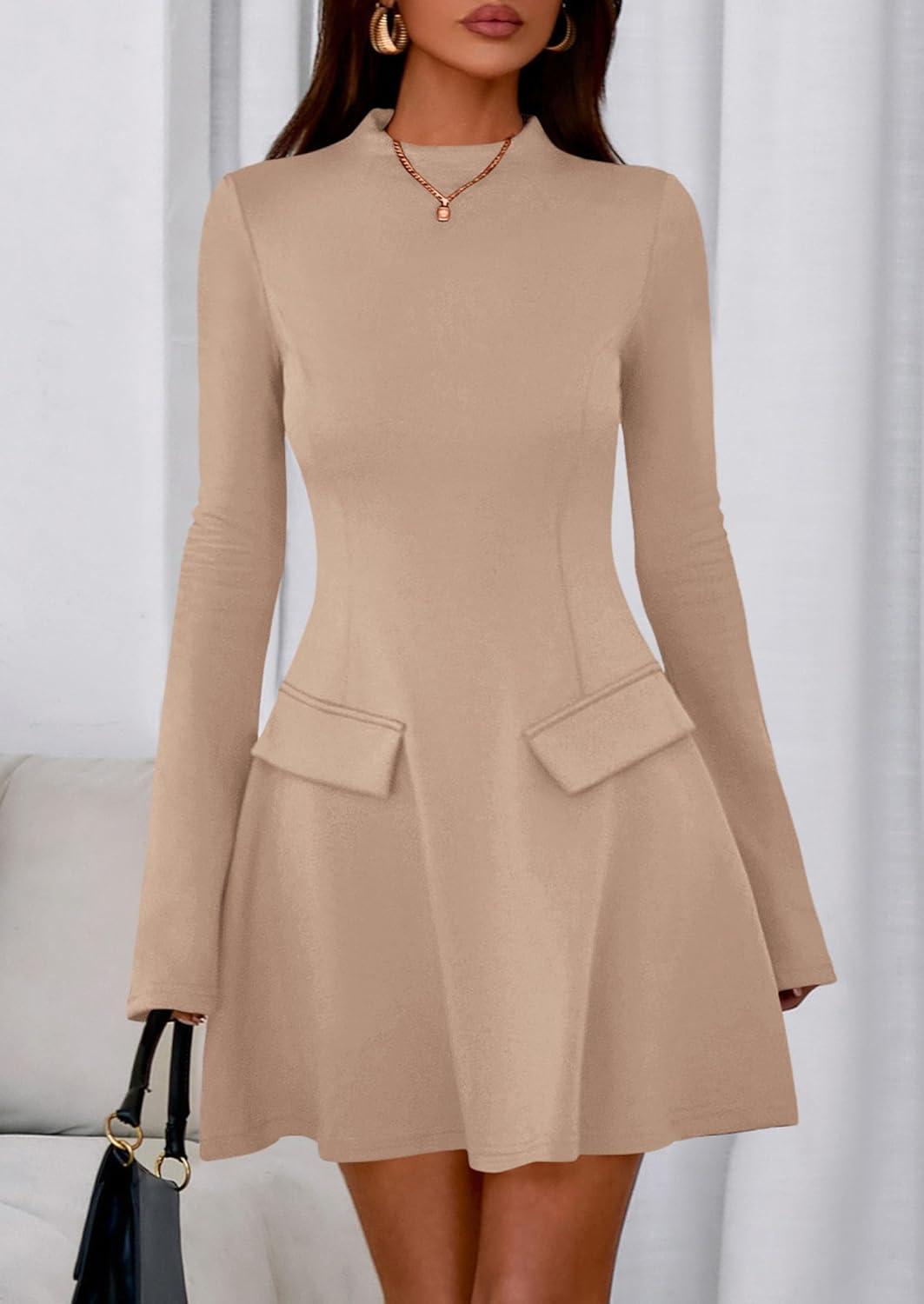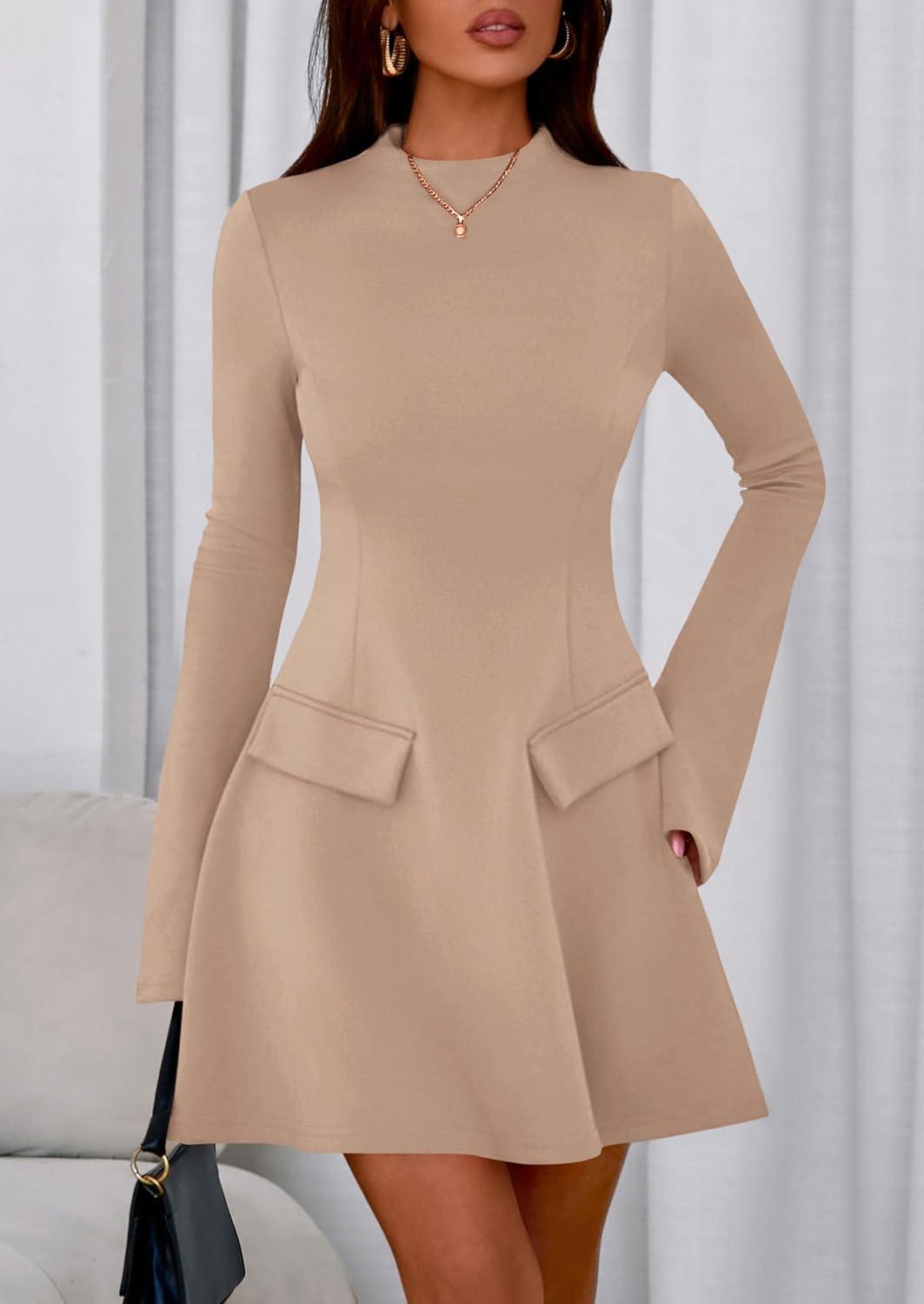 PRETTYGARDEN Women's Long Sleeve Mini Dress 2025 Fall Bodycon Mock Neck Elegant Business Work Party Short Dresses(Khaki)