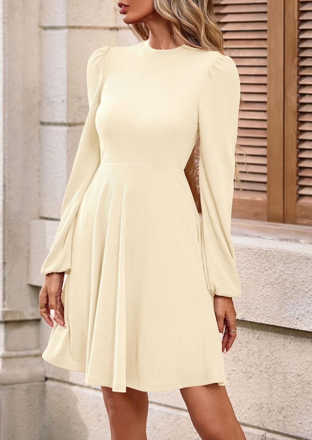 PRETTYGARDEN Womens Long Sleeve Mini Dress 2025 Fall Trendy Crewneck Ribbed Knit Soft A Line Flowy Summer Formal Dresses(Beige)