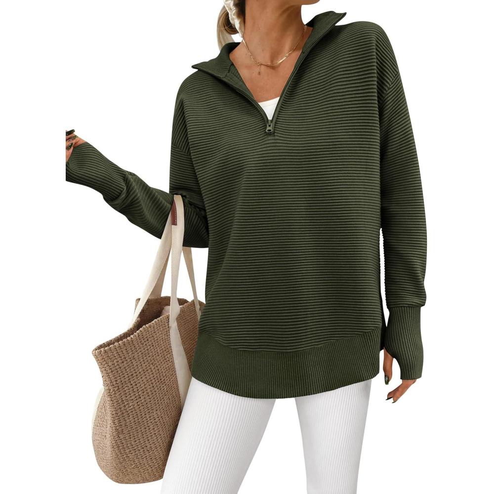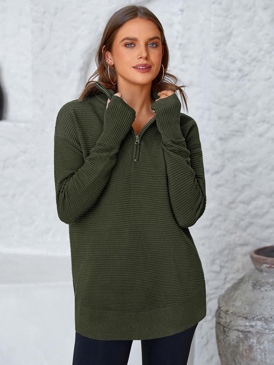 PRETTYGARDEN Womens Long Sleeve Quarter Zip Pullover Sweater Casual Loose V Neck Collared Ribbed Knit Jumper Tops Thumb Hole(Army Green)