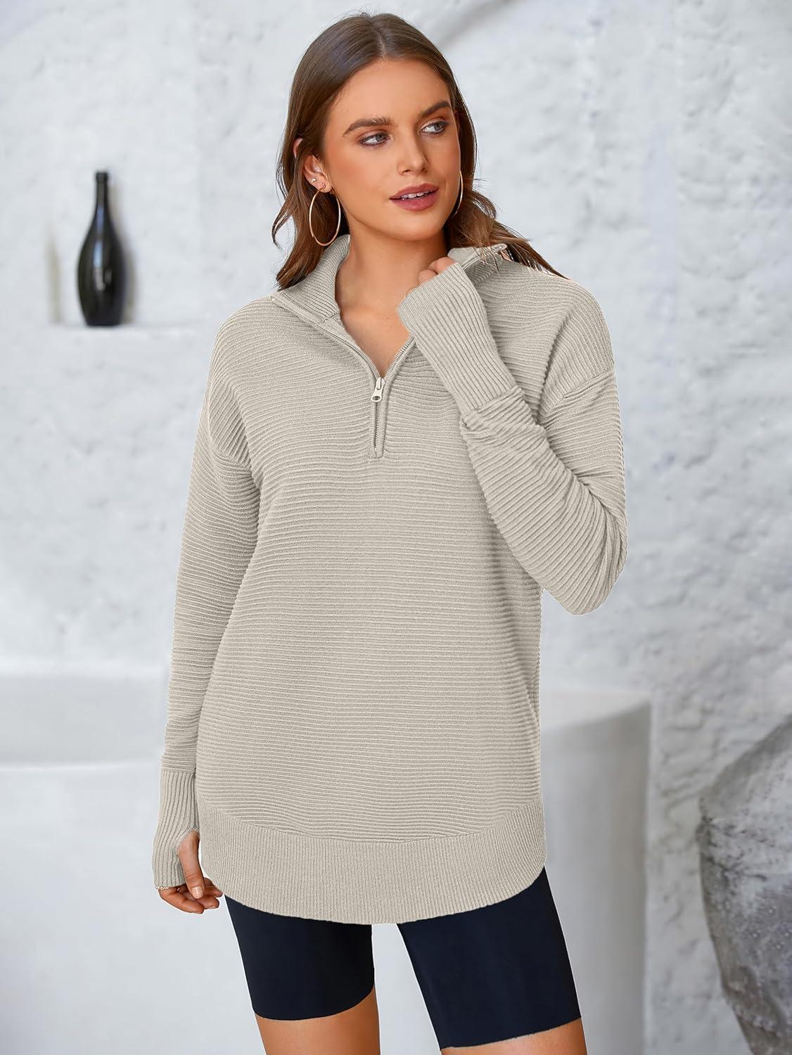 PRETTYGARDEN Womens Long Sleeve Quarter Zip Pullover Sweater Casual Loose V Neck Collared Ribbed Knit Jumper Tops Thumb Hole(Light Khaki)