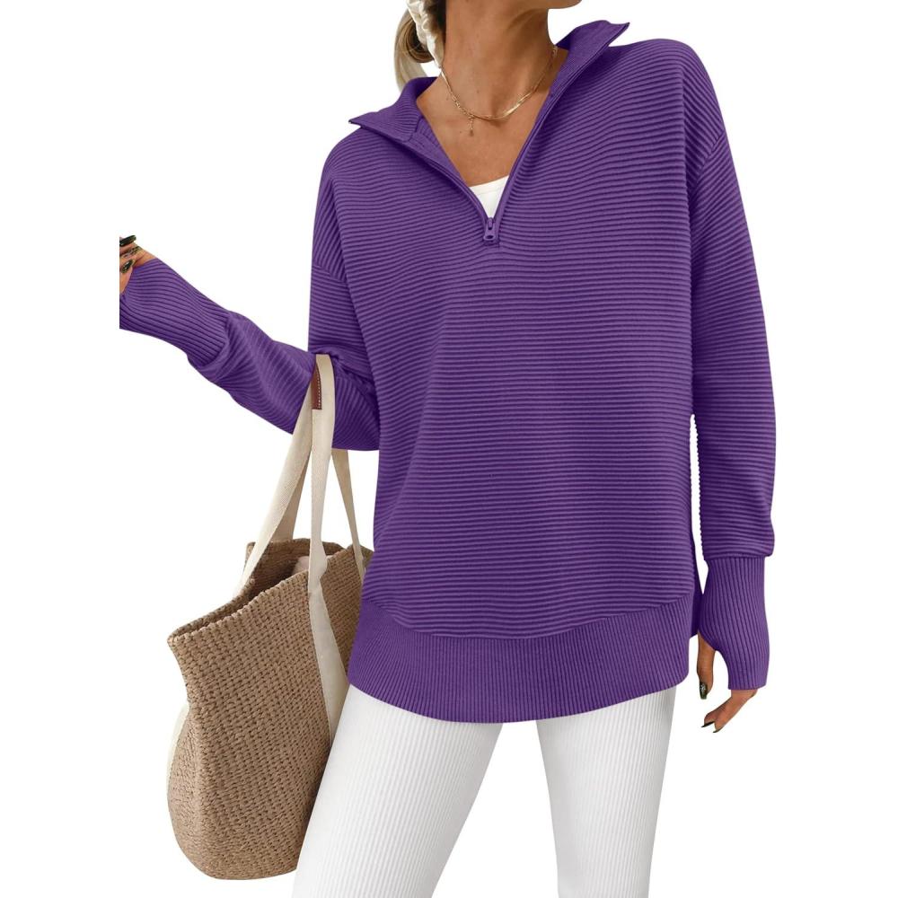 PRETTYGARDEN Womens Long Sleeve Quarter Zip Pullover Sweater Casual Loose V Neck Collared Ribbed Knit Jumper Tops Thumb Hole(Purple)