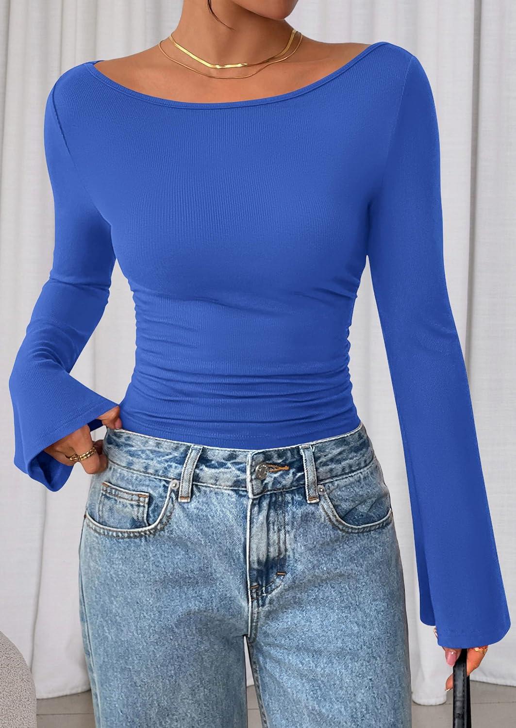 PRETTYGARDEN Women's Long Sleeve Shirts 2025 Fall Crop Going Out Tops Casual Boat Neck Bell Sleeve Ribbed Ruched Y2K Clothes(Blue)