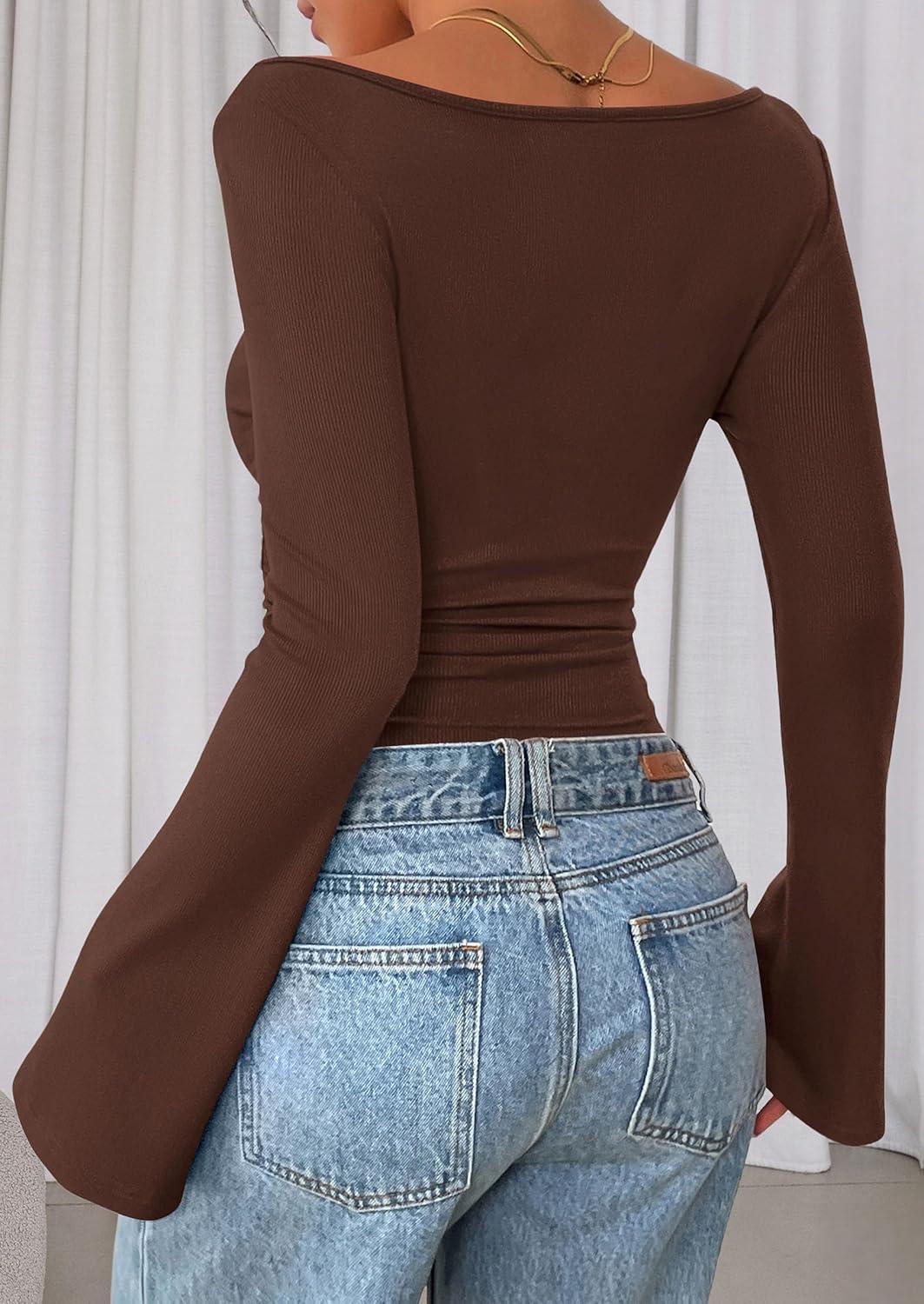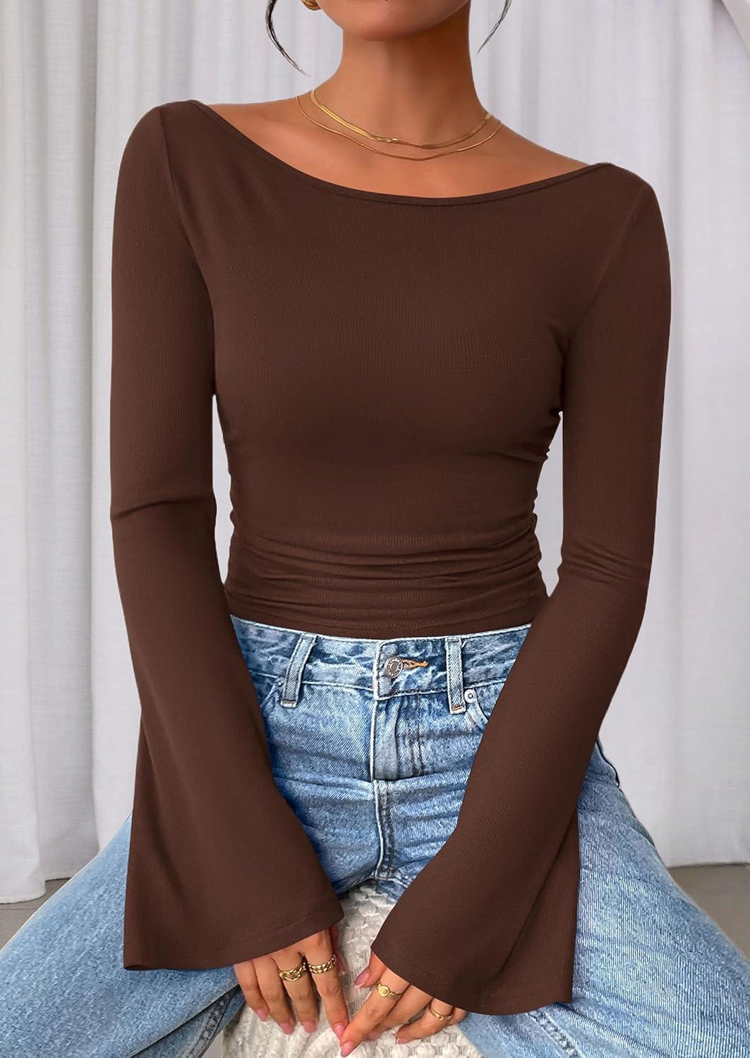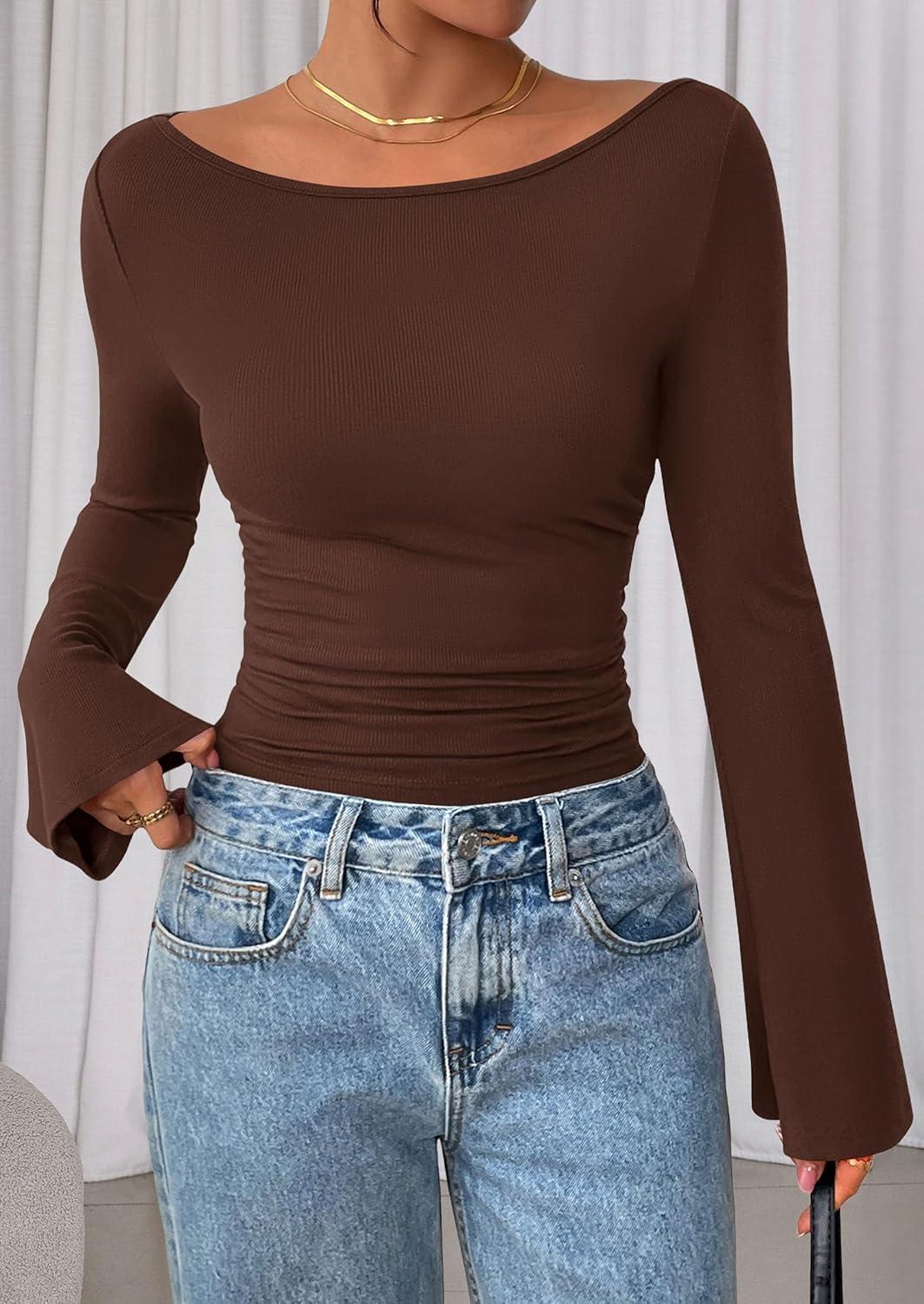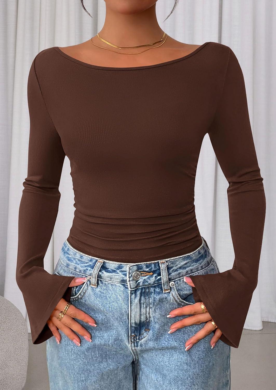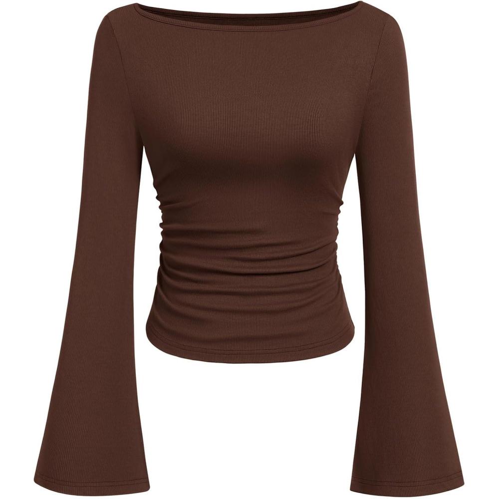 PRETTYGARDEN Women's Long Sleeve Shirts 2025 Fall Crop Going Out Tops Casual Boat Neck Bell Sleeve Ribbed Ruched Y2K Clothes(Brown)
