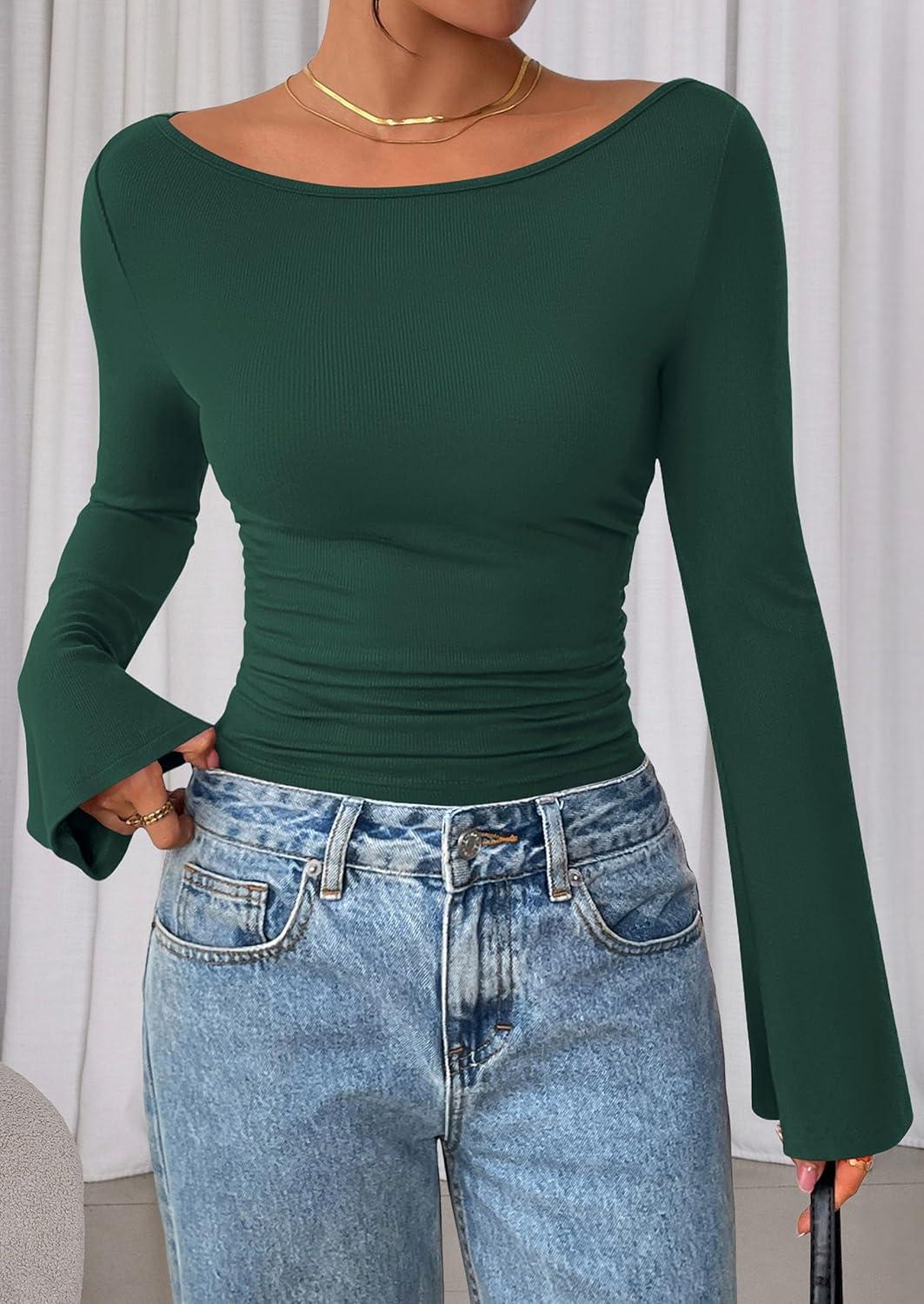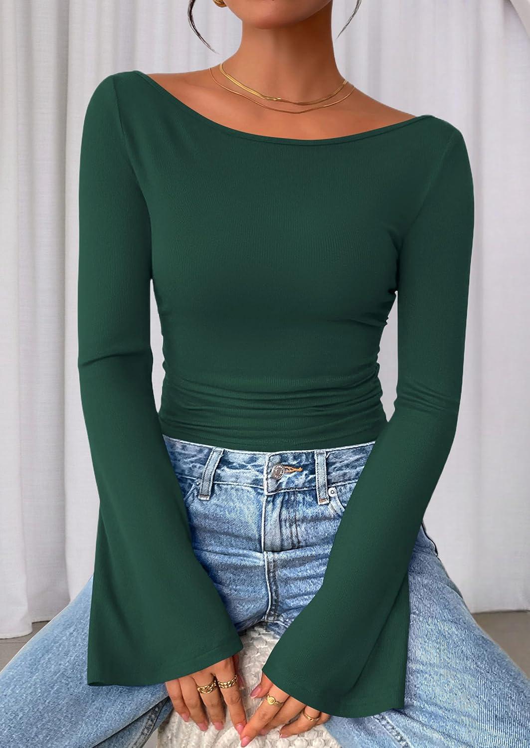 PRETTYGARDEN Women's Long Sleeve Shirts 2025 Fall Crop Going Out Tops Casual Boat Neck Bell Sleeve Ribbed Ruched Y2K Clothes(Dark Green)