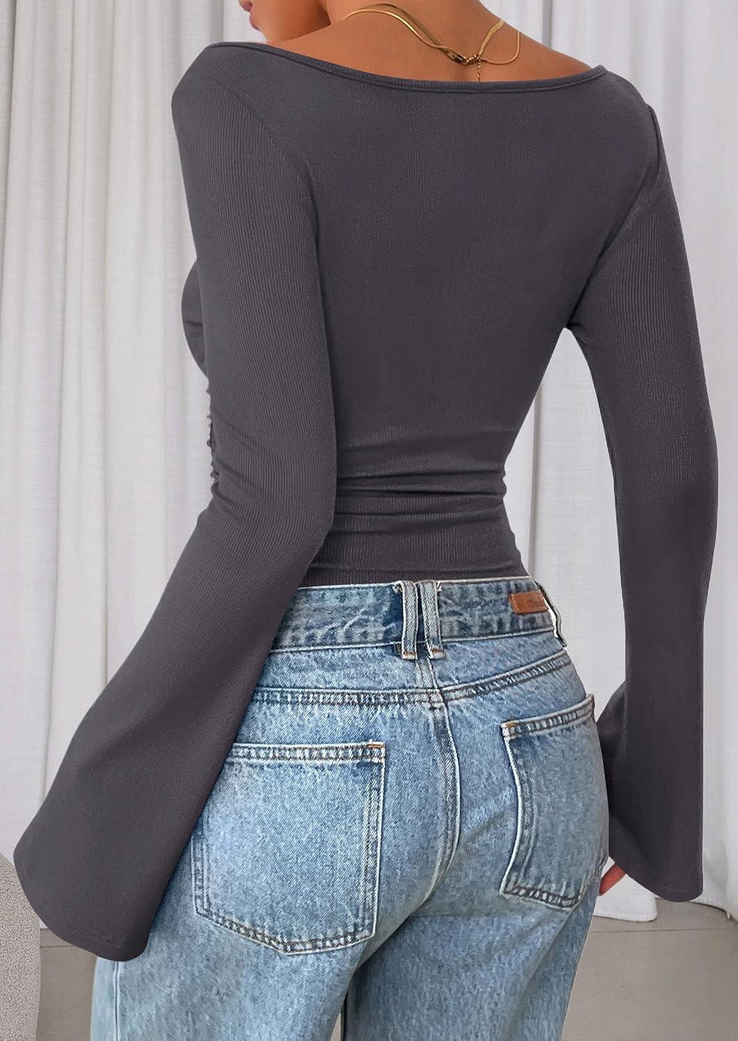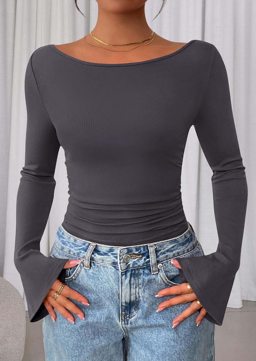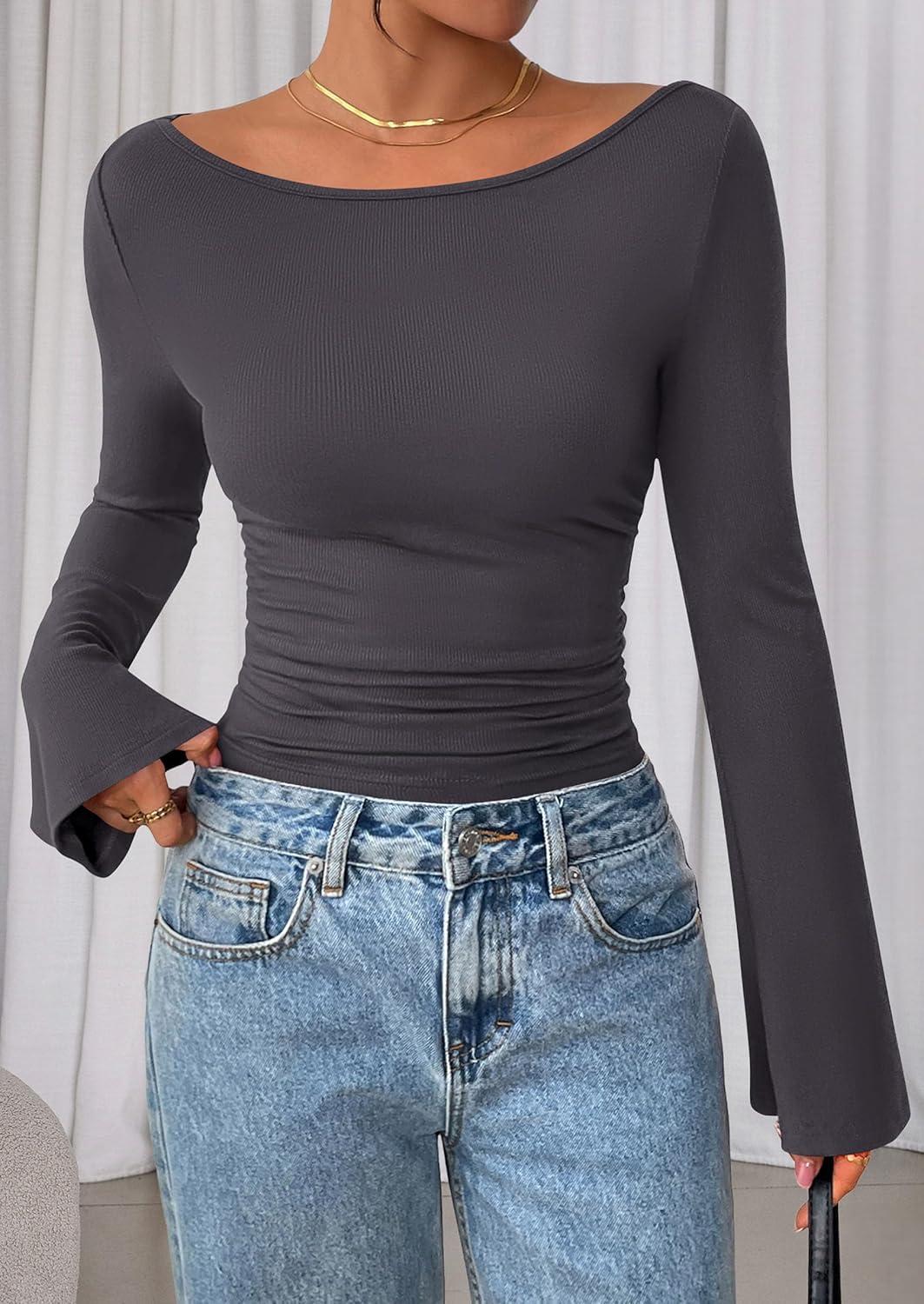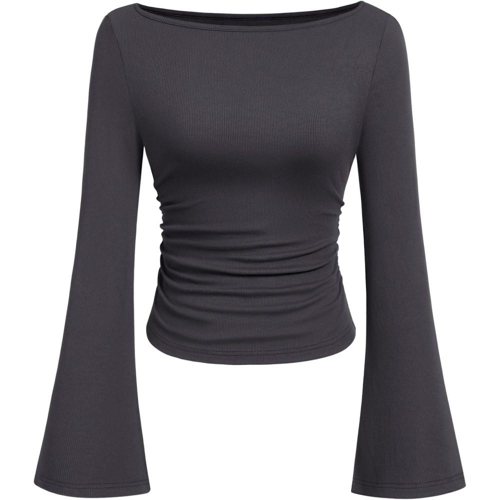 PRETTYGARDEN Women's Long Sleeve Shirts 2025 Fall Crop Going Out Tops Casual Boat Neck Bell Sleeve Ribbed Ruched Y2K Clothes(Dark Grey)
