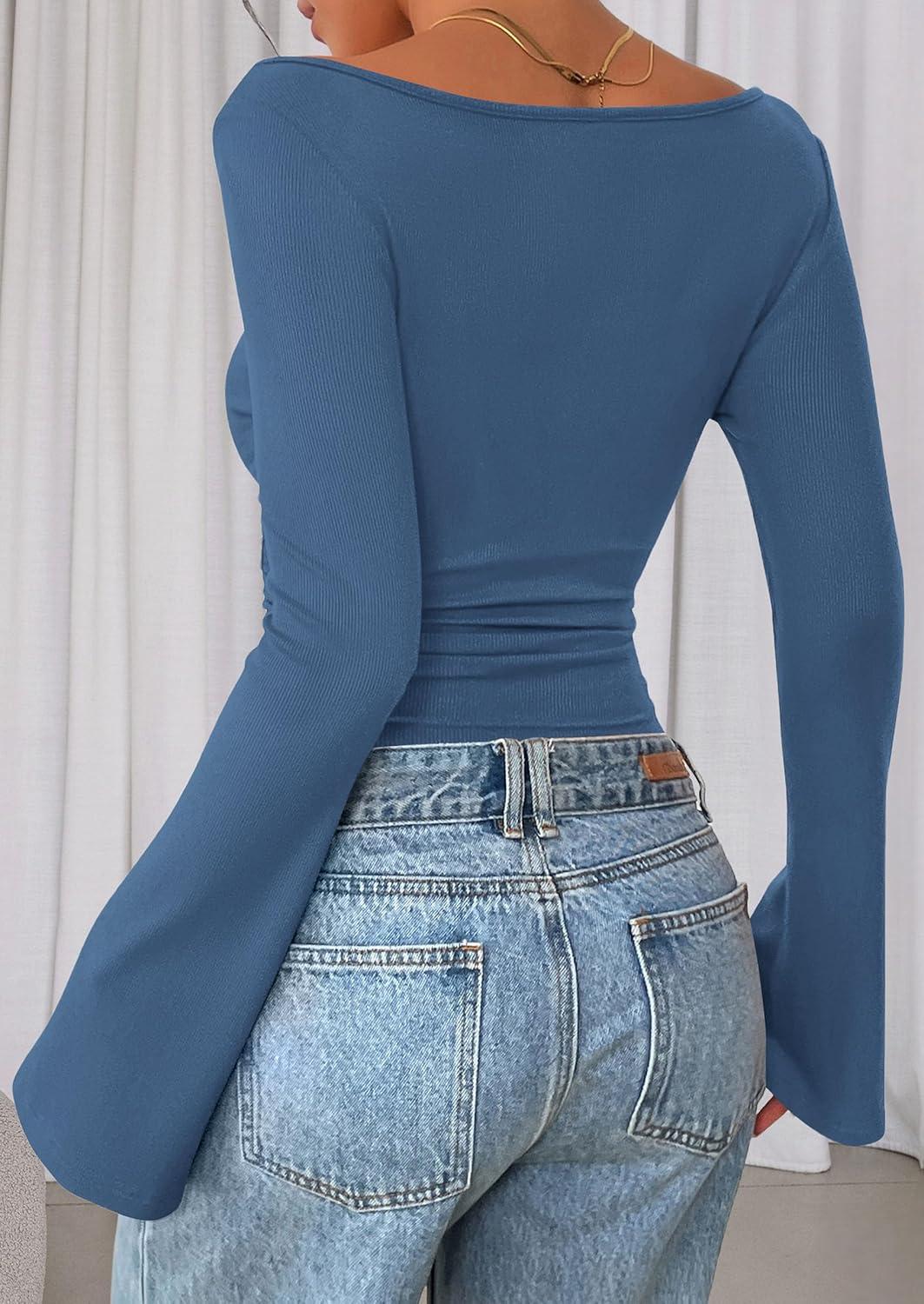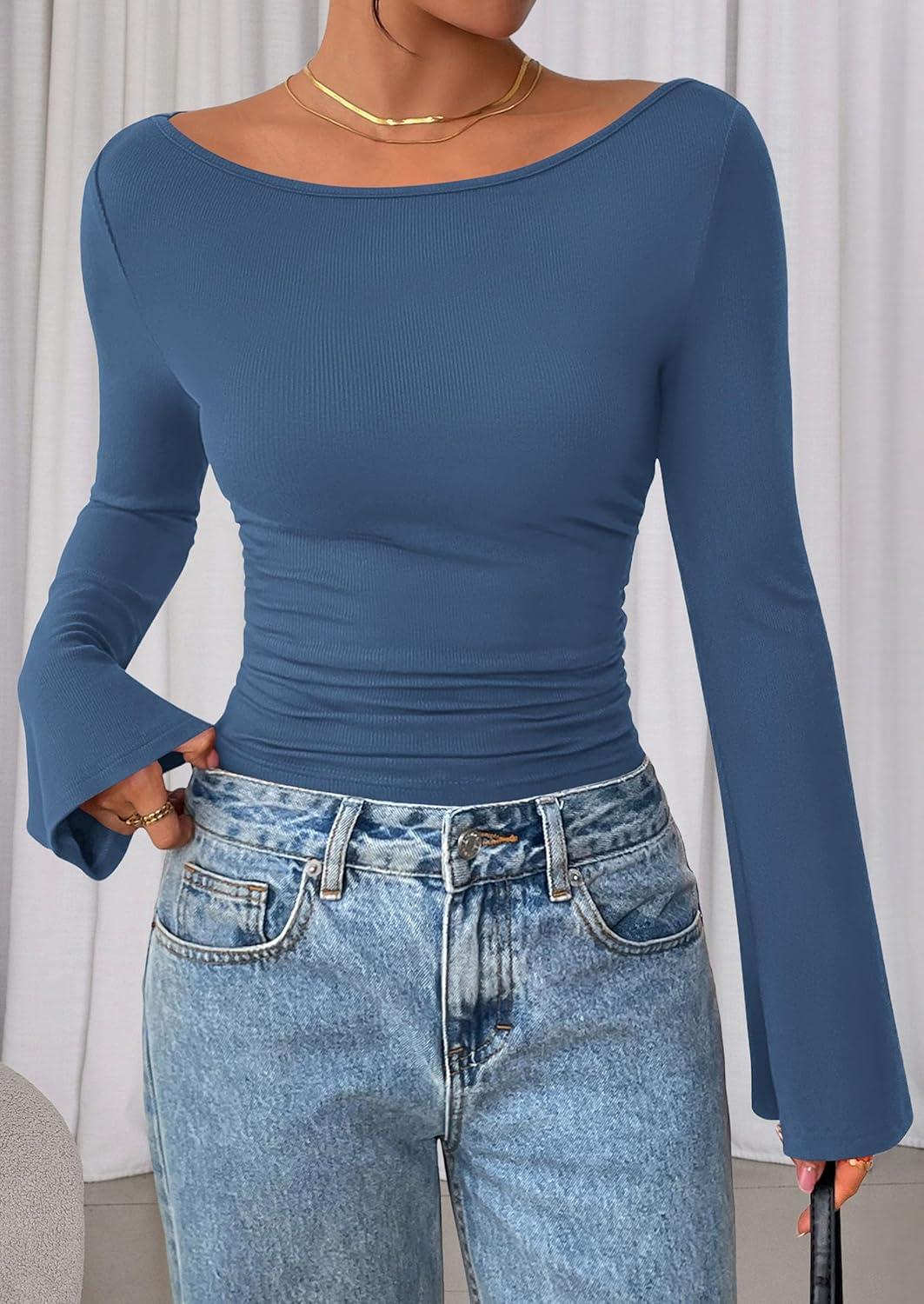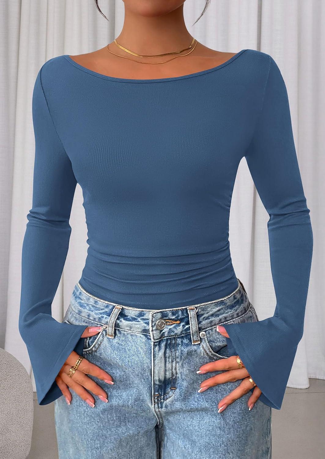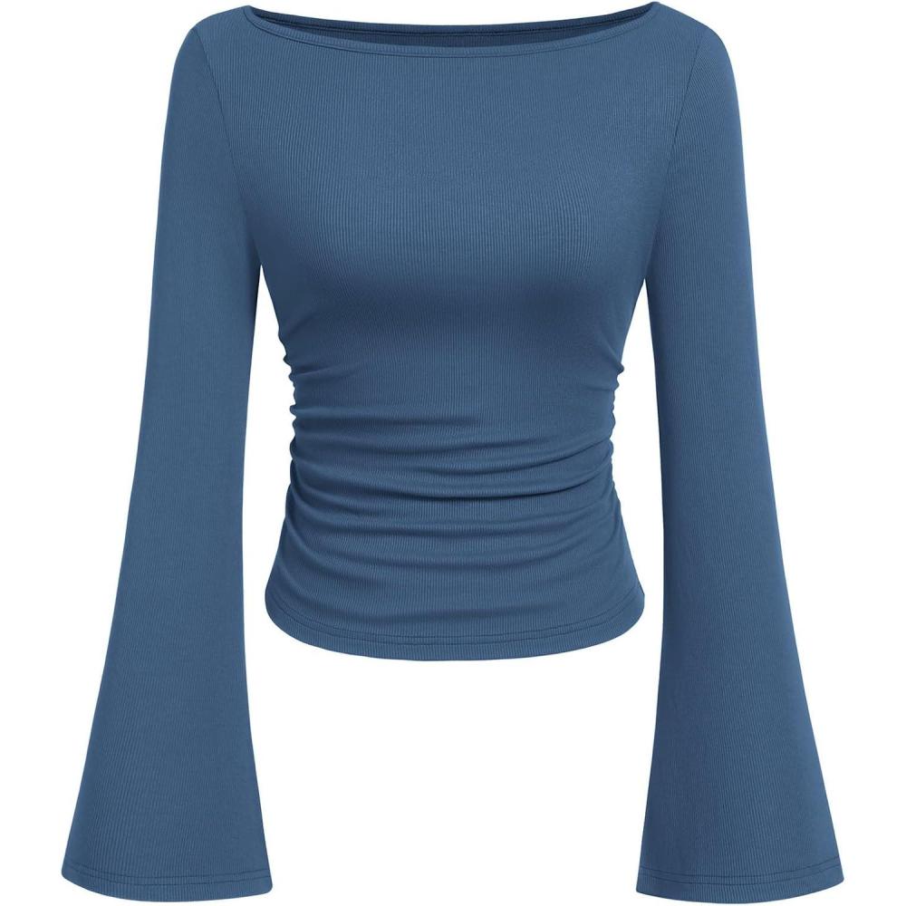 PRETTYGARDEN Women’s Long Sleeve Shirts 2025 Fall Crop Going Out Tops Casual Boat Neck Bell Sleeve Ribbed Ruched Y2K Clothes(Grey Blue)