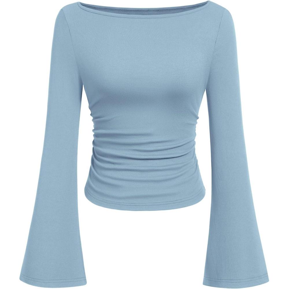 PRETTYGARDEN Women's Long Sleeve Shirts 2025 Fall Crop Going Out Tops Casual Boat Neck Bell Sleeve Ribbed Ruched Y2K Clothes(Light Blue)
