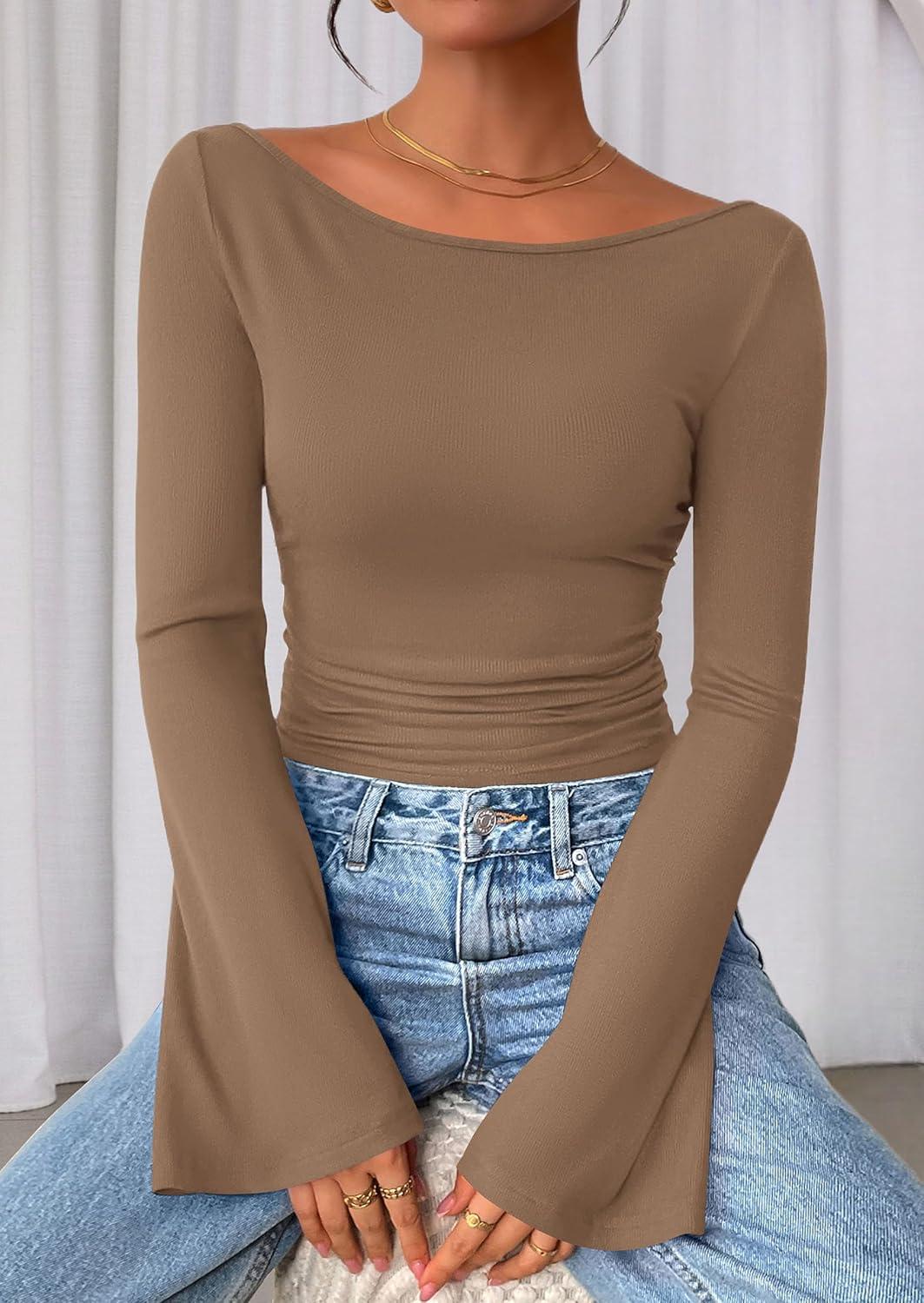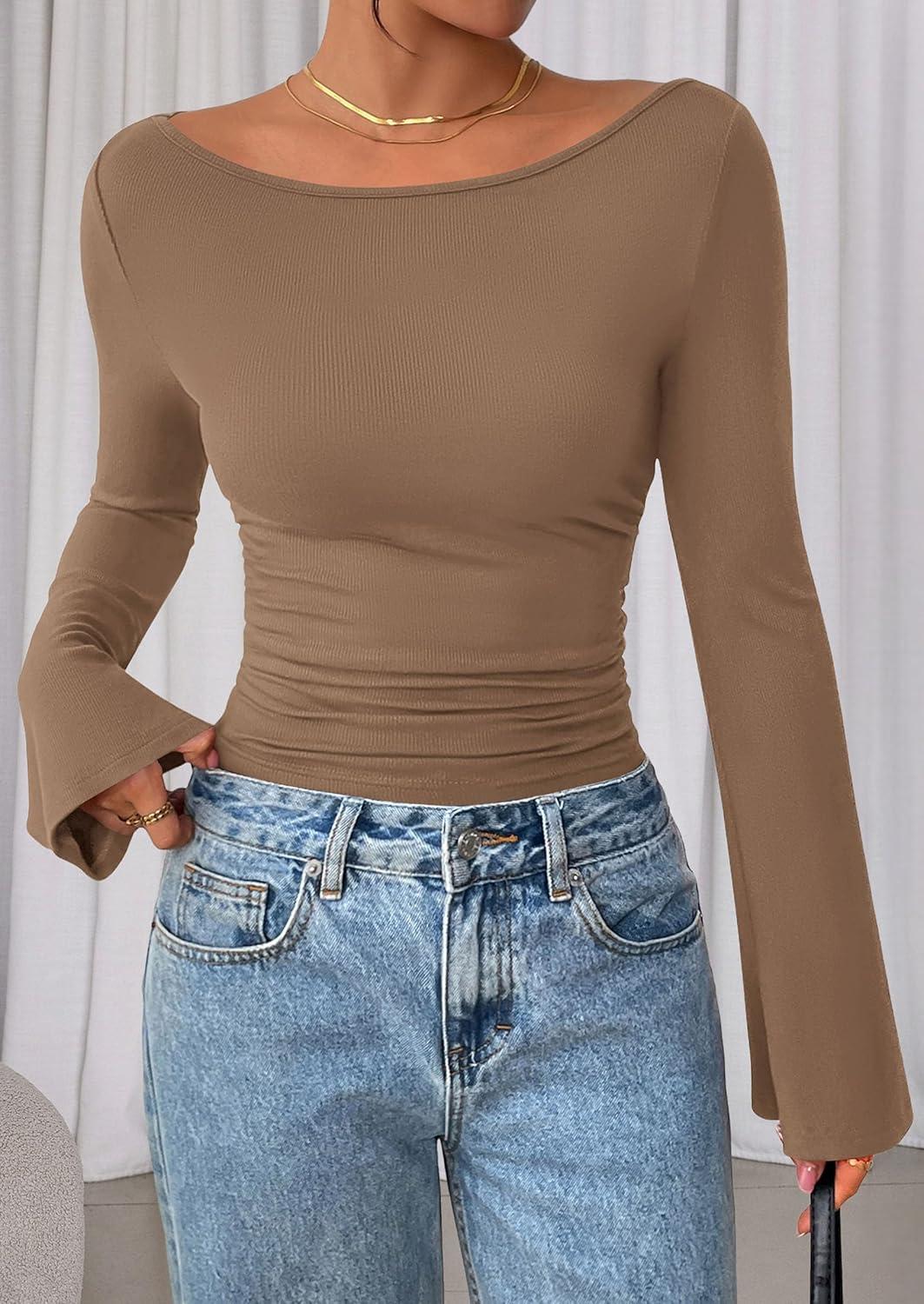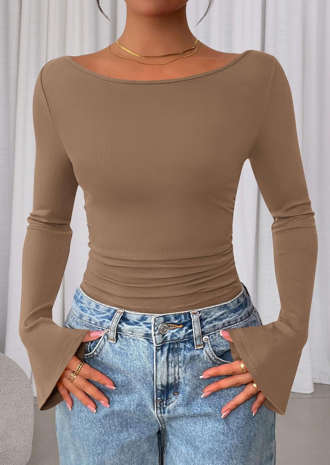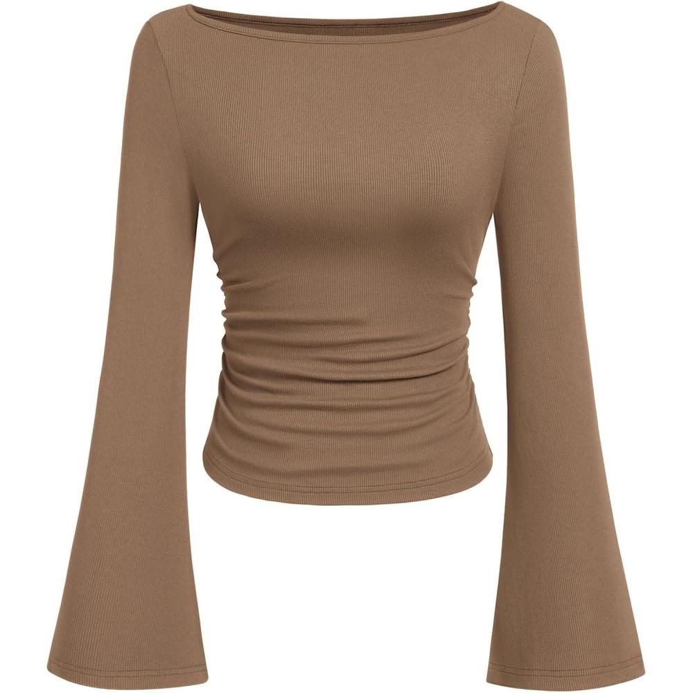 PRETTYGARDEN Women's Long Sleeve Shirts 2025 Fall Crop Going Out Tops Casual Boat Neck Bell Sleeve Ribbed Ruched Y2K Clothes(Light Brown)