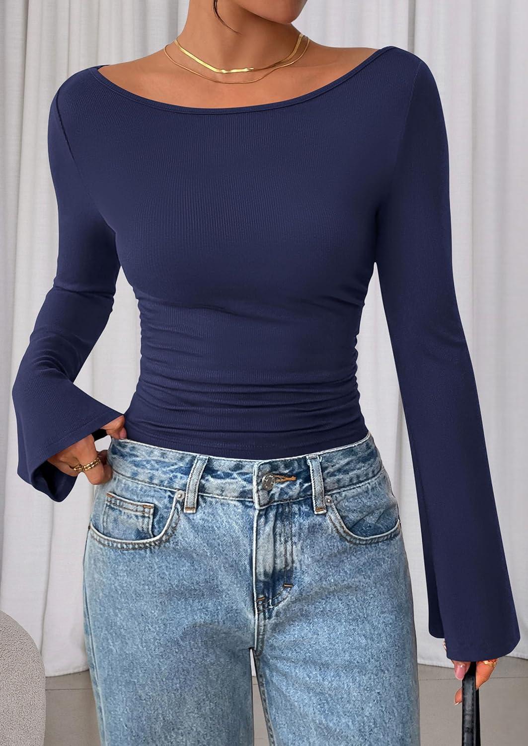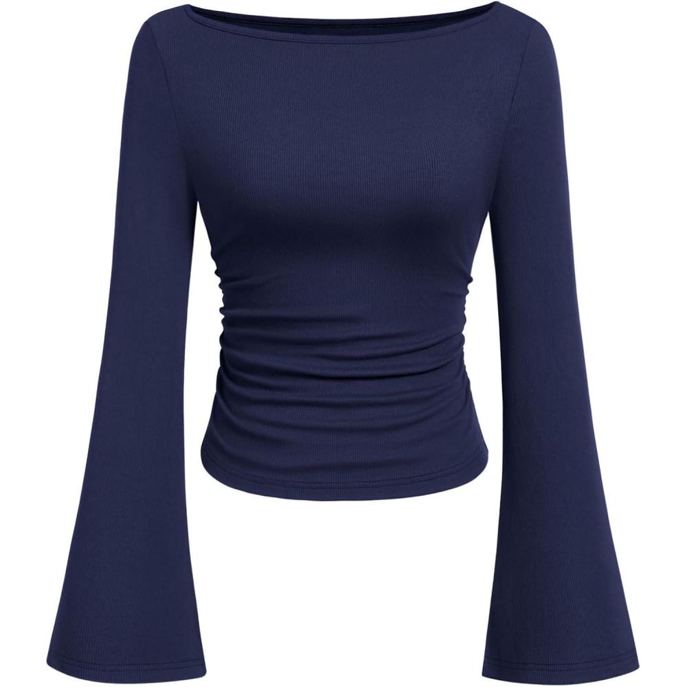 PRETTYGARDEN Women's Long Sleeve Shirts 2025 Fall Crop Going Out Tops Casual Boat Neck Bell Sleeve Ribbed Ruched Y2K Clothes(Navy Blue)