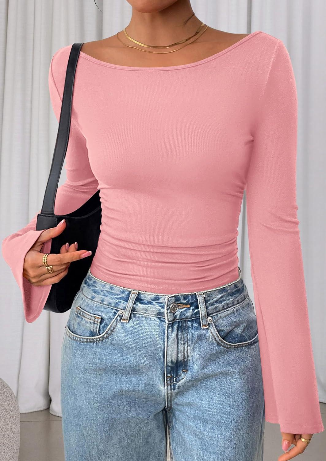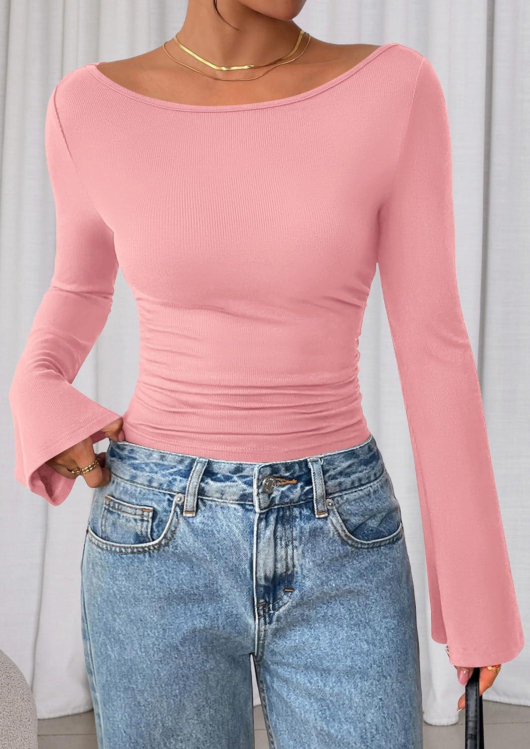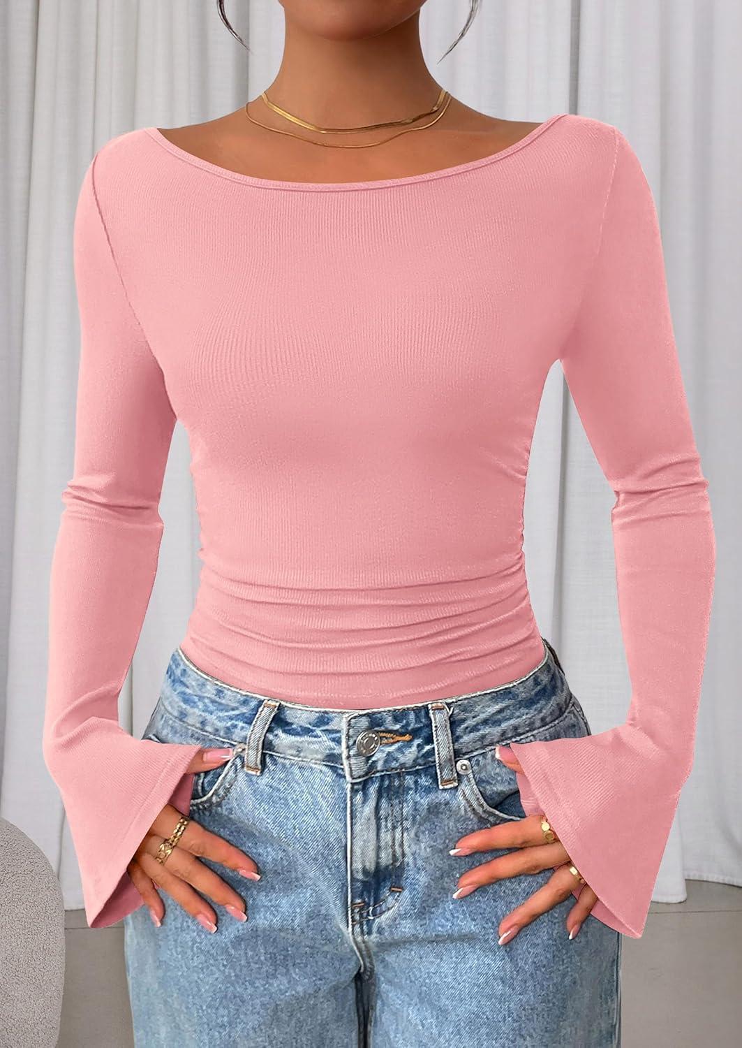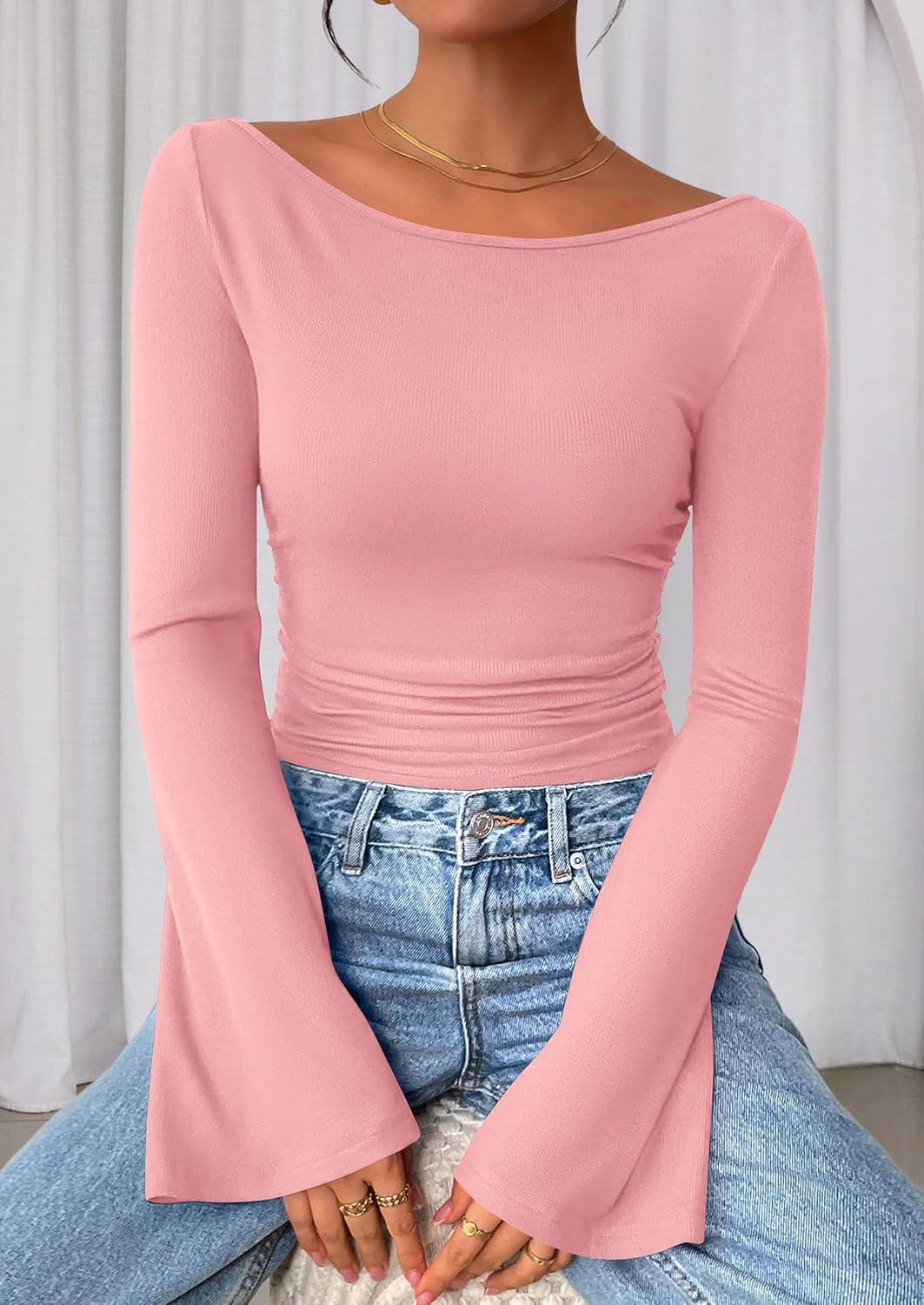 PRETTYGARDEN Women's Long Sleeve Shirts 2025 Fall Crop Going Out Tops Casual Boat Neck Bell Sleeve Ribbed Ruched Y2K Clothes(Pink)