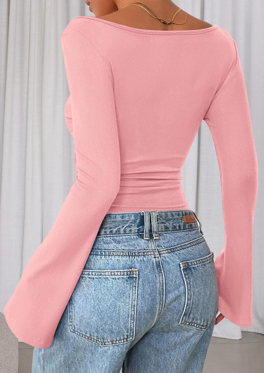 PRETTYGARDEN Women’s Long Sleeve Shirts 2025 Fall Crop Going Out Tops Casual Boat Neck Bell Sleeve Ribbed Ruched Y2K Clothes(Pink)