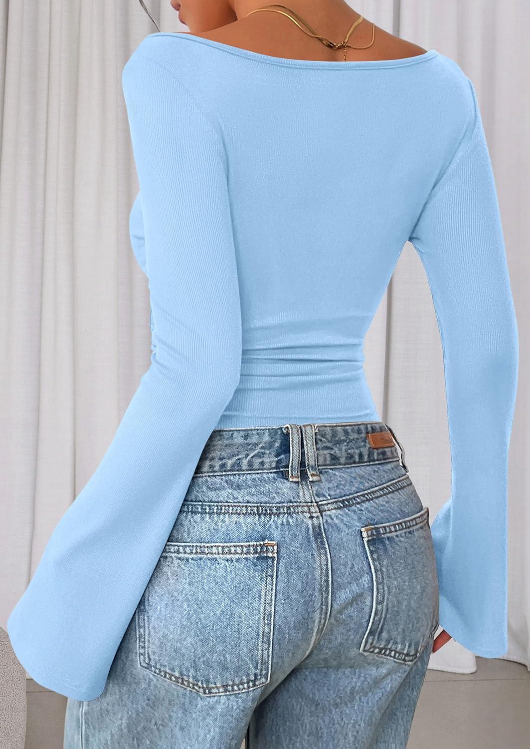 PRETTYGARDEN Women's Long Sleeve Shirts 2025 Fall Crop Going Out Tops Casual Boat Neck Bell Sleeve Ribbed Ruched Y2K Clothes(Sky Blue)