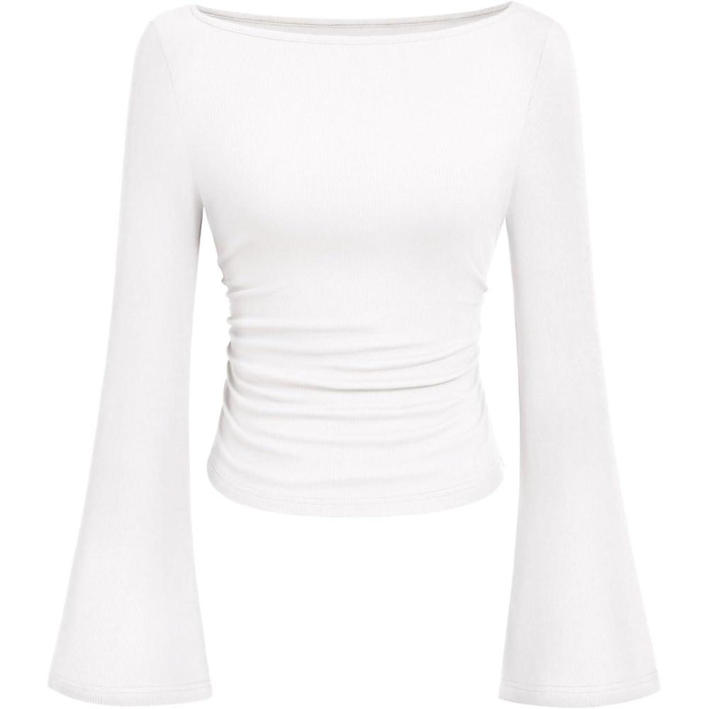 PRETTYGARDEN Women's Long Sleeve Shirts 2025 Fall Crop Going Out Tops Casual Boat Neck Bell Sleeve Ribbed Ruched Y2K Clothes(White)