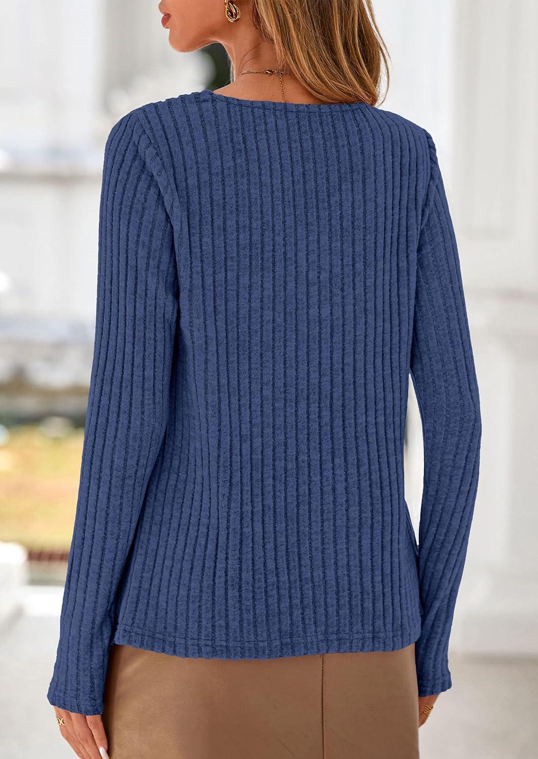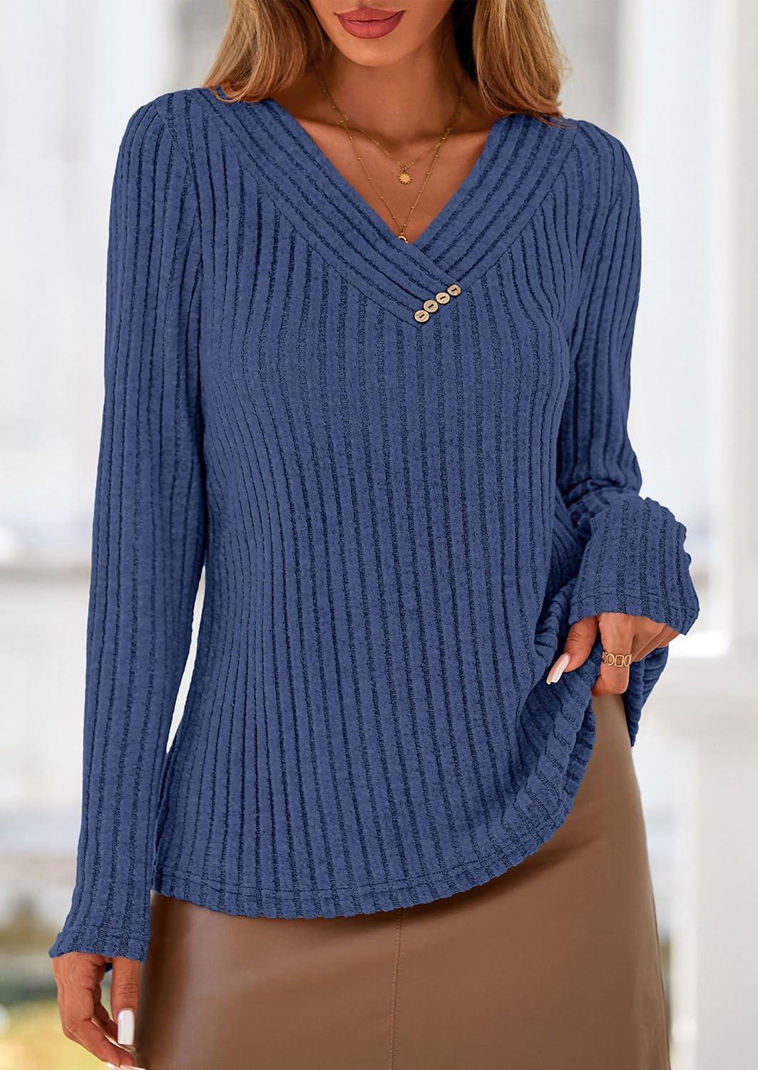 PRETTYGARDEN Women's Long Sleeve Shirts 2025 Fall Fashion Clothes Casual Ribbed V Neck Loose Tunic Tops Lightweight Sweaters(Dark Blue)