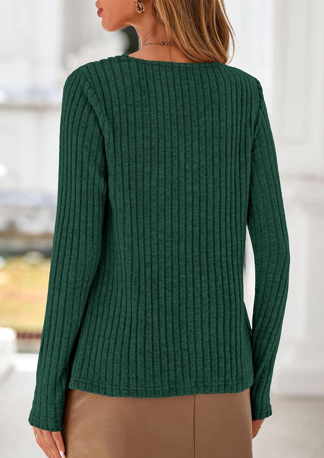 PRETTYGARDEN Women’s Long Sleeve Shirts 2025 Fall Fashion Clothes Casual Ribbed V Neck Loose Tunic Tops Lightweight Sweaters(Dark Green)
