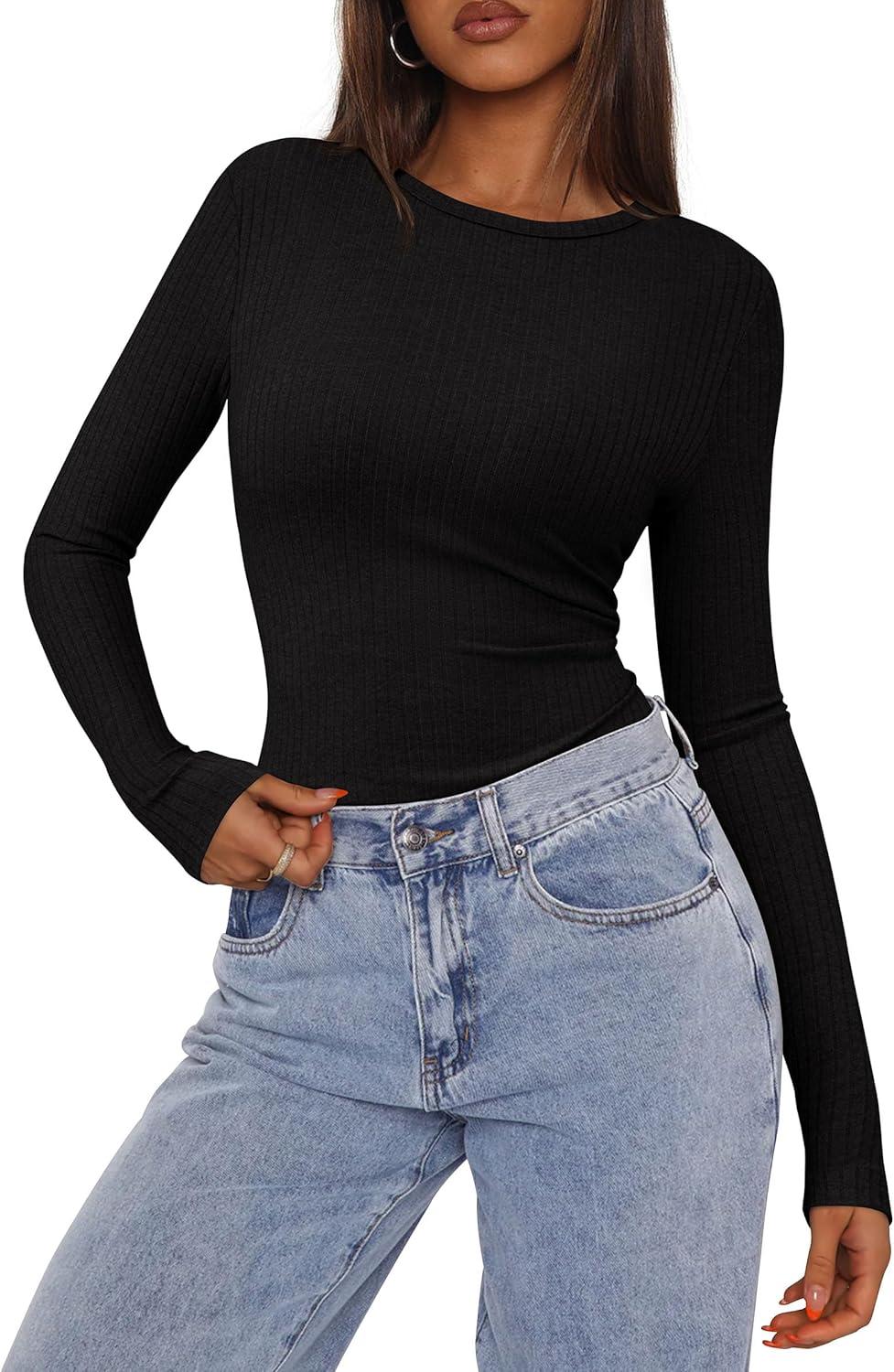 PRETTYGARDEN Womens Long Sleeve Shirts 2025 Ribbed Knit Slim Fitted Basic Tee Casual Going Out Tops Underscrubs Fall Clothing(Black)
