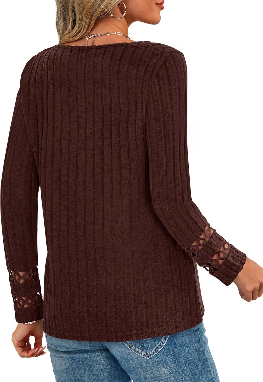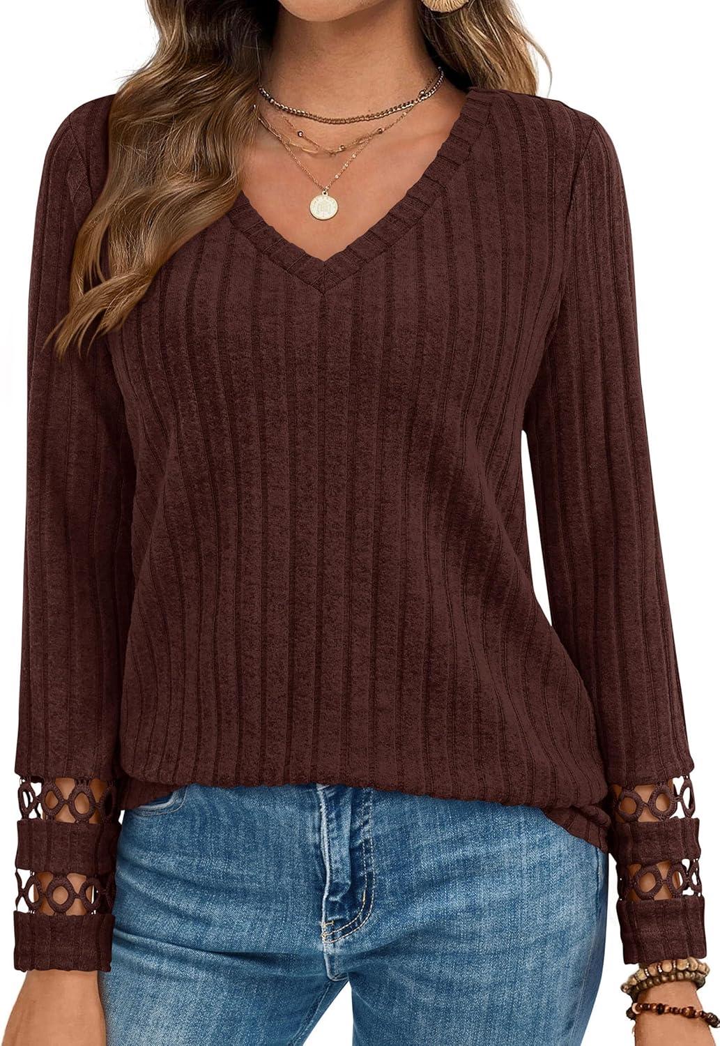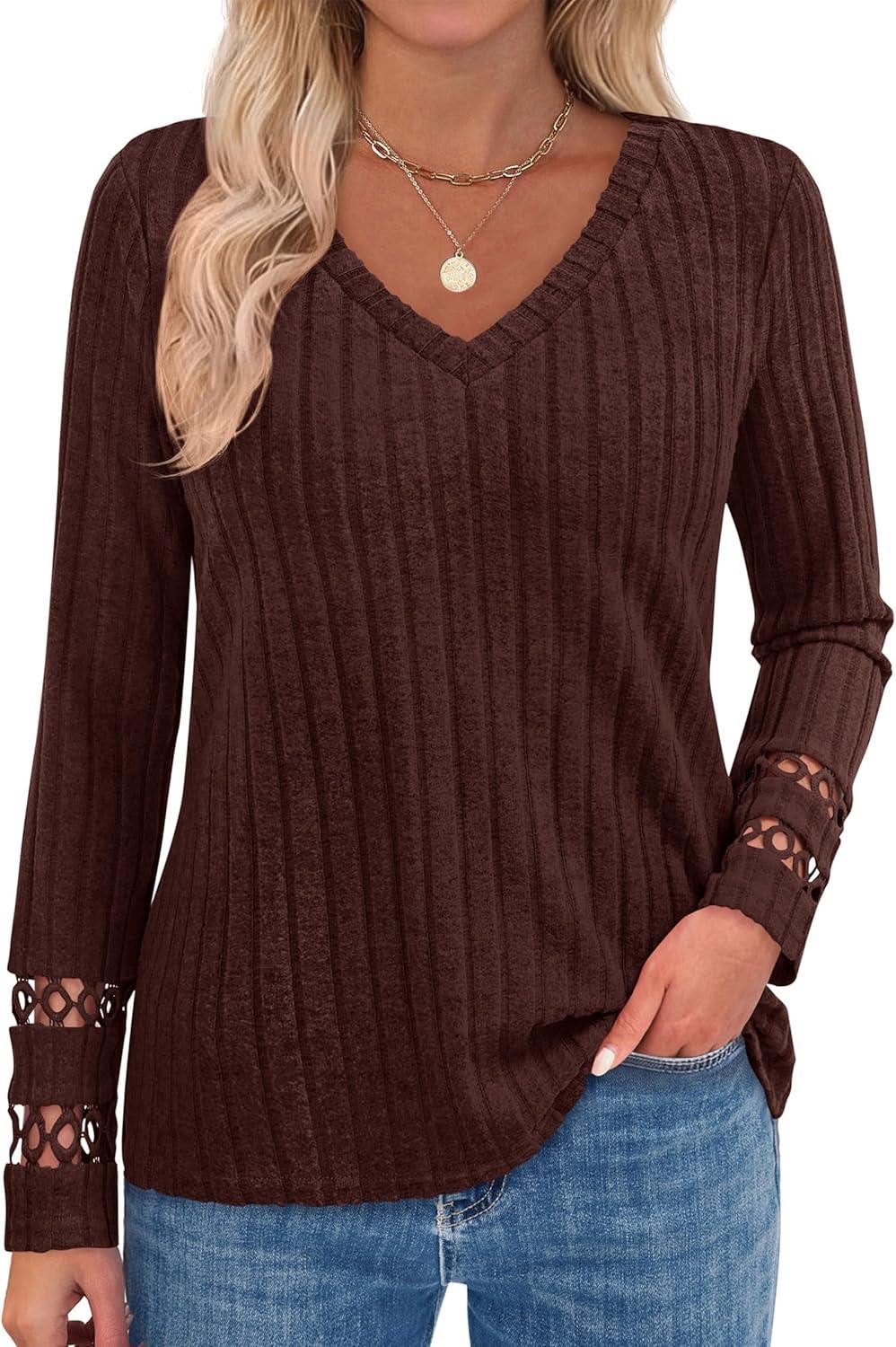 PRETTYGARDEN Women's Long Sleeve Shirts Ribbed Knit V Neck Tee Dressy Casual Blouses Going Out Tunic Tops 2025 Fall Outfits(Brown)
