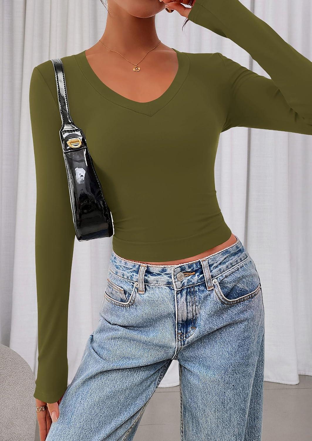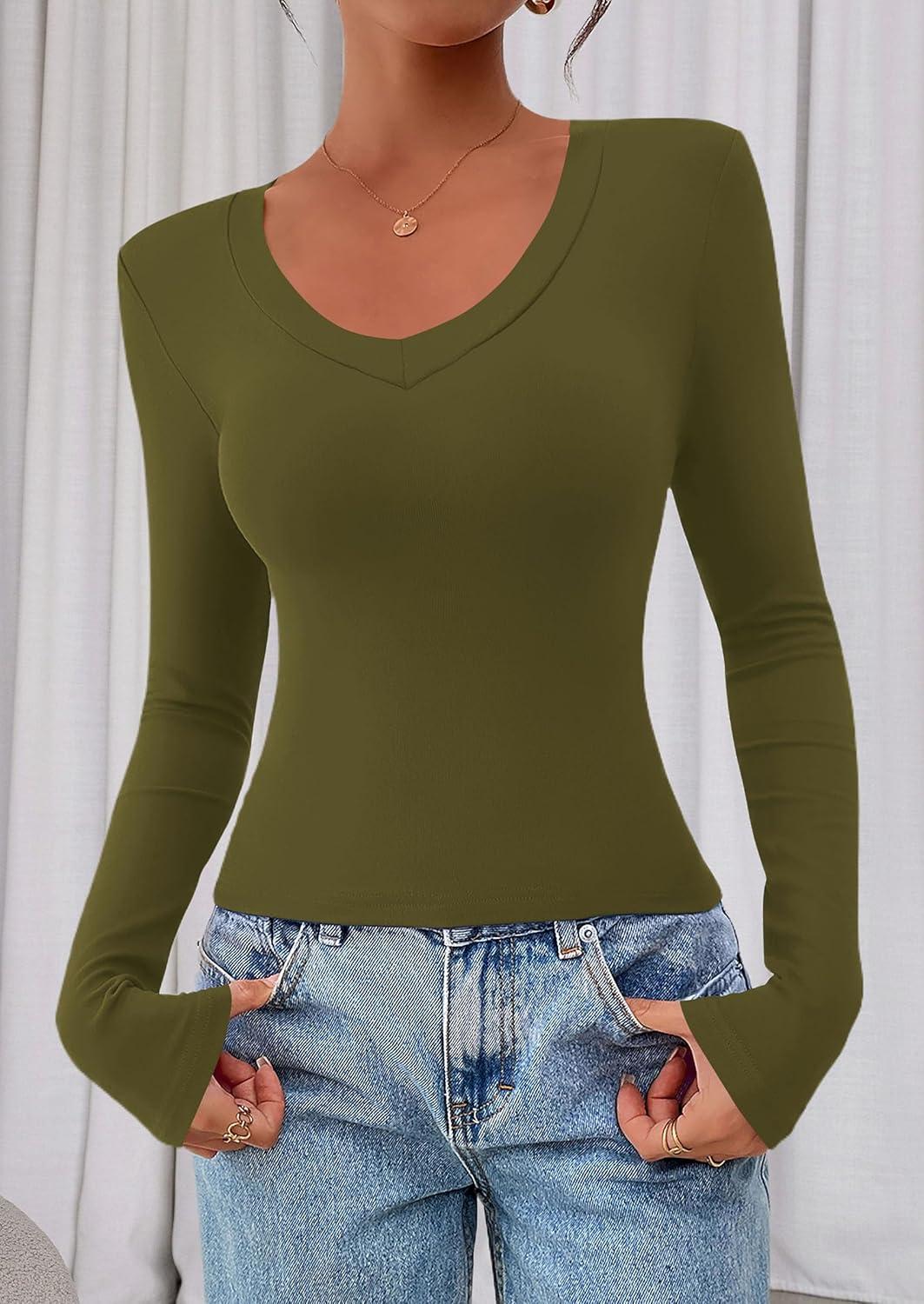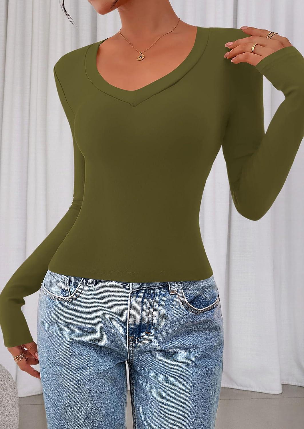 PRETTYGARDEN Womens Long Sleeve T Shirts 2025 Fall Trendy Deep V Neck Slim Fit Basic Crop Tops Casual Going Out Top(Army Green)