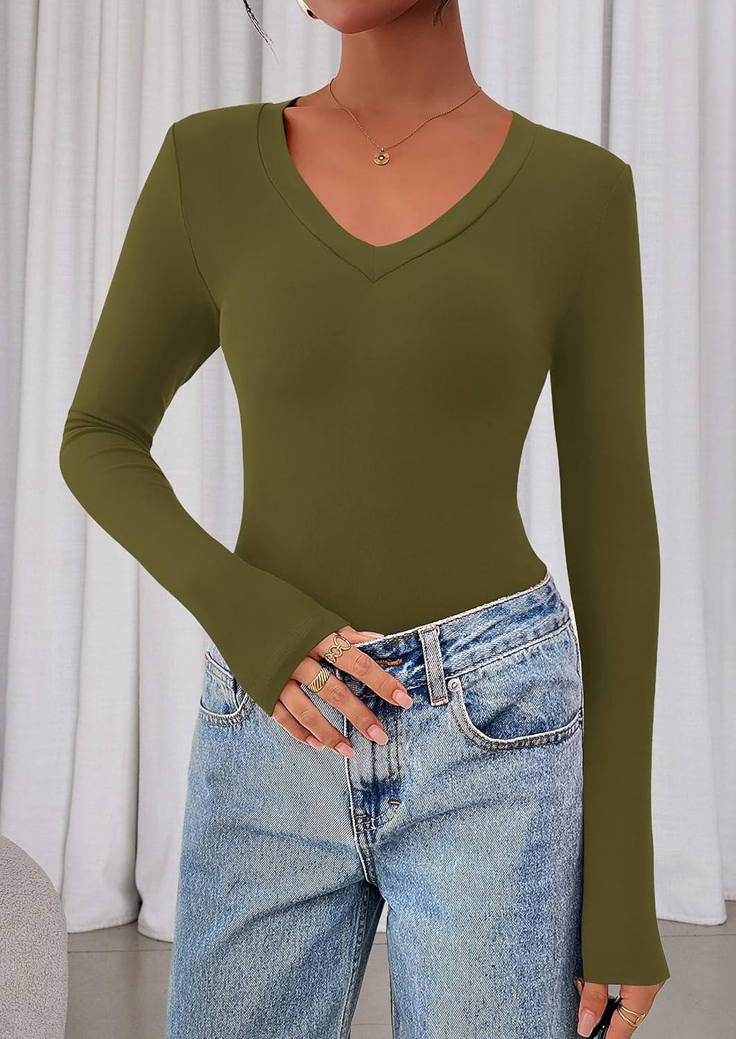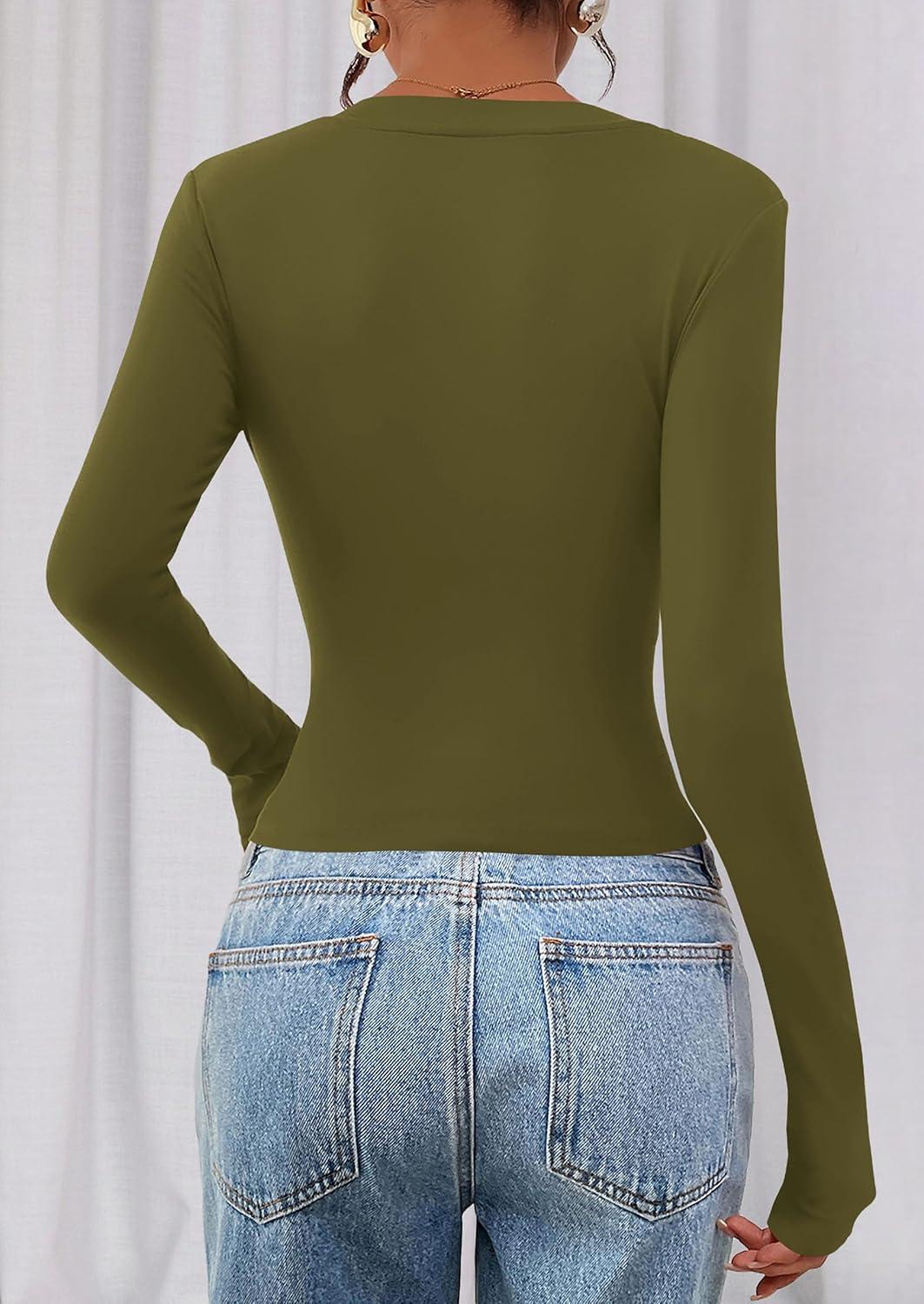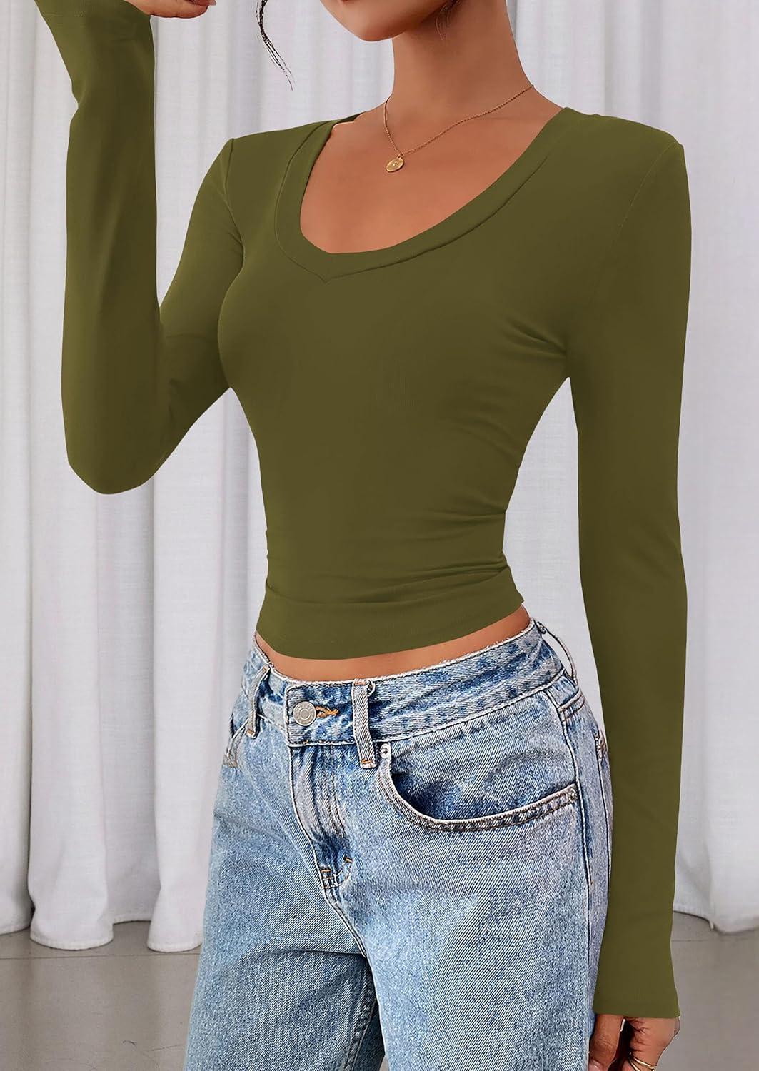 PRETTYGARDEN Womens Long Sleeve T Shirts 2025 Fall Trendy Deep V Neck Slim Fit Basic Crop Tops Casual Going Out Top(Army Green)