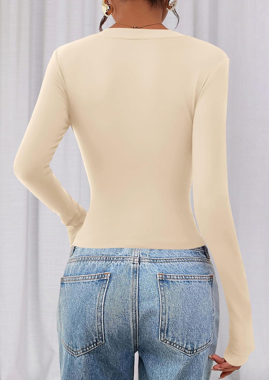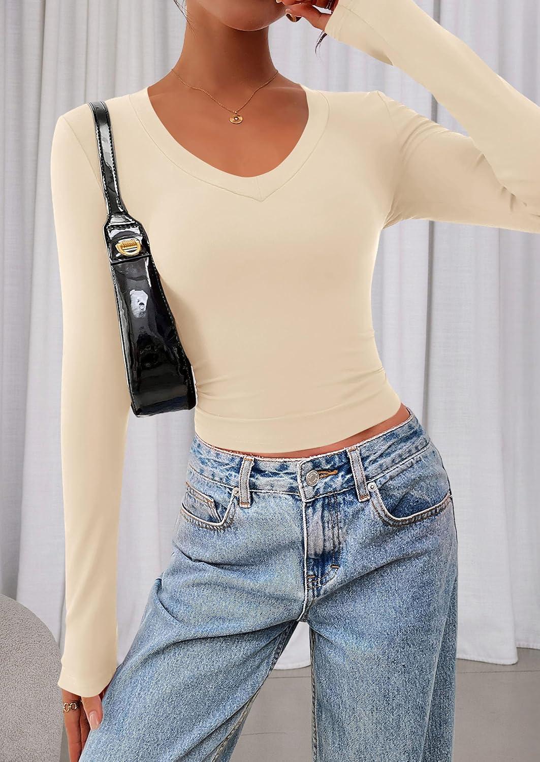 PRETTYGARDEN Womens Long Sleeve T Shirts 2025 Fall Trendy Deep V Neck Slim Fit Basic Crop Tops Casual Going Out Top(Beige)