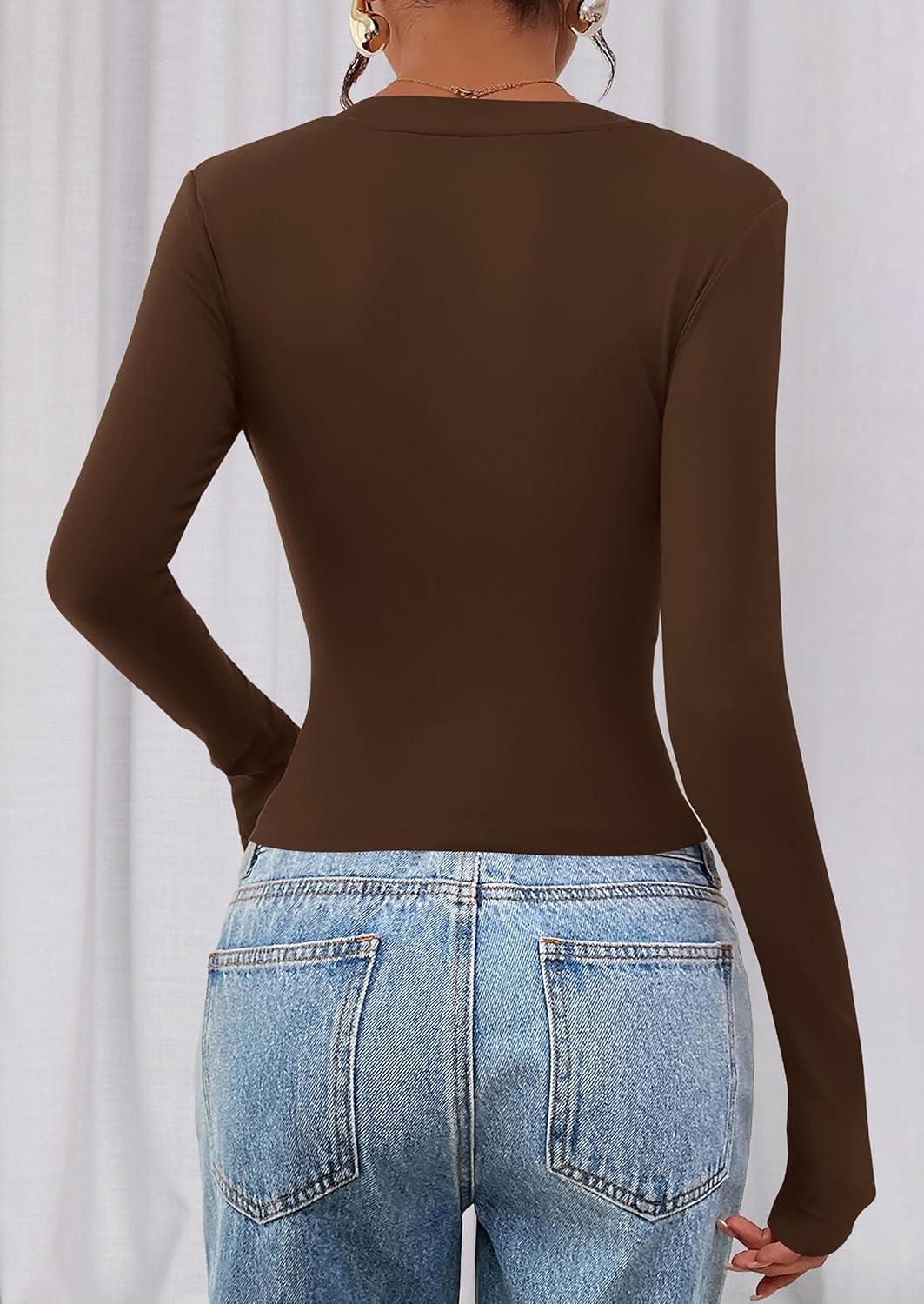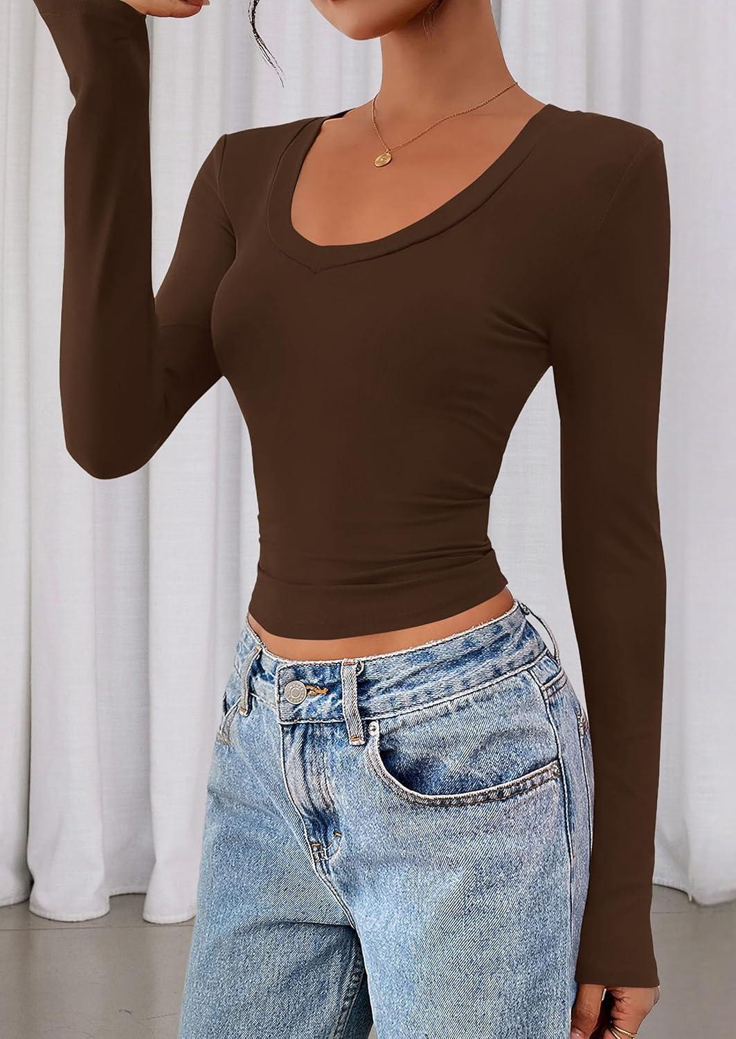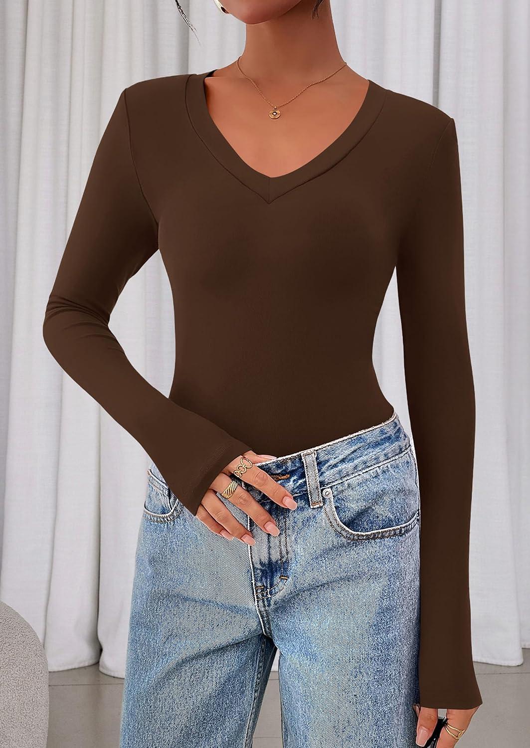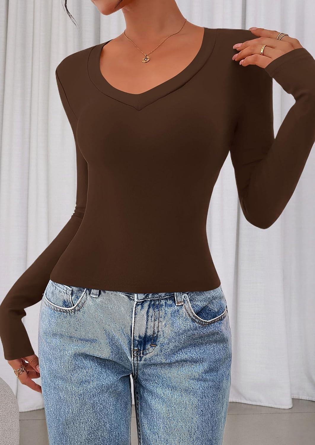PRETTYGARDEN Womens Long Sleeve T Shirts 2025 Fall Trendy Deep V Neck Slim Fit Basic Crop Tops Casual Going Out Top(Brown)