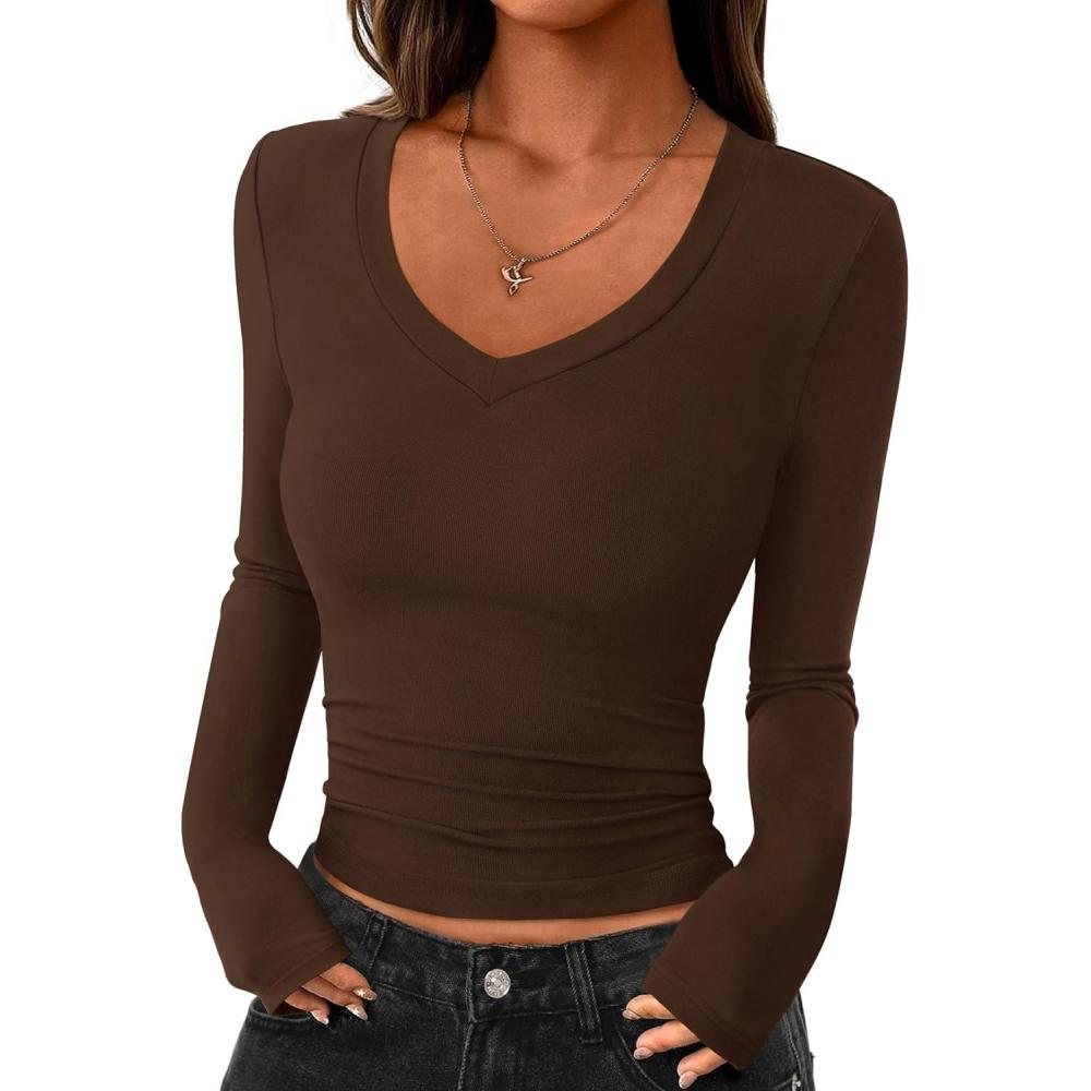 imagePRETTYGARDEN Womens Long Sleeve T Shirts 2025 Fall Trendy Deep V Neck Slim Fit Basic Crop Tops Casual Going Out TopBrown