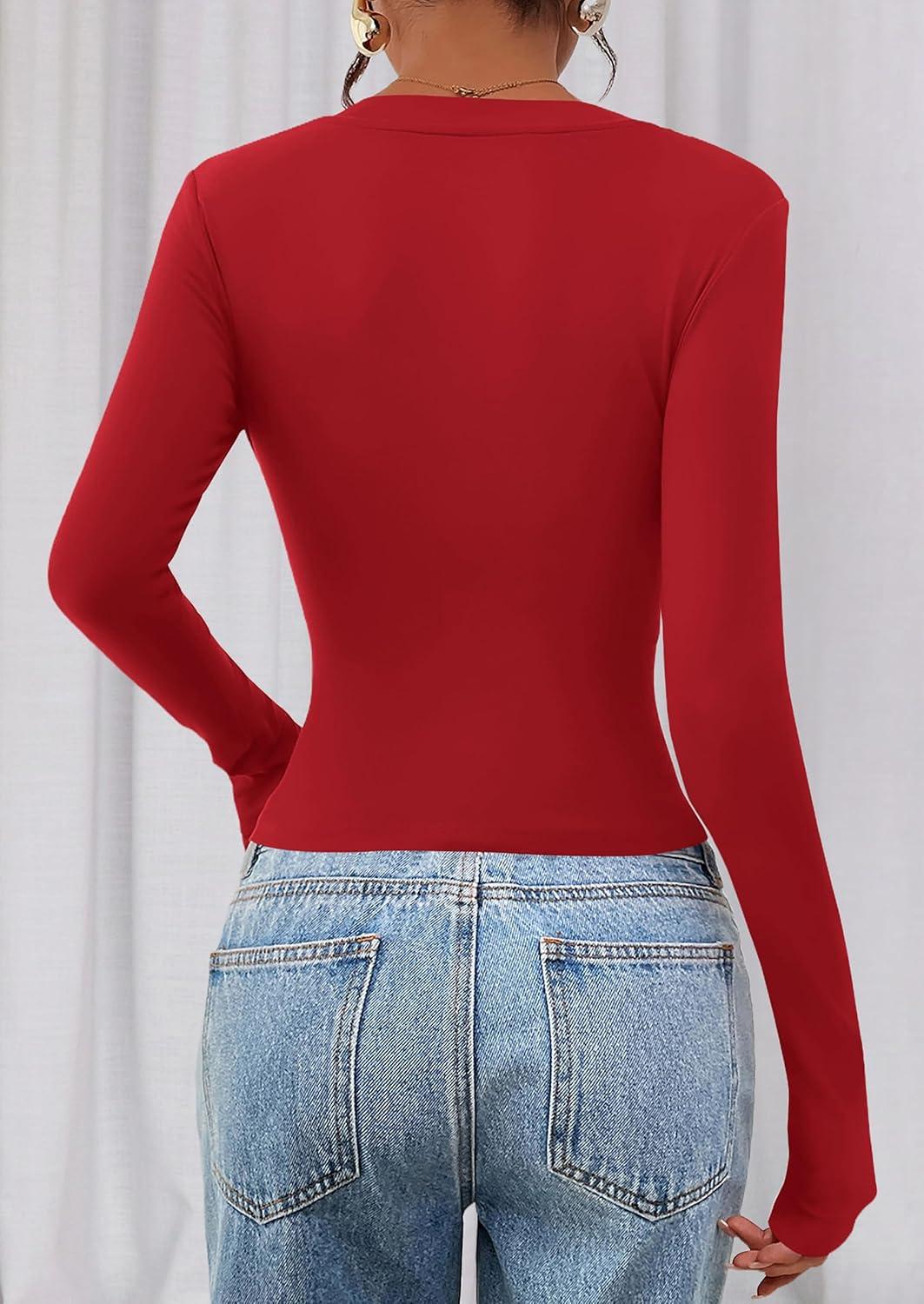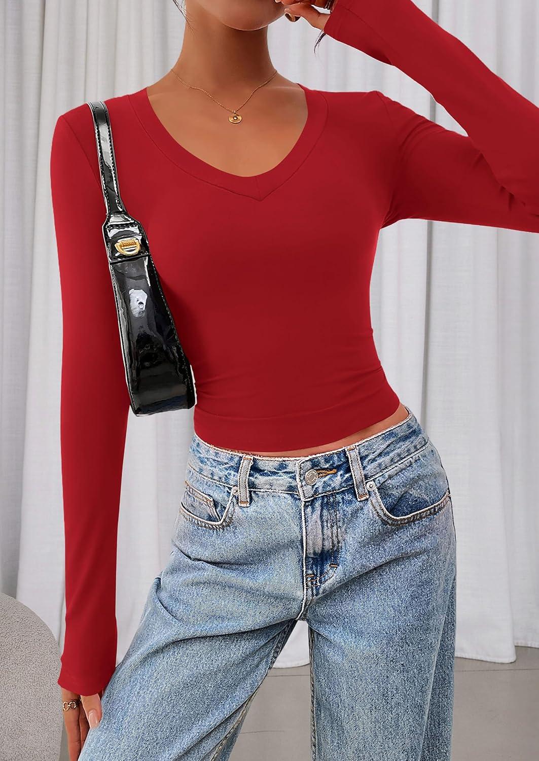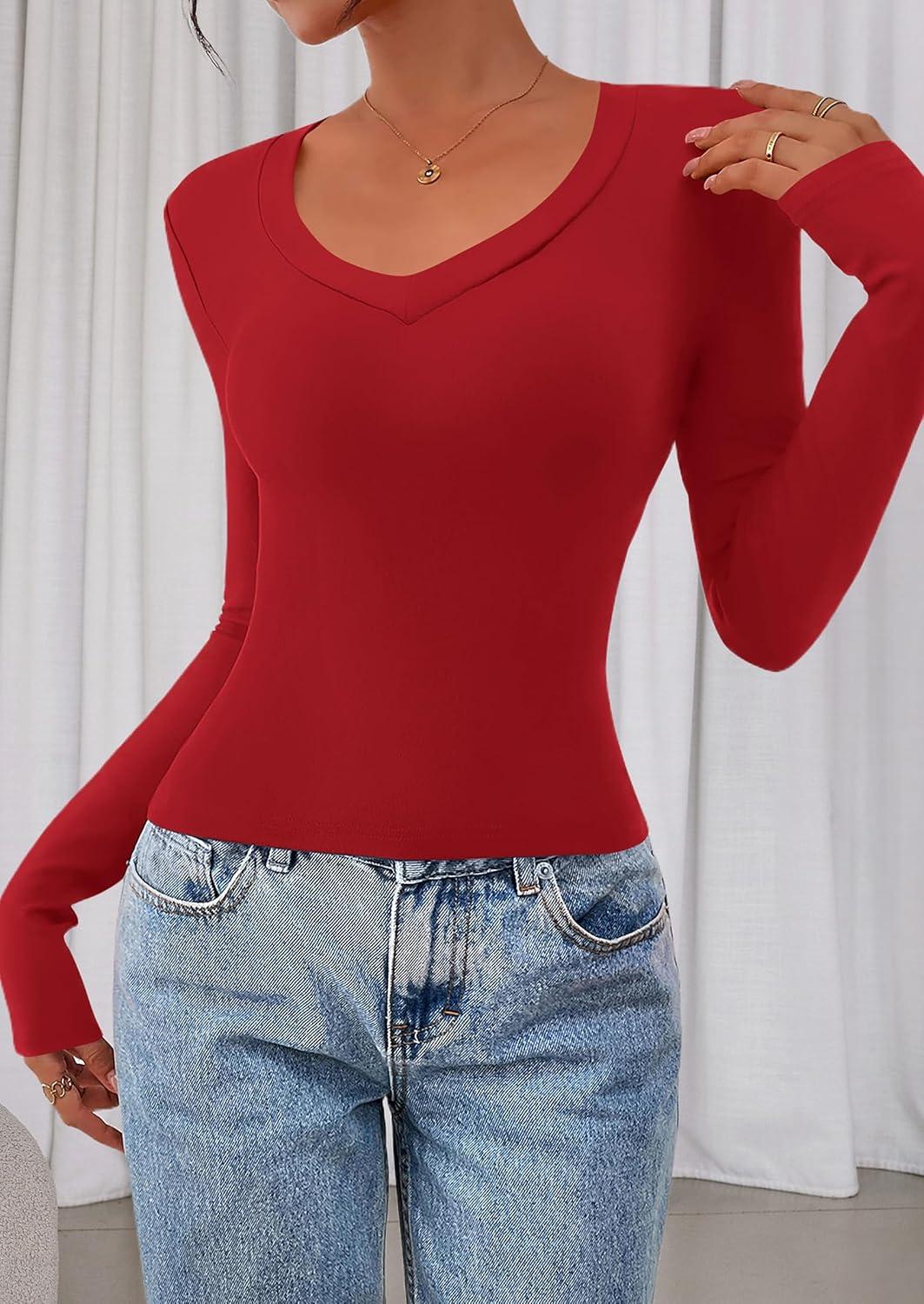 PRETTYGARDEN Womens Long Sleeve T Shirts 2025 Fall Trendy Deep V Neck Slim Fit Basic Crop Tops Casual Going Out Top(Red)