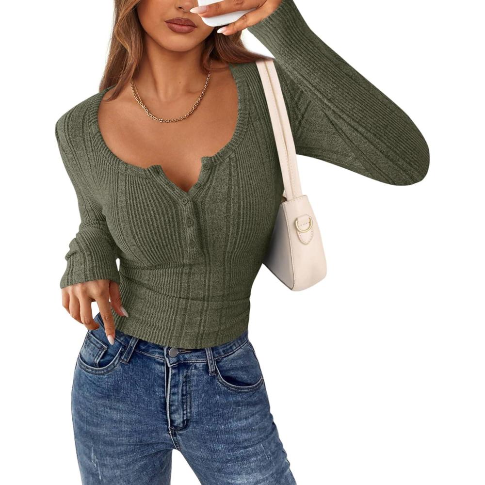PRETTYGARDEN Women’s Long Sleeve Tops 2025 Fall Fashion Henley Shirts Slim Fitted Ribbed Knit Tees Blouses Going Out Outfits(Army Green)