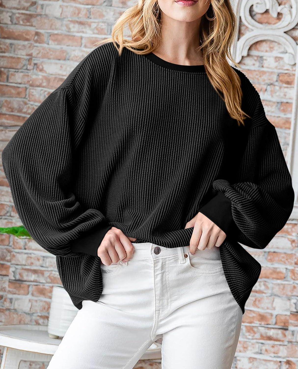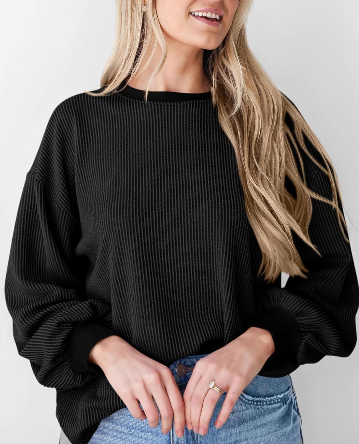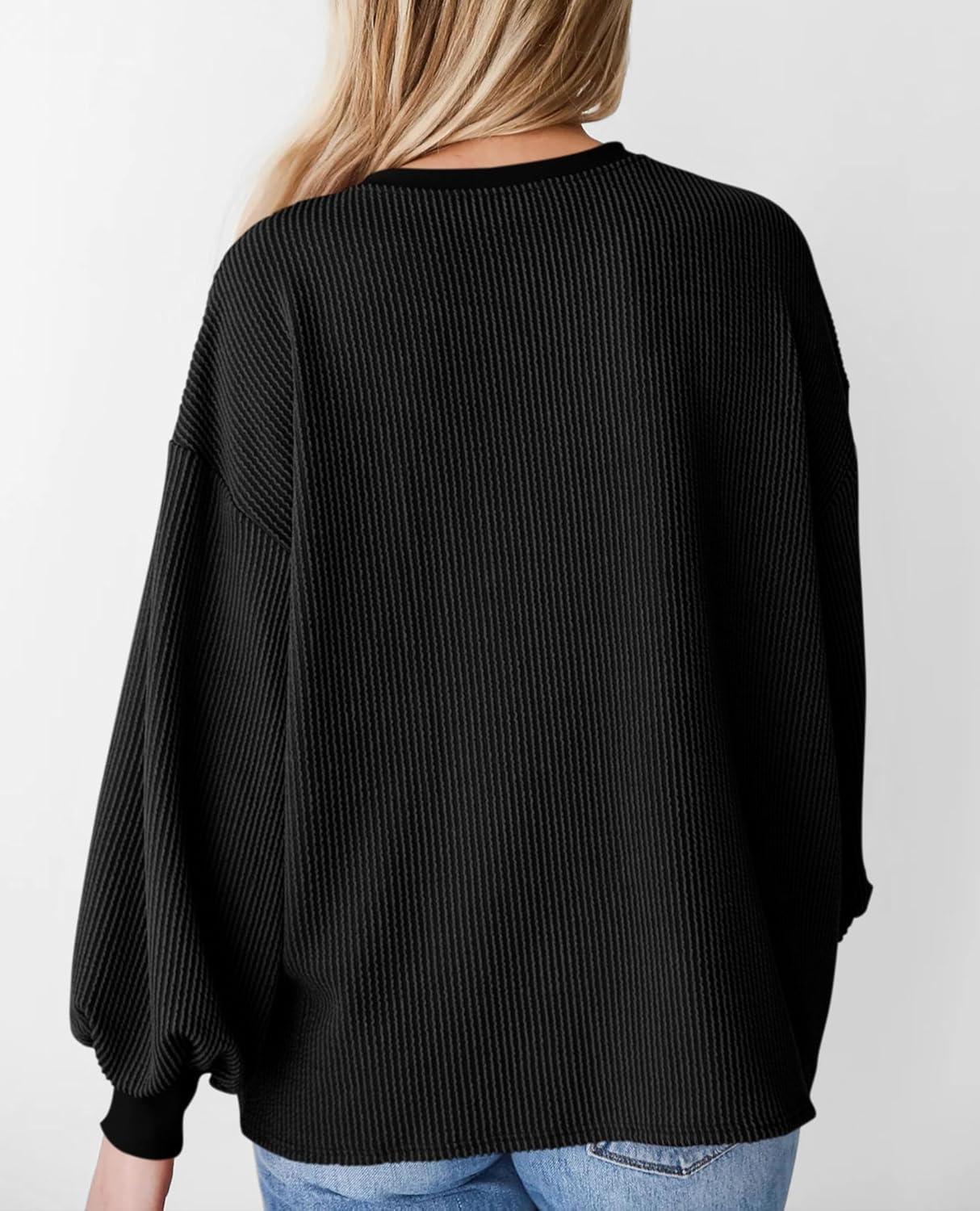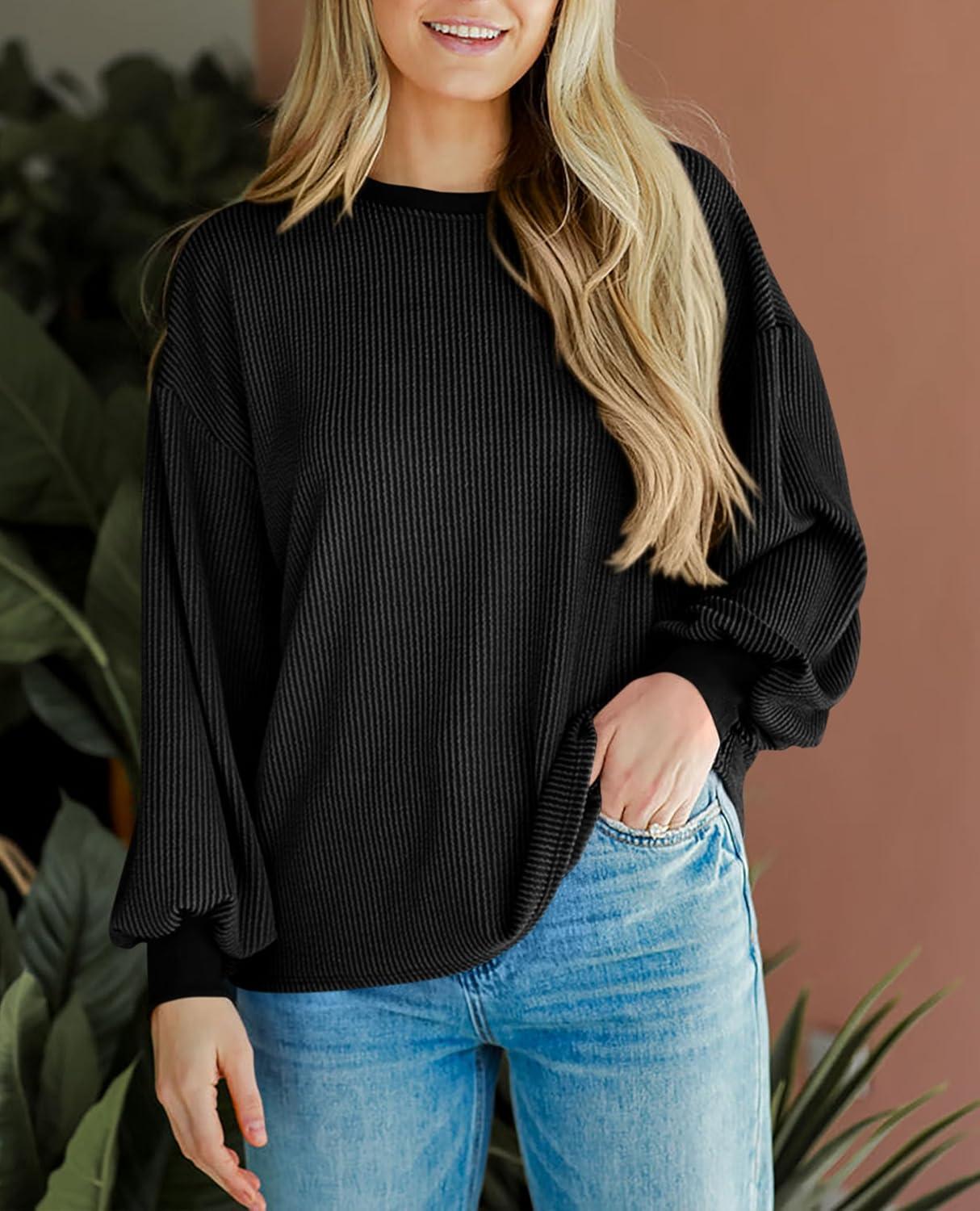 PRETTYGARDEN Womens Long Sleeve Tops 2025 Fall Fashion Shirts Trendy Clothes Casual Loose Crewneck Ribbed Knit Tunic Blouse(Black)