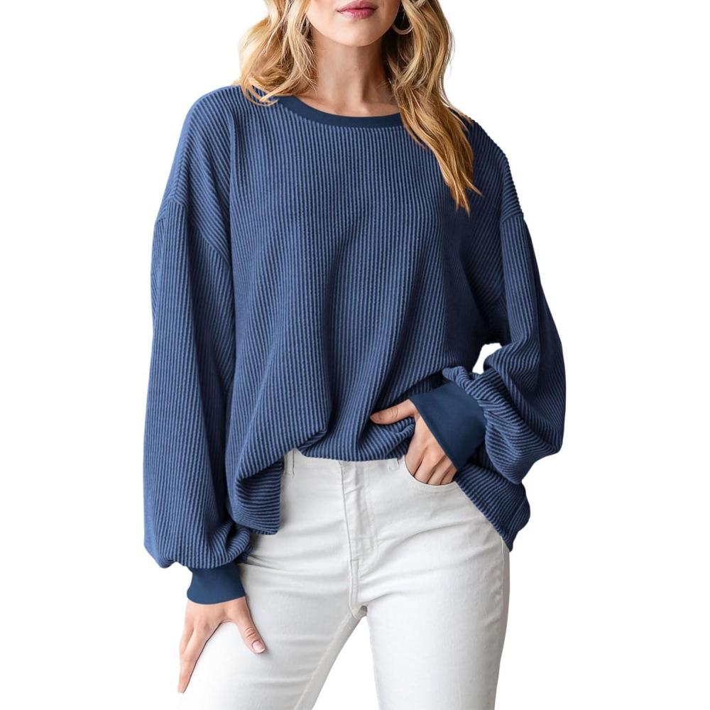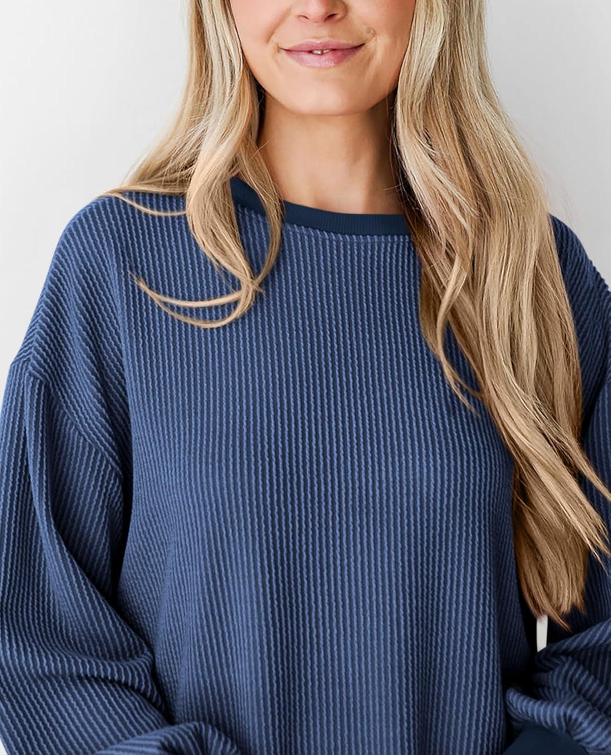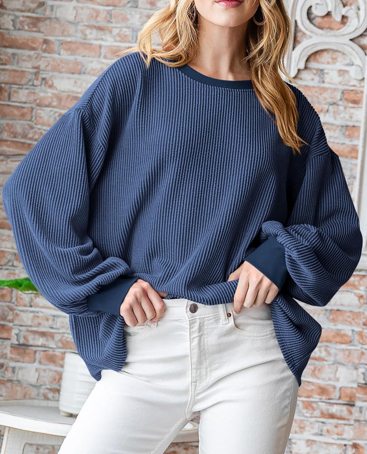 PRETTYGARDEN Womens Long Sleeve Tops 2025 Fall Fashion Shirts Trendy Clothes Casual Loose Crewneck Ribbed Knit Tunic Blouse(Dark Blue)