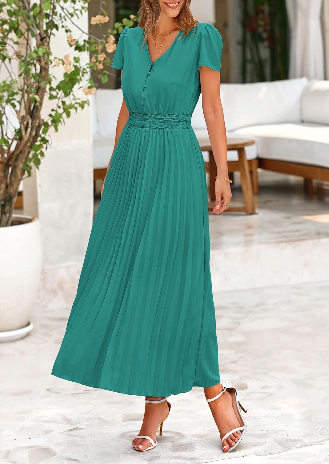 PRETTYGARDEN Women's Maxi Dresses 2025 Summer Trendy Cap Short Sleeve Button V Neck Casual Flowy Pleated Long Dress(Blue Green)