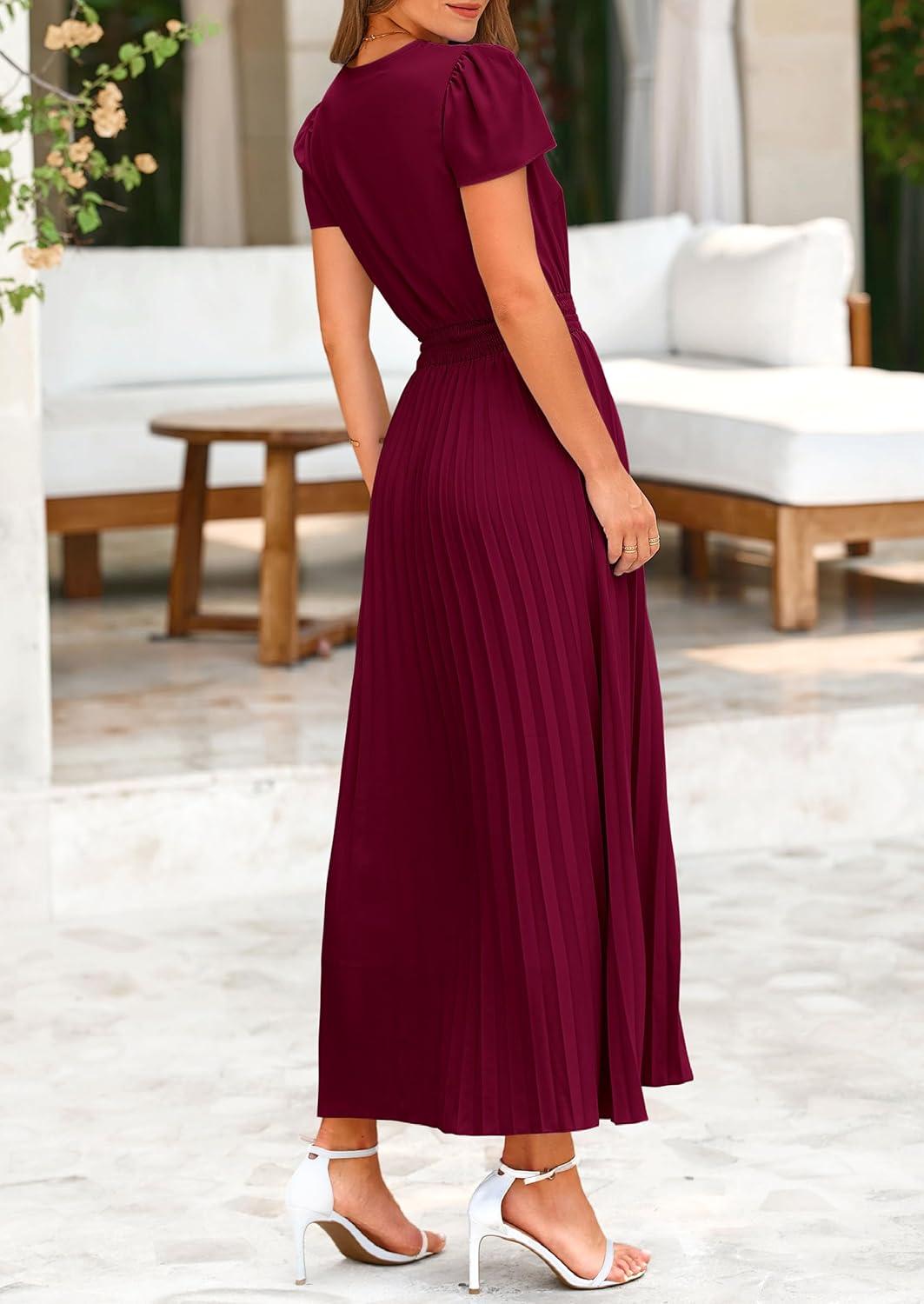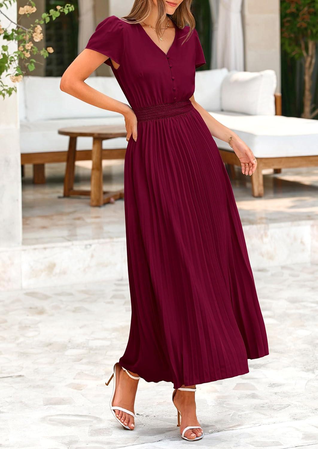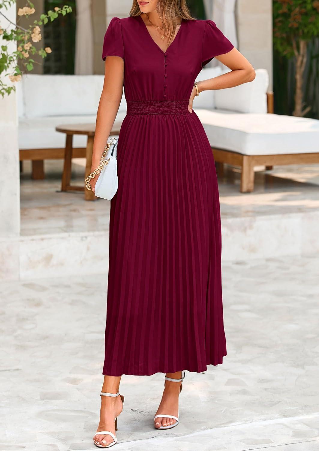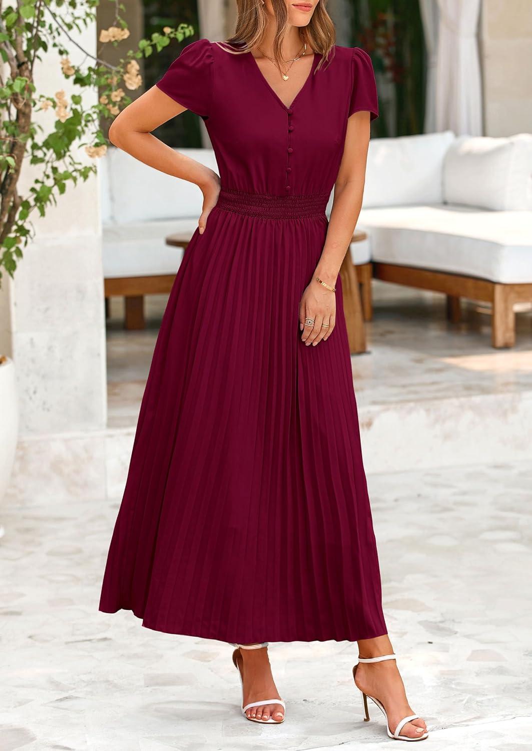 PRETTYGARDEN Women's Maxi Dresses 2025 Summer Trendy Cap Short Sleeve Button V Neck Casual Flowy Pleated Long Dress(Dark Wine Red)