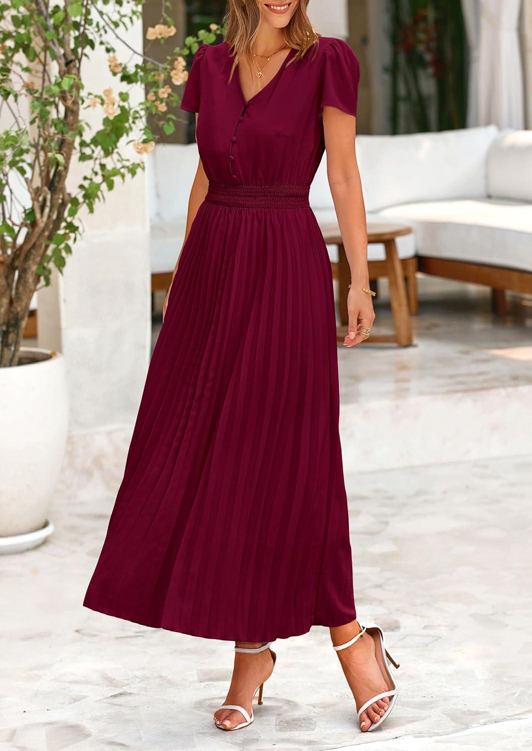 PRETTYGARDEN Women’s Maxi Dresses 2025 Summer Trendy Cap Short Sleeve Button V Neck Casual Flowy Pleated Long Dress(Dark Wine Red)