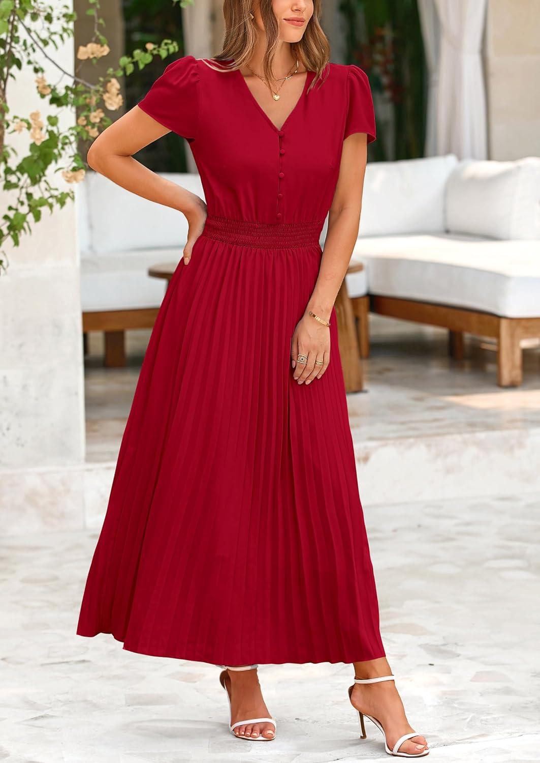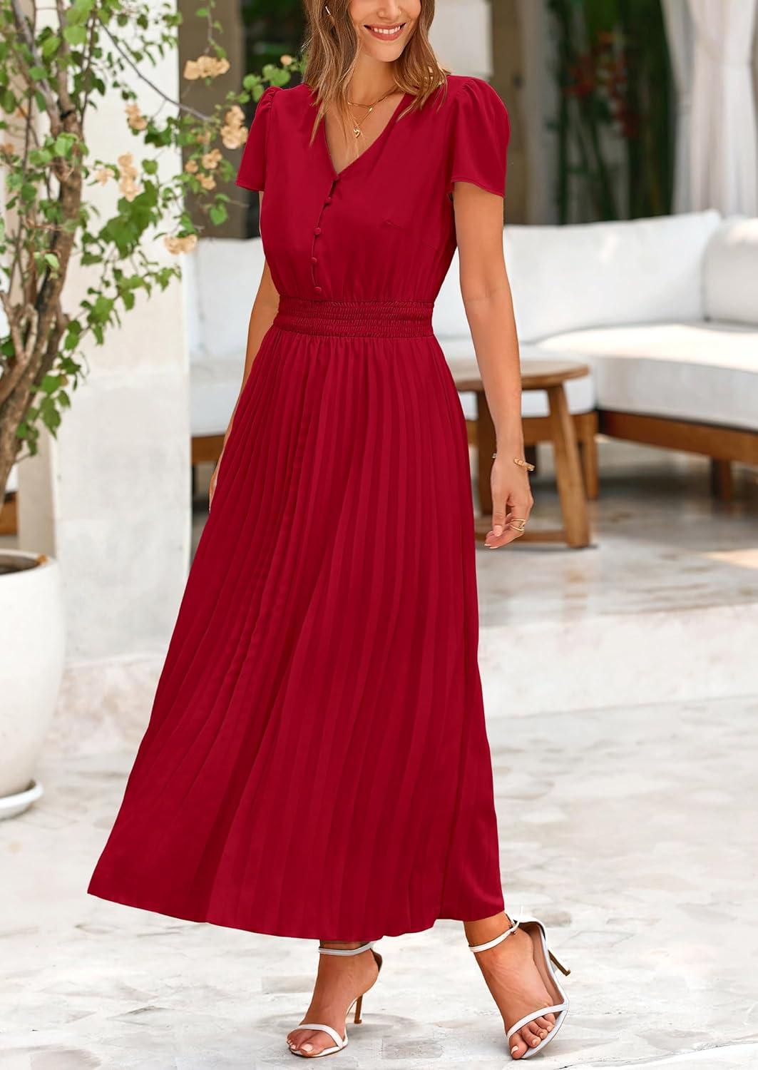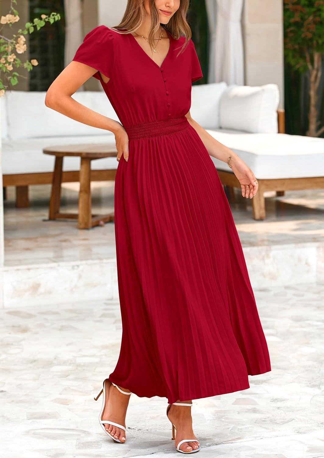 PRETTYGARDEN Women's Maxi Dresses 2025 Summer Trendy Cap Short Sleeve Button V Neck Casual Flowy Pleated Long Dress(Jujube Red)