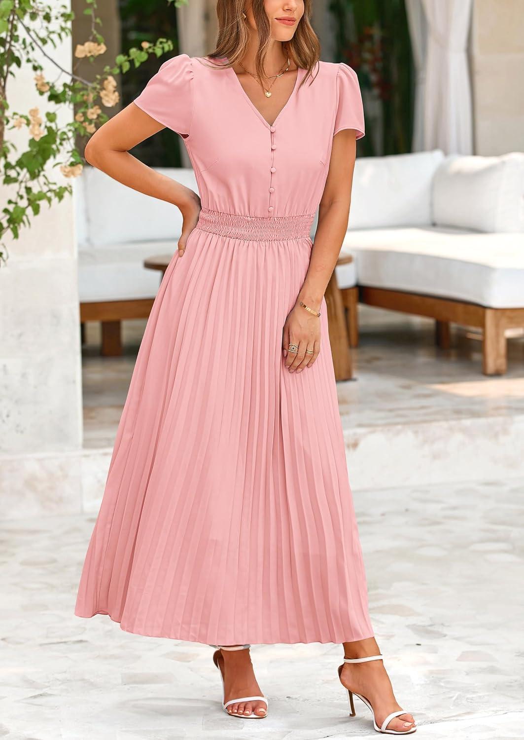 PRETTYGARDEN Women's Maxi Dresses 2025 Summer Trendy Cap Short Sleeve Button V Neck Casual Flowy Pleated Long Dress(Pink)
