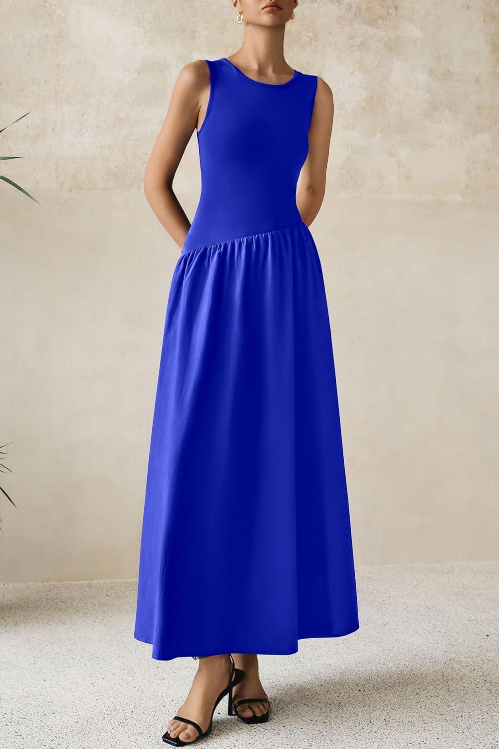 PRETTYGARDEN Women's Maxi Sundress Casual Summer 2025 Sleeveless Asymmetrical Drop Waist Patchwork Long Flowy Tank Dresses(Blue)