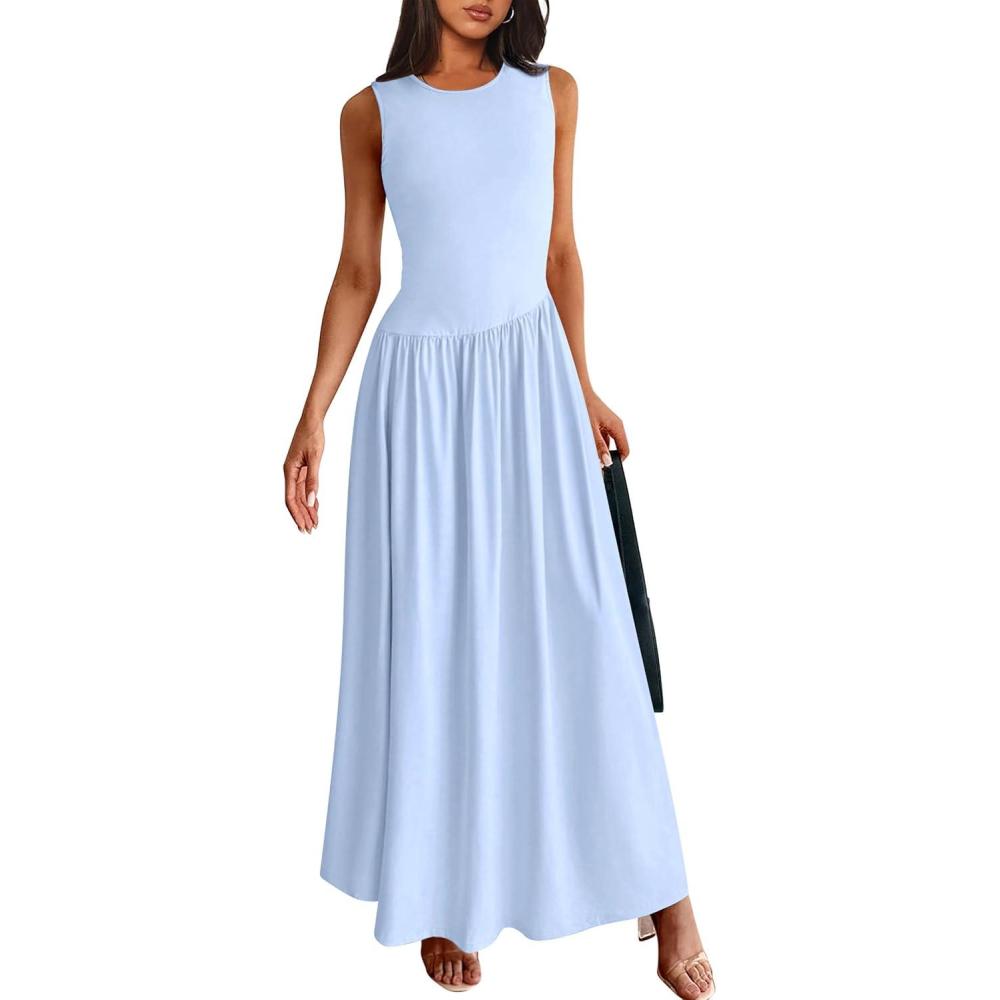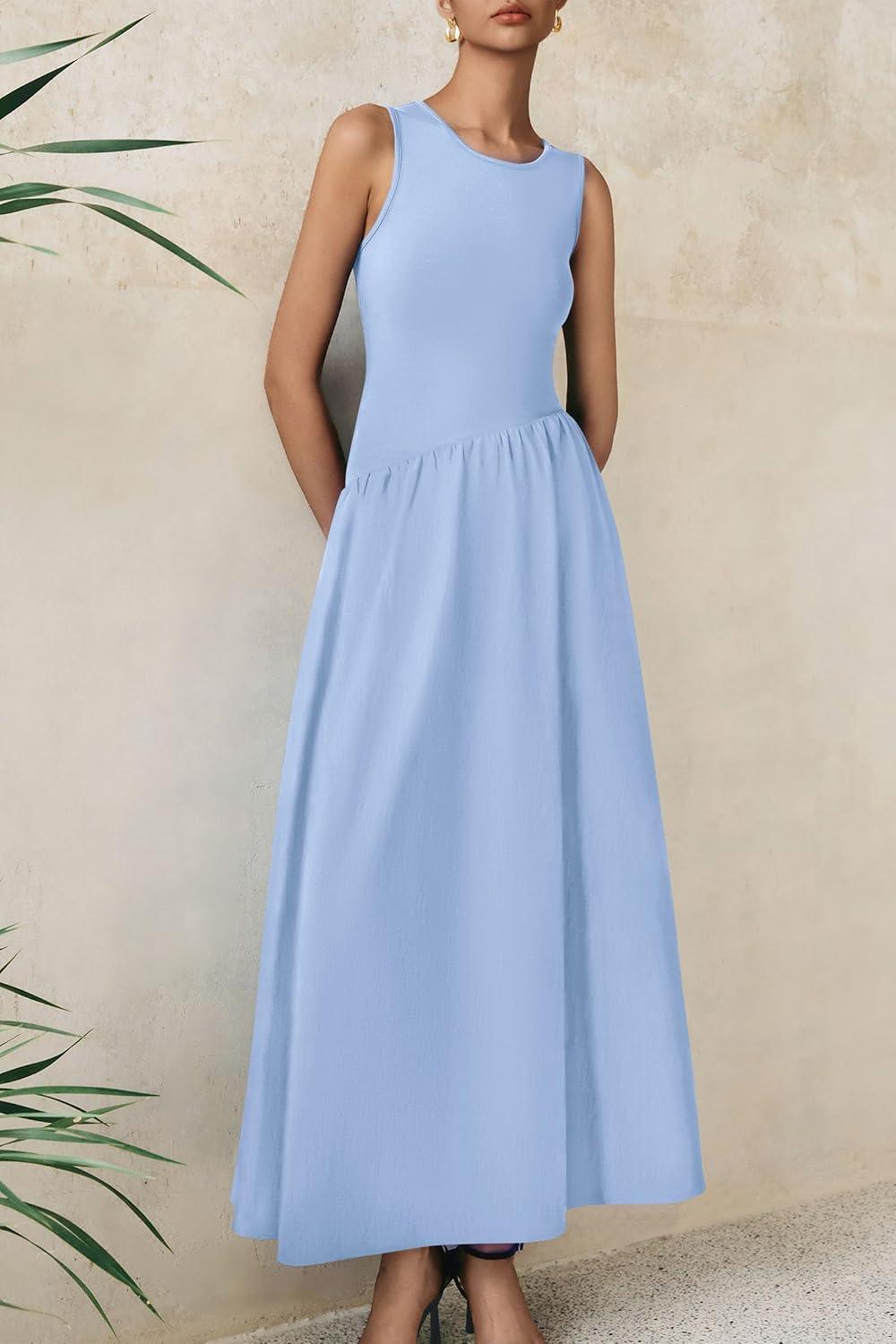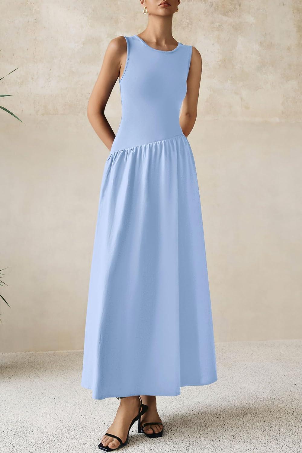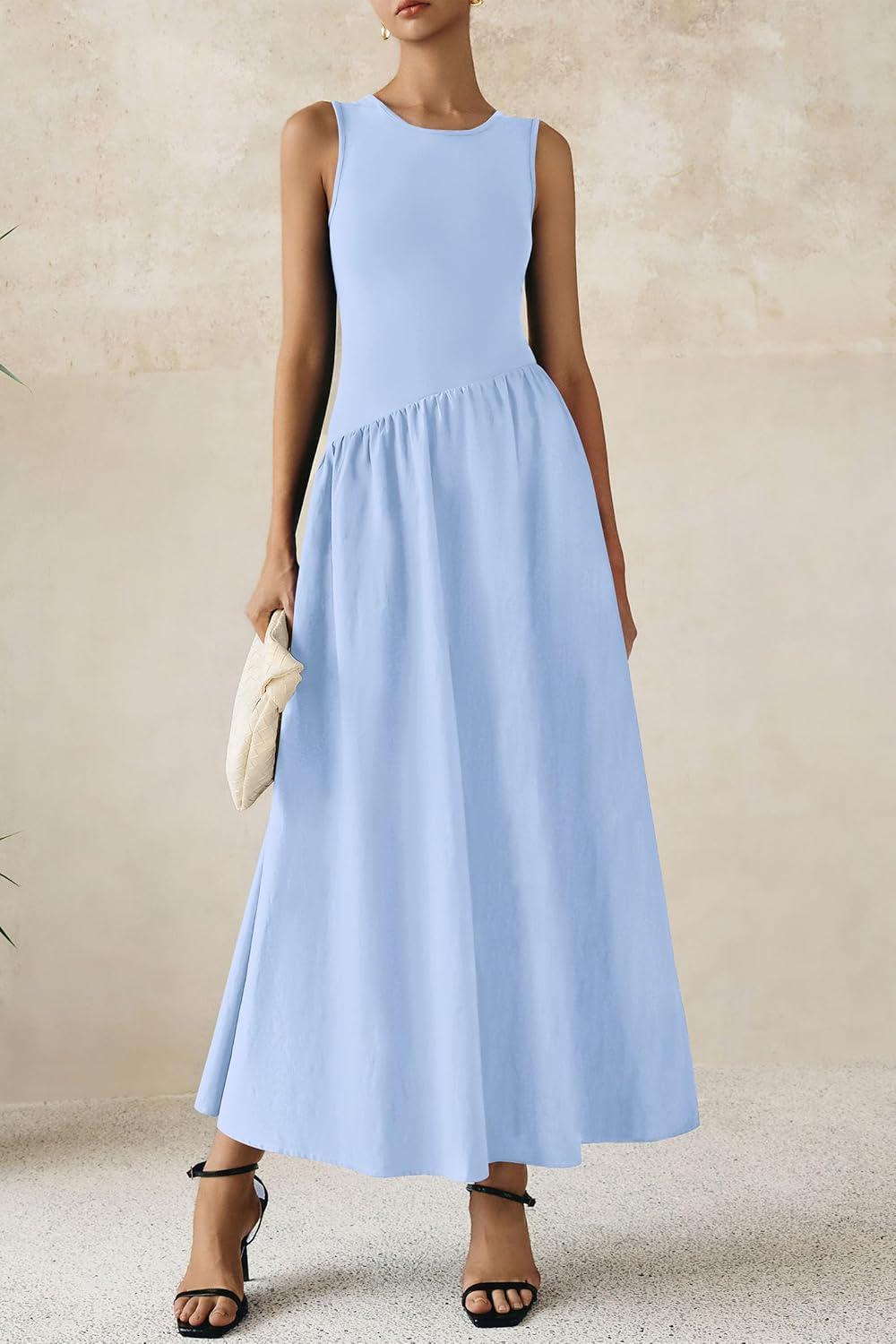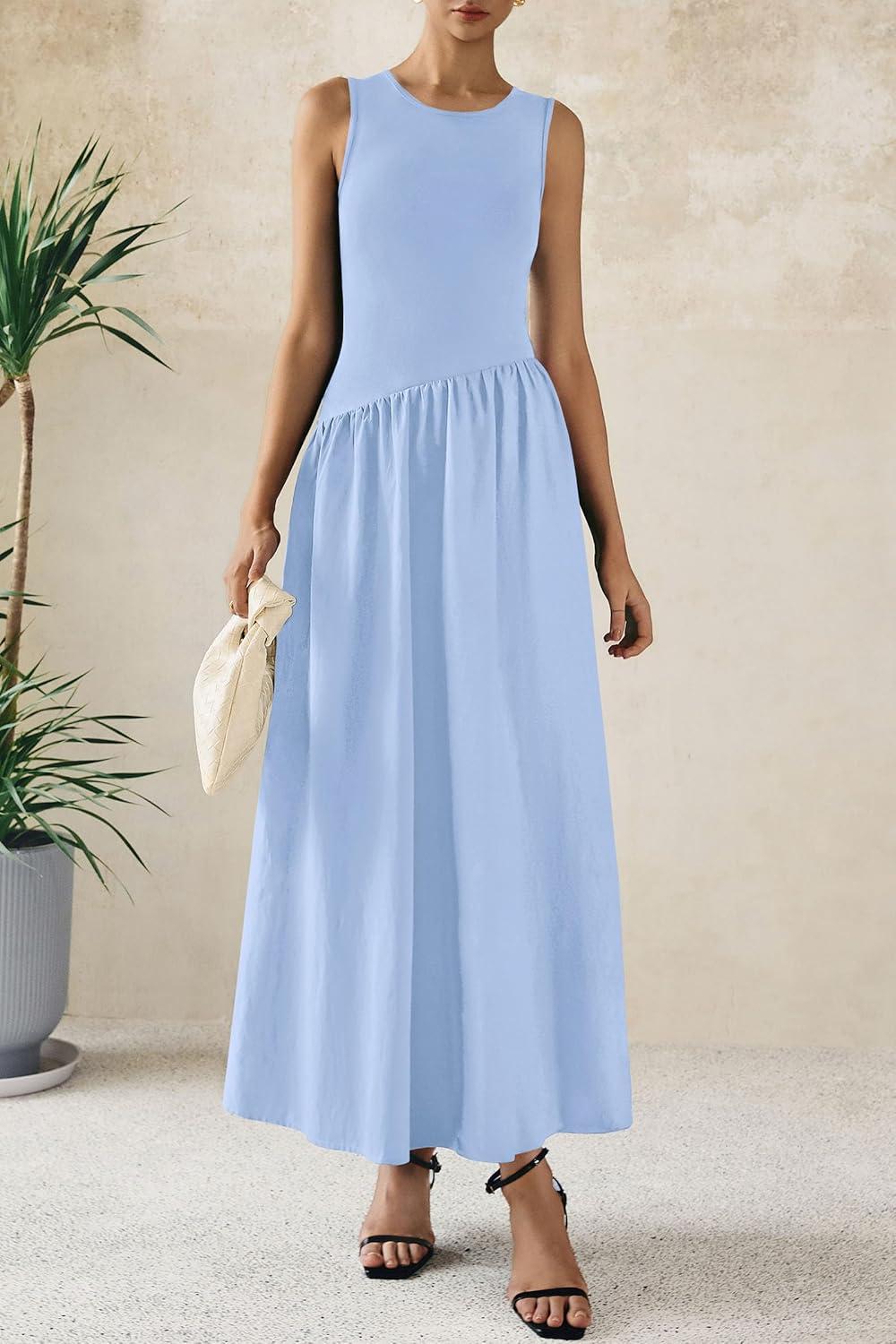 PRETTYGARDEN Women’s Maxi Sundress Casual Summer 2025 Sleeveless Asymmetrical Drop Waist Patchwork Long Flowy Tank Dresses(Light Blue)