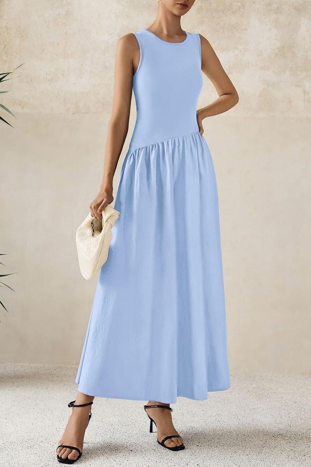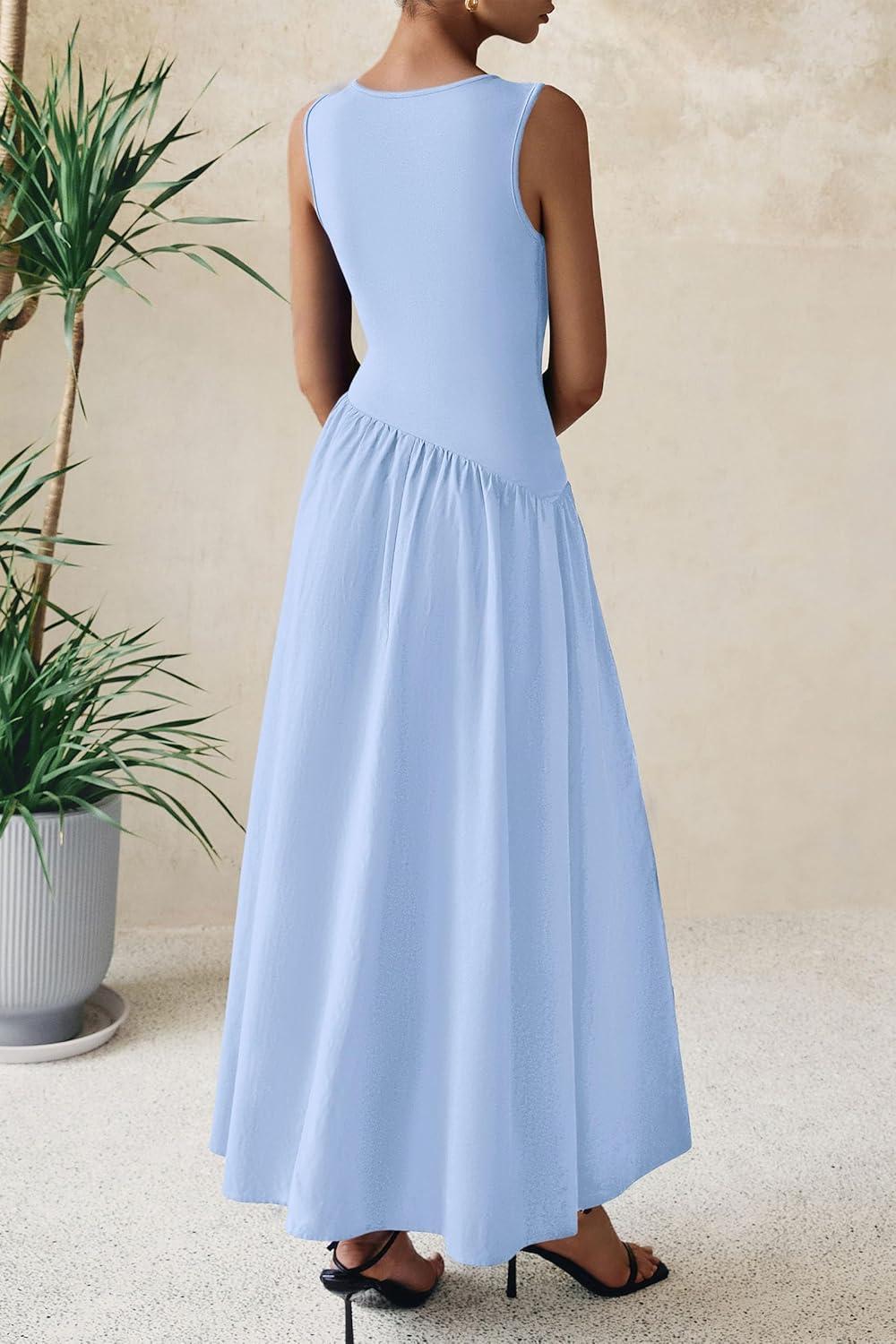 PRETTYGARDEN Women's Maxi Sundress Casual Summer 2025 Sleeveless Asymmetrical Drop Waist Patchwork Long Flowy Tank Dresses(Light Blue)