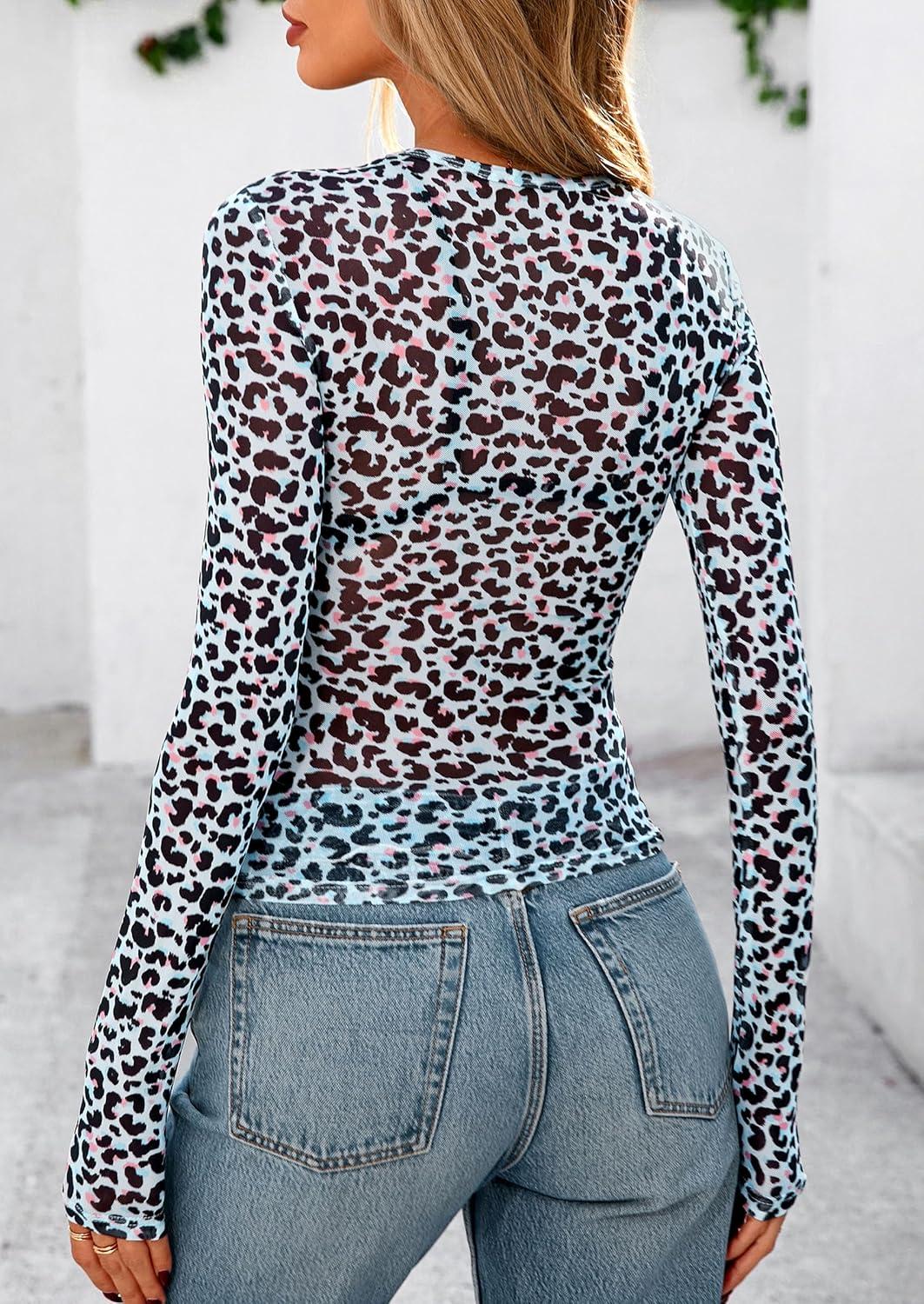 PRETTYGARDEN Women's Mesh Long Sleeve Top 2025 Trendy Fall See Through Sheer Blouse Leopard Fitted Going Out Layering Shirts(Leopard Light Blue)