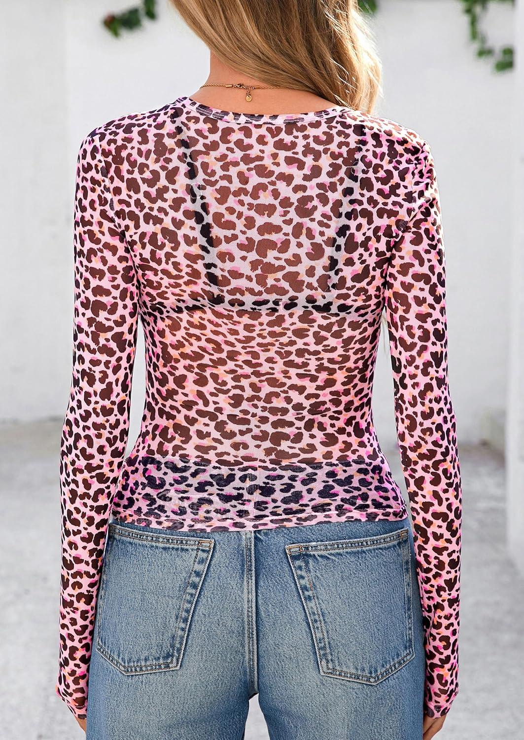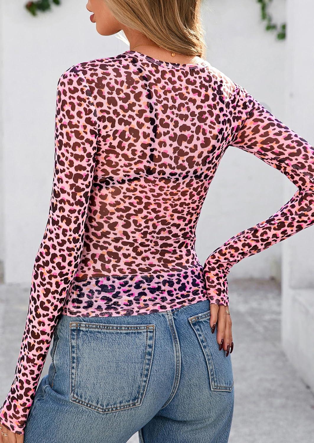 PRETTYGARDEN Women's Mesh Long Sleeve Top 2025 Trendy Fall See Through Sheer Blouse Leopard Fitted Going Out Layering Shirts(Leopard Pink)