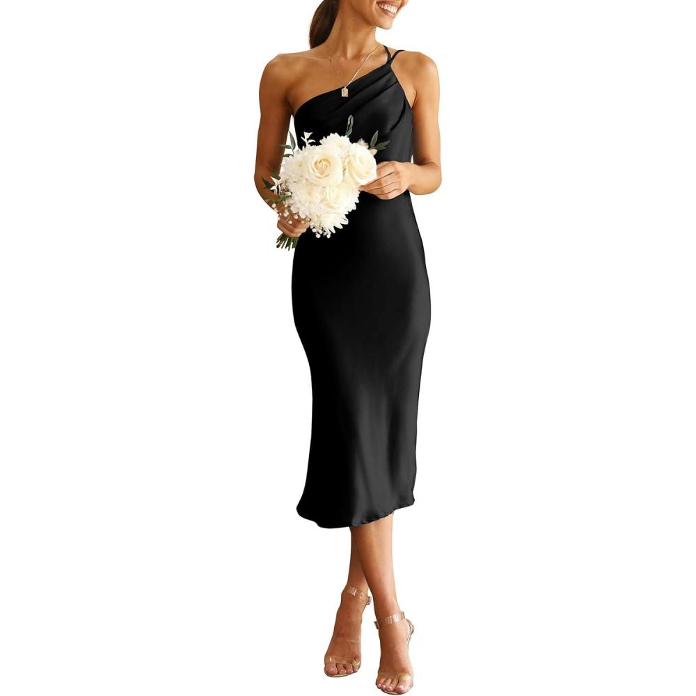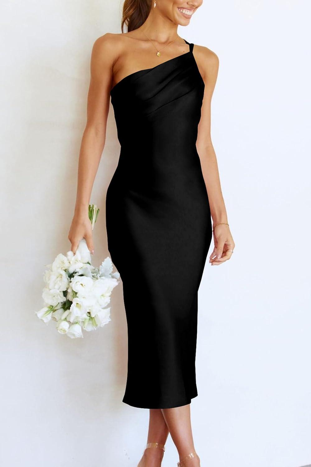 PRETTYGARDEN Women’s Midi Satin Dress One Shoulder Spaghetti Strap Backless Ruched Summer Bodycon Dresses(Black)