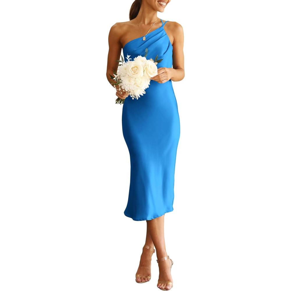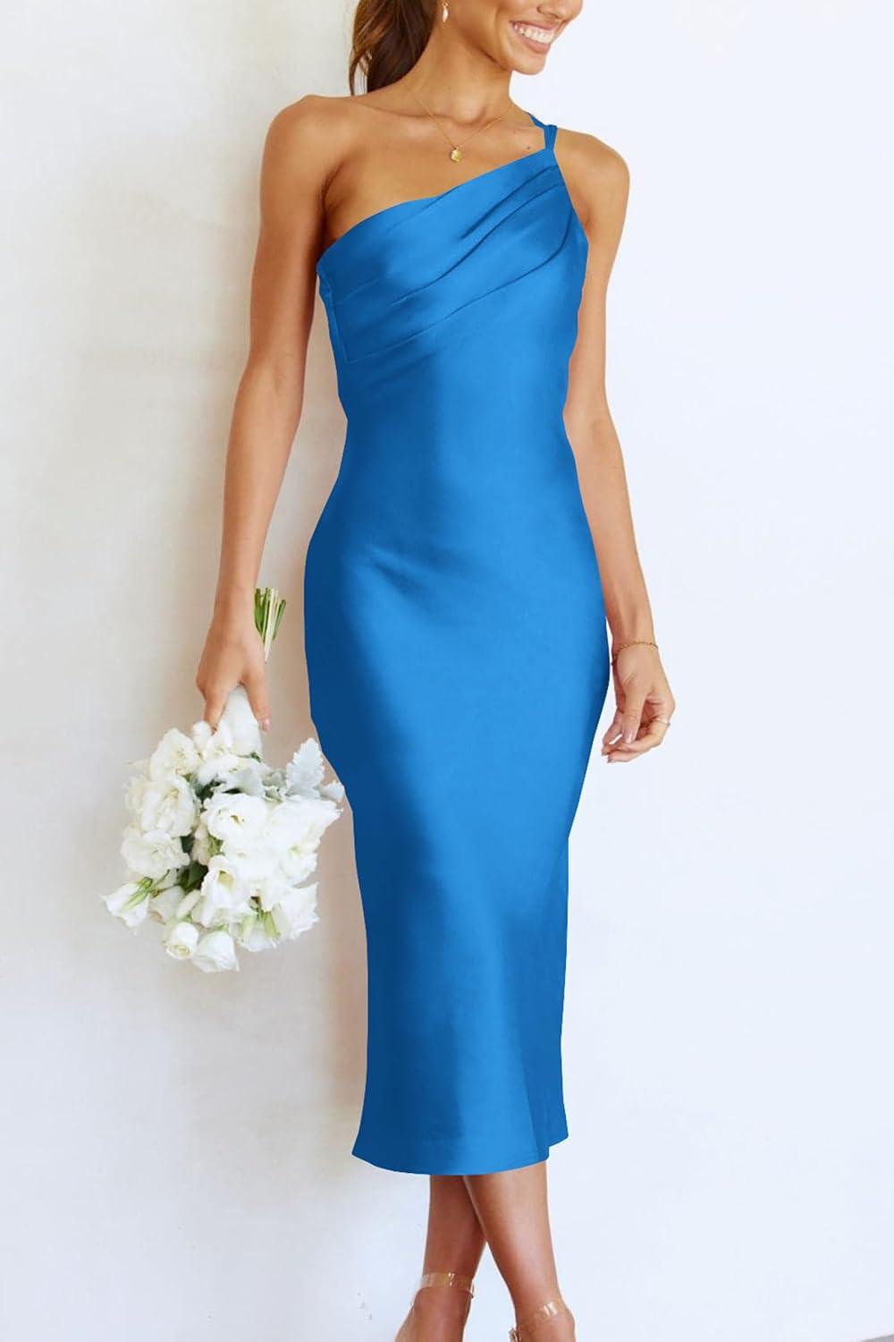 PRETTYGARDEN Women's Midi Satin Dress One Shoulder Spaghetti Strap Backless Ruched Summer Bodycon Dresses(Blue)