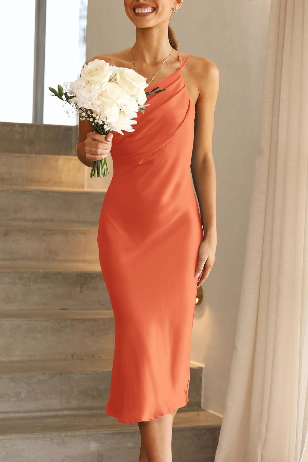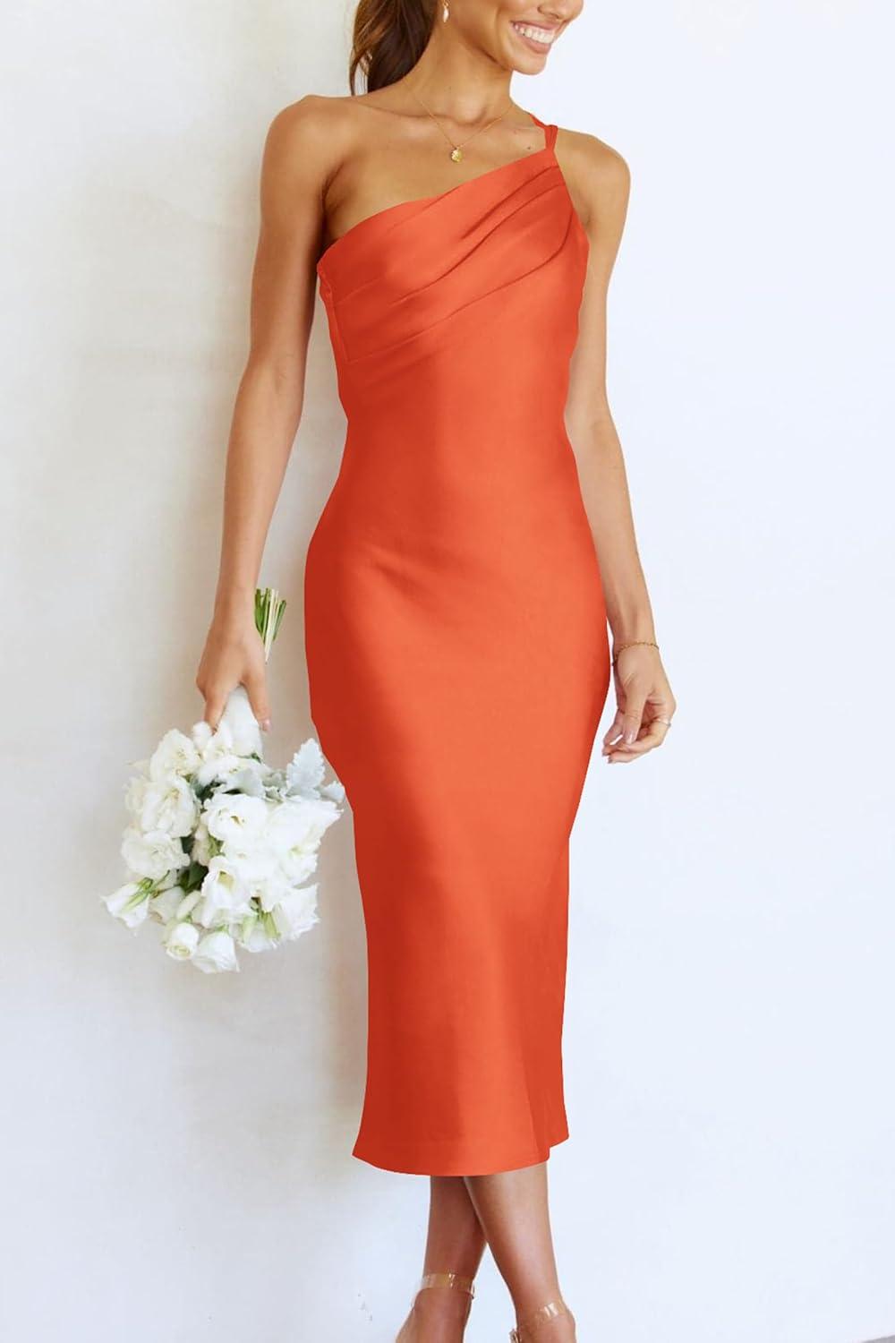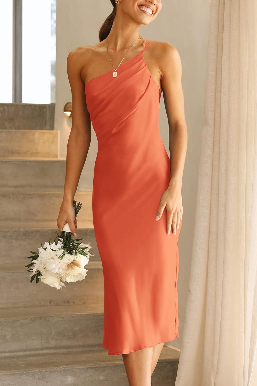 PRETTYGARDEN Women’s Midi Satin Dress One Shoulder Spaghetti Strap Backless Ruched Summer Bodycon Dresses(Orange)