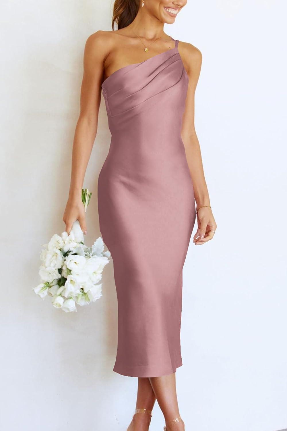 PRETTYGARDEN Women’s Midi Satin Dress One Shoulder Spaghetti Strap Backless Ruched Summer Bodycon Dresses(Pink)
