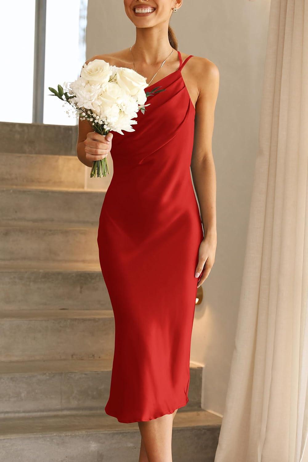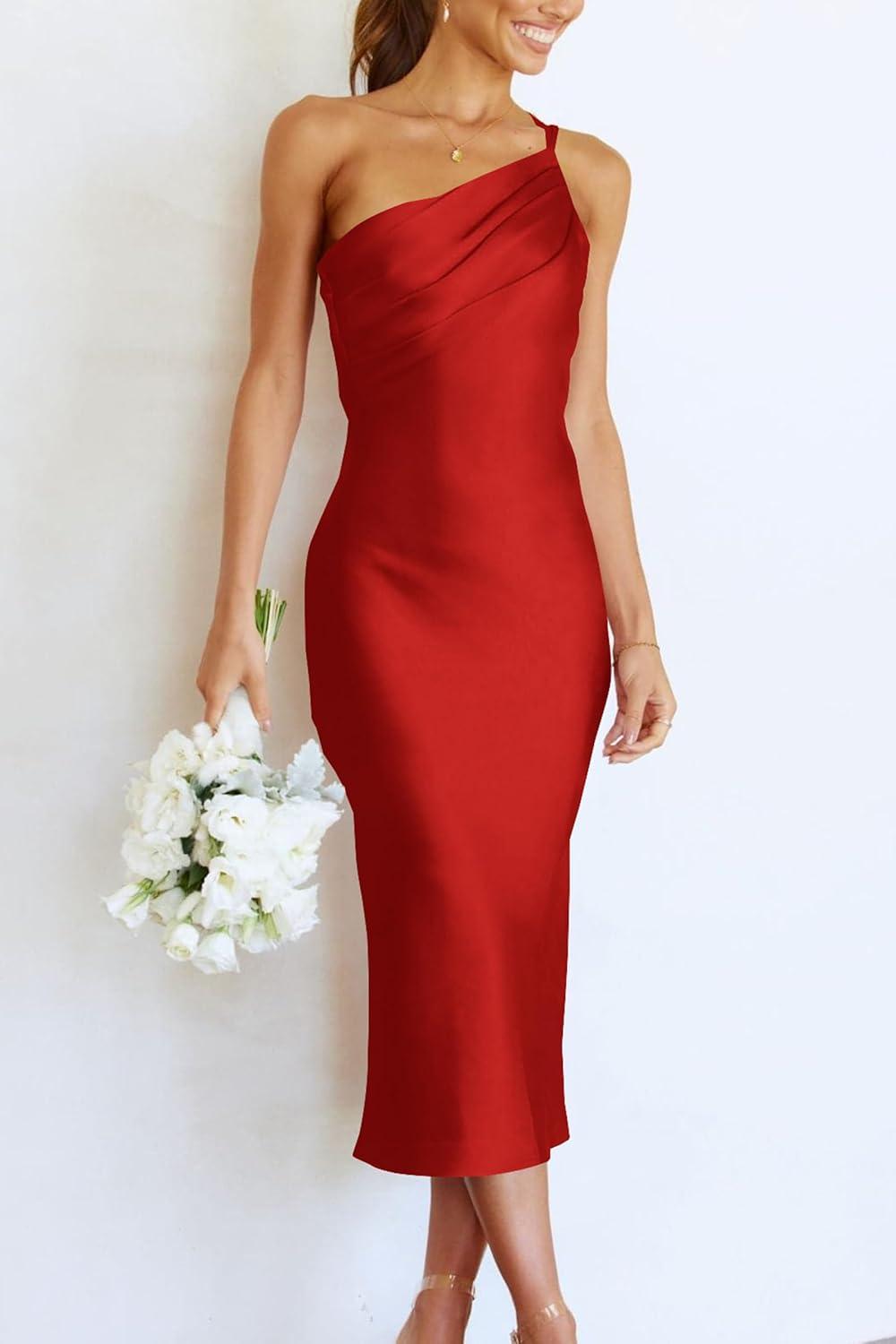 PRETTYGARDEN Women’s Midi Satin Dress One Shoulder Spaghetti Strap Backless Ruched Summer Bodycon Dresses(Red)