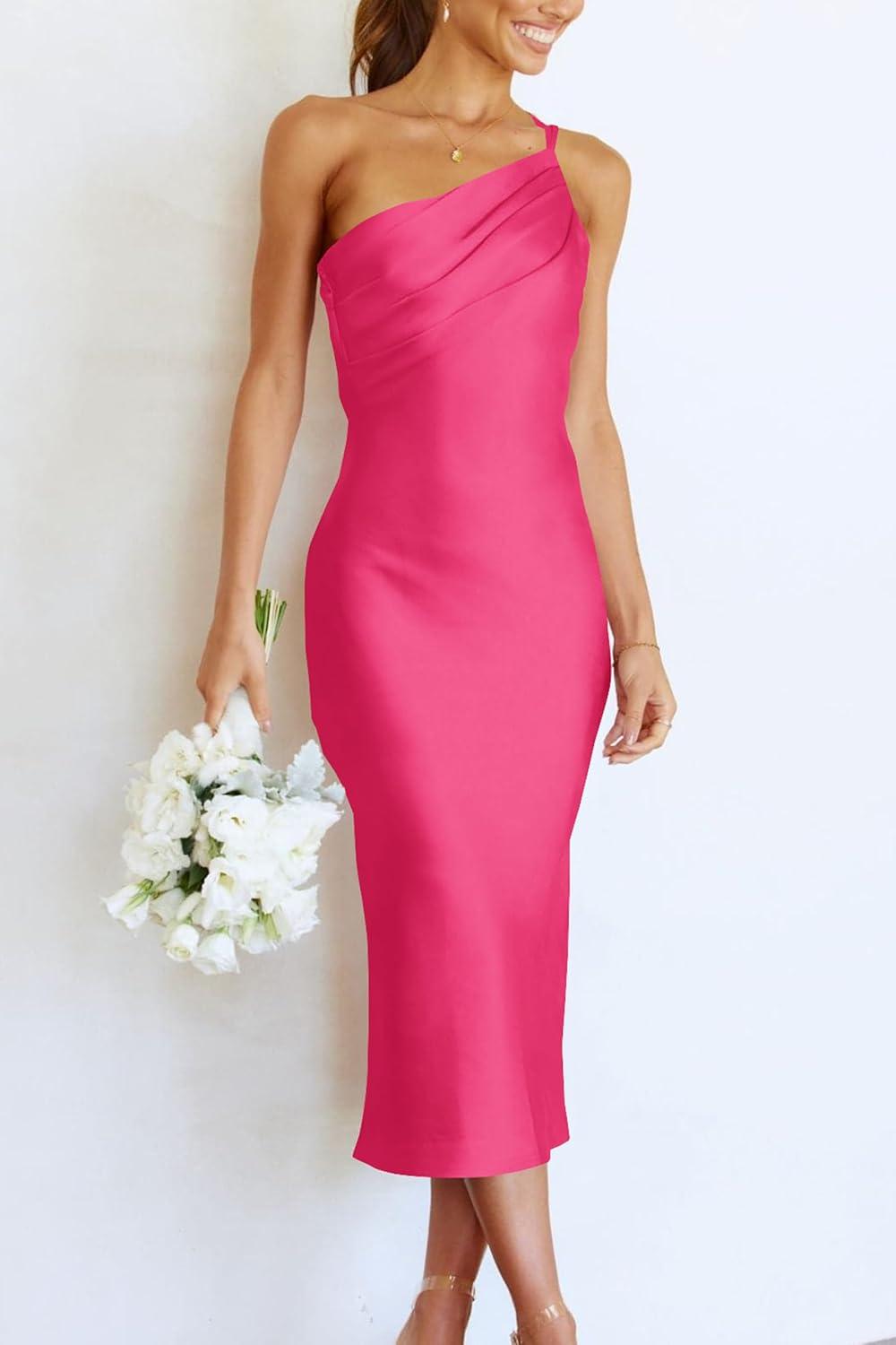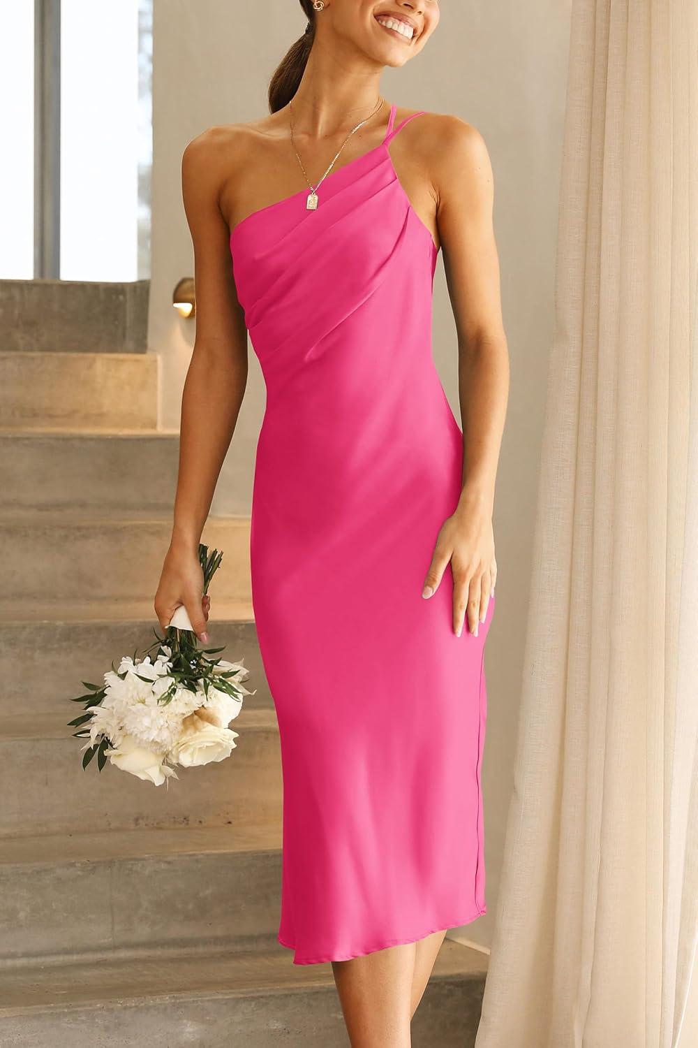 PRETTYGARDEN Women’s Midi Satin Dress One Shoulder Spaghetti Strap Backless Ruched Summer Bodycon Dresses(Rose Red)