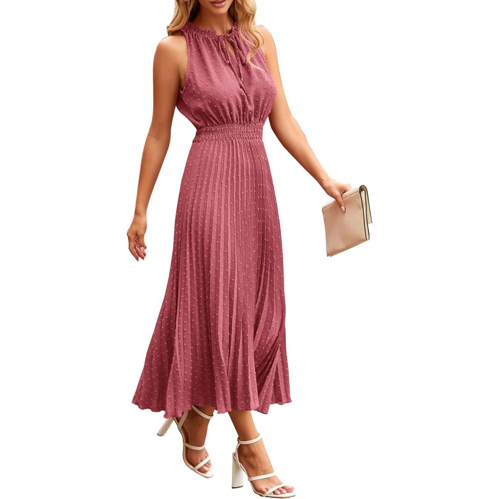 PRETTYGARDEN Women’s Midi Summer Dresses Casual V Neck Swiss Dot Ruffle Sleeveless A Line Beach Sun Dress(Bean Paste Red)