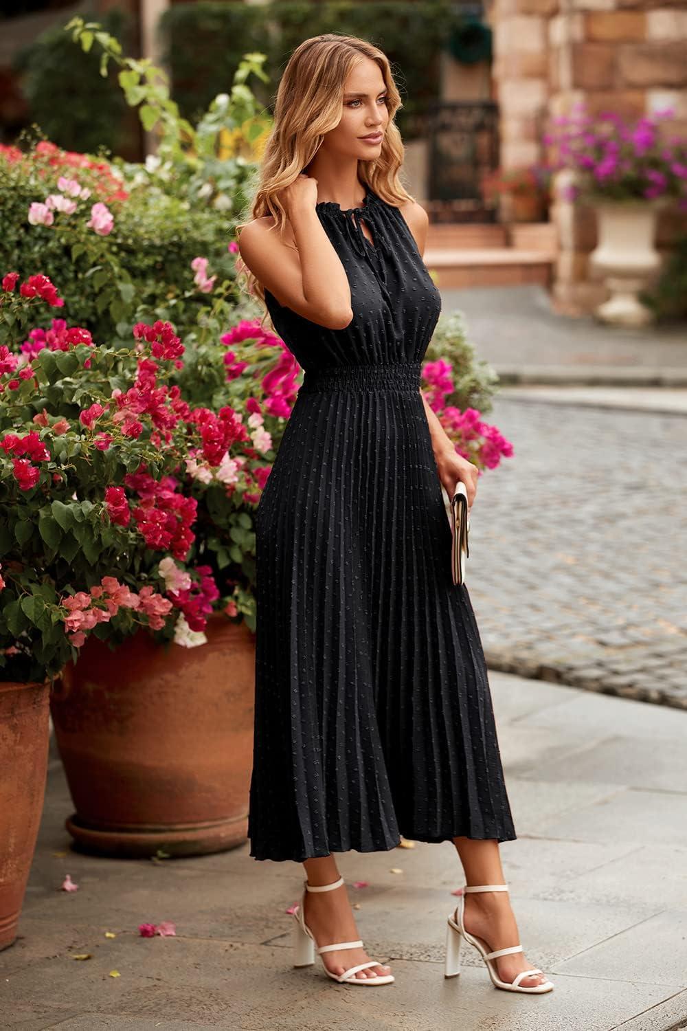 PRETTYGARDEN Women’s Midi Summer Dresses Casual V Neck Swiss Dot Ruffle Sleeveless A Line Beach Sun Dress(Black)