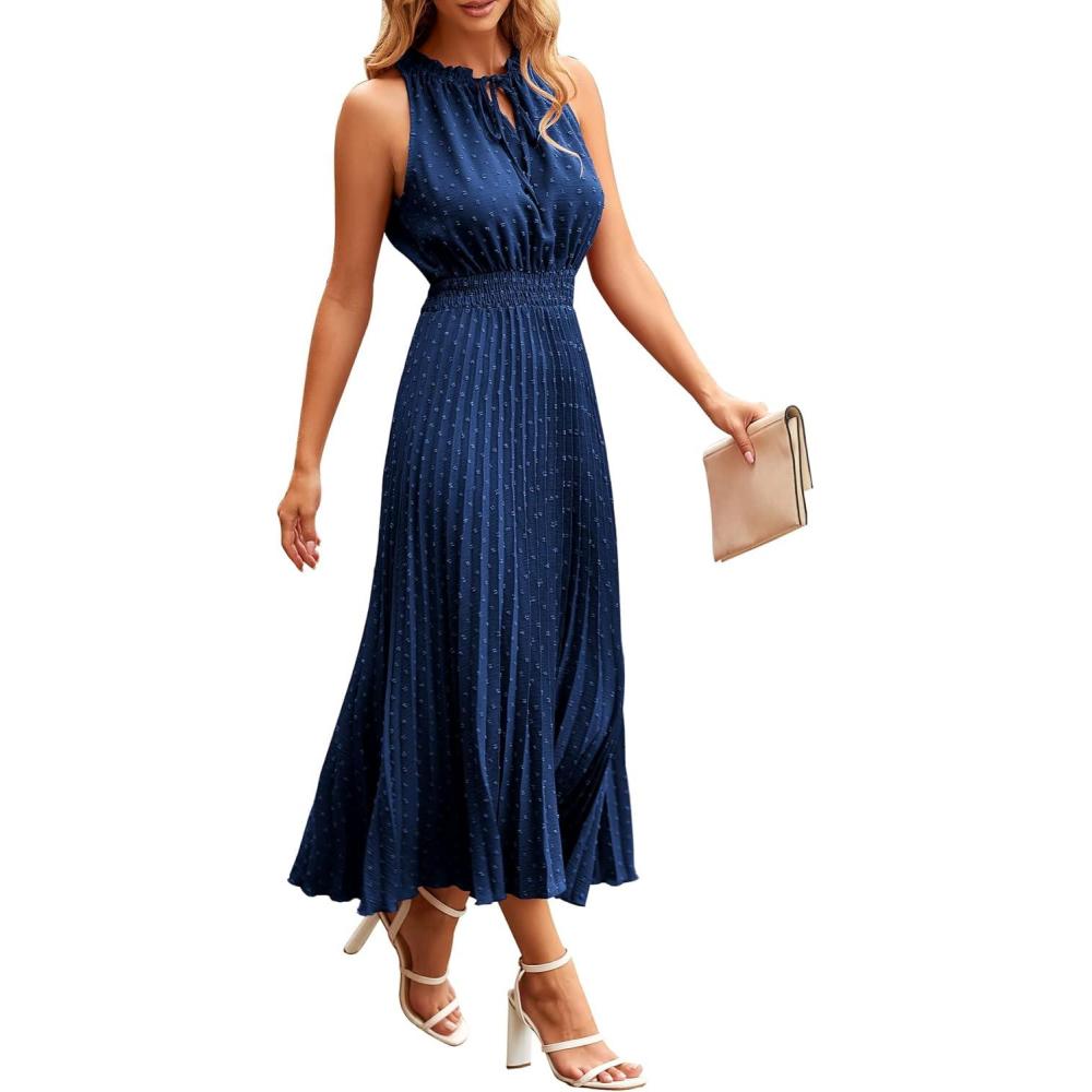 PRETTYGARDEN Women’s Midi Summer Dresses Casual V Neck Swiss Dot Ruffle Sleeveless A Line Beach Sun Dress(Navy)